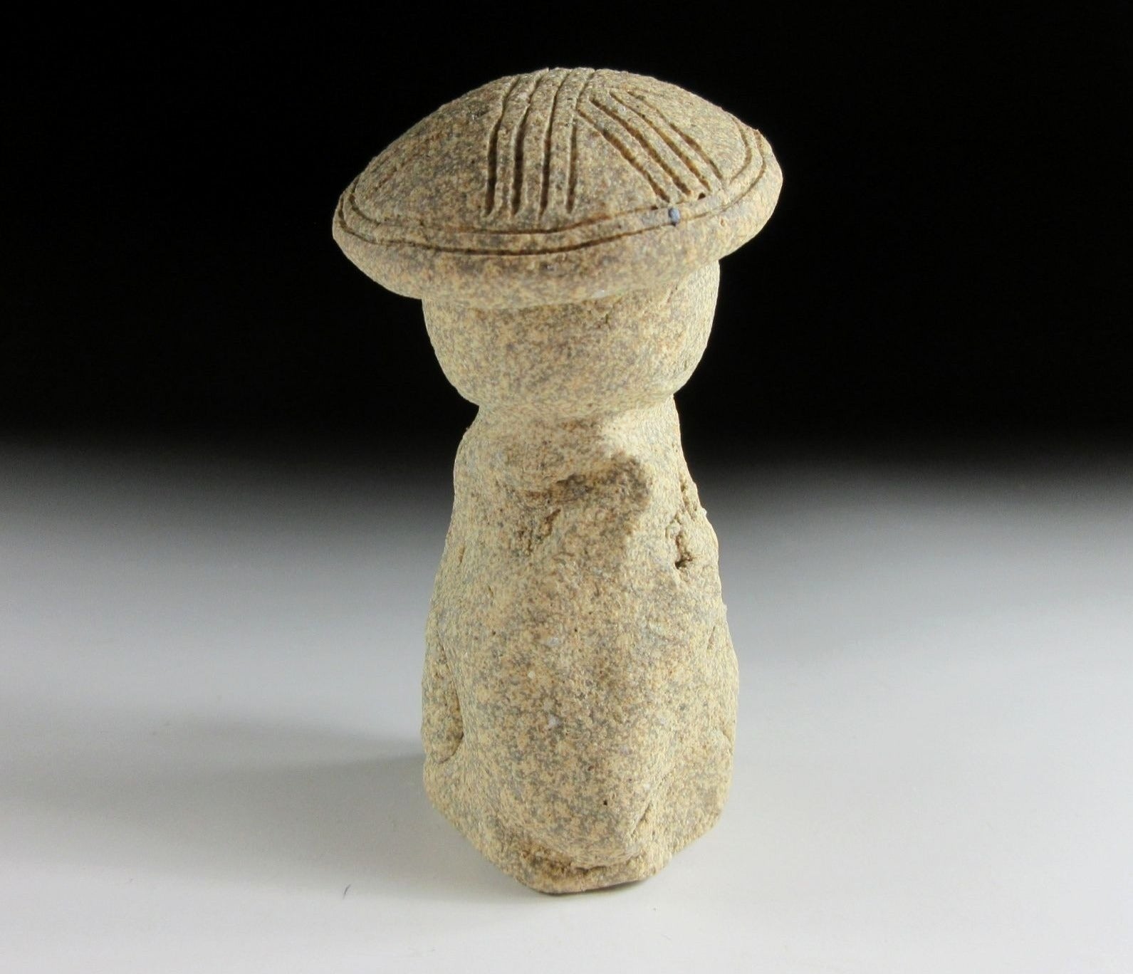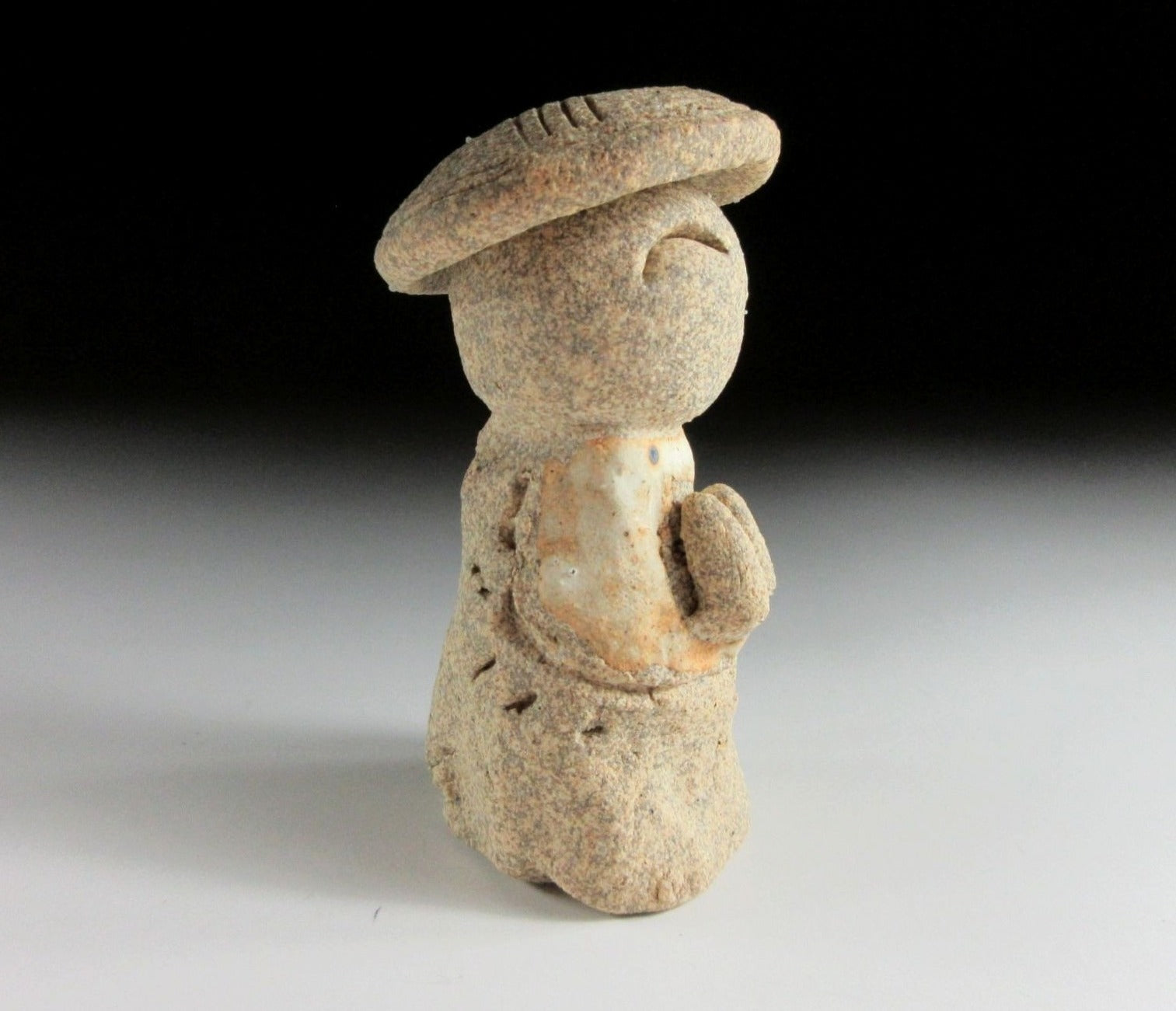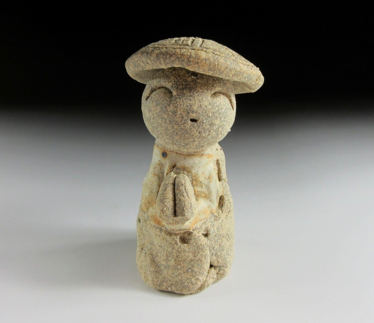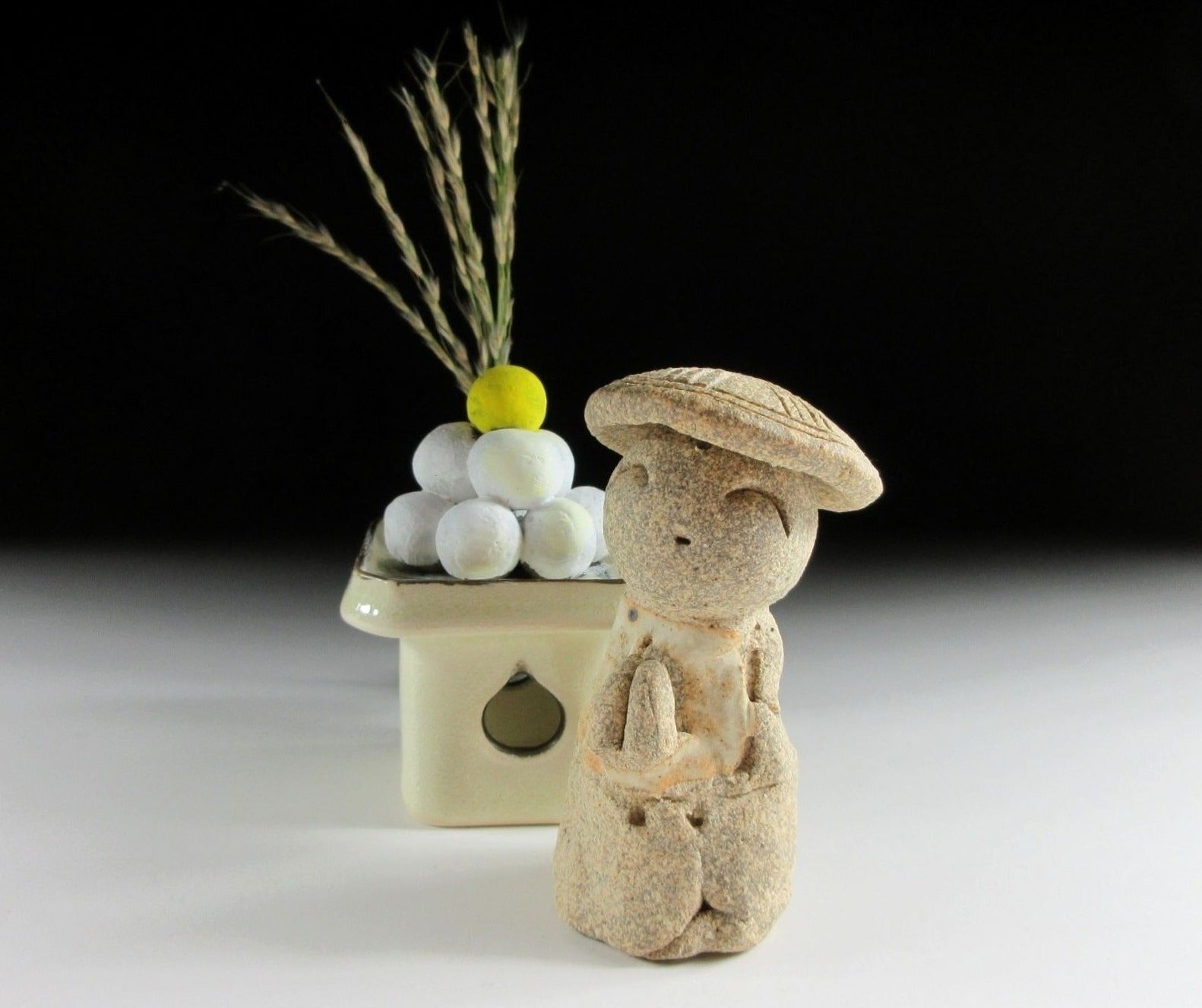 This listing is for a small Shigaraki jizo. It has been hand-shaped and is modelled on the children’s story named Kasajizo. Kasajizo is a story about a poor old hat maker and his wife. It was just before New Year and the old couple were running very low on food. A baby mouse appeared looking for food scraps, so the old man gave the little mouse some of the last rice they had left. To thank the old man the parents of the mouse went out into the snow and gathered some straw so he could make hats. The old couple were so happy for their help, and they all sat down and got to work on making some hats to sell for food. When the hats were finished, the old man set off for town so he could make some money and buy some food for New Year. On the way into town he noticed that the heads of the jizo statues were covered in snow. He felt sorry for them and used his towel to wipe off the snow. After this he continued on into town. The town was busy but nobody wanted to buy a hat from the old man. Night drew near and the people disappeared. Saddened he began to make the journey back home. Just as he was passing the jizo statues he noticed once more that their heads were covered in snow. He felt so sorry for them out in the cold, so he decided to give the straw hats to them for protection. He only had five hats, but there were six jizo. He thought about it and decided to give the other jizo his towel. He wrapped the towel around the jizo’s head and then continued on towards home. The mice were excited to see the empty load, but the old man told them the story. His wife said that he did a good thing by giving the jizo the hats, and prepared some hot water and a few beans for their dinner. Then in the middle of the night they were awoken by voices. The voices were calling out, “New Year’s delivery! New Year’s delivery! Where is the house of the old hat seller!” Everyone was astonished to see the jizo pulling a sleigh laden with food for the New Year. One jizo piped up and said, “Old man, thank you very much for the hats. We leave this food in return for your kindness.” Then off they went. The next day the old man set off with a load of mochi and special New Year food for the jizo. He set down the food and said, “Jizo sama, I can now make an offering to you - Happy New Year!”
