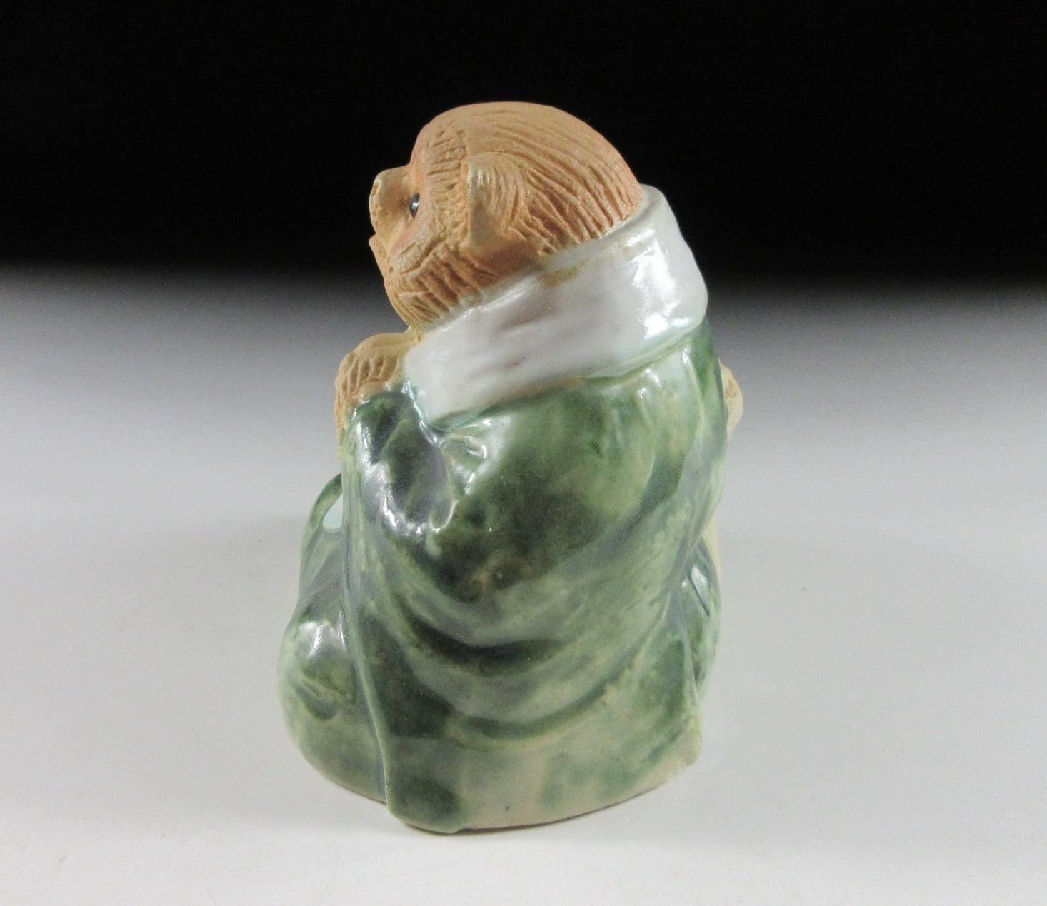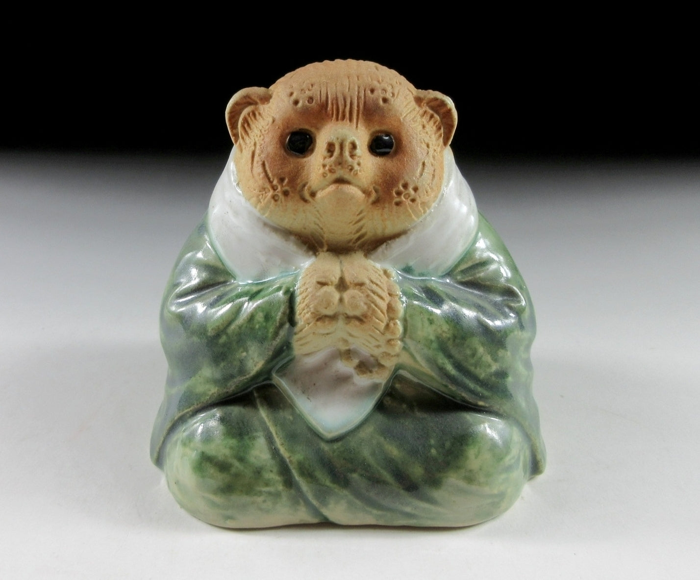 This listing is for a SMALL Shigaraki-ware okimono made around 20 years ago. It is made of high-fired stoneware slip and is moulded to resemble a tanuki dressed as a monk. His robes are white and green and he’s holding prayer beads in his hands. These types of tanuki are sold as amulets and are thought to bring good luck. Please check the size carefully before ordering.