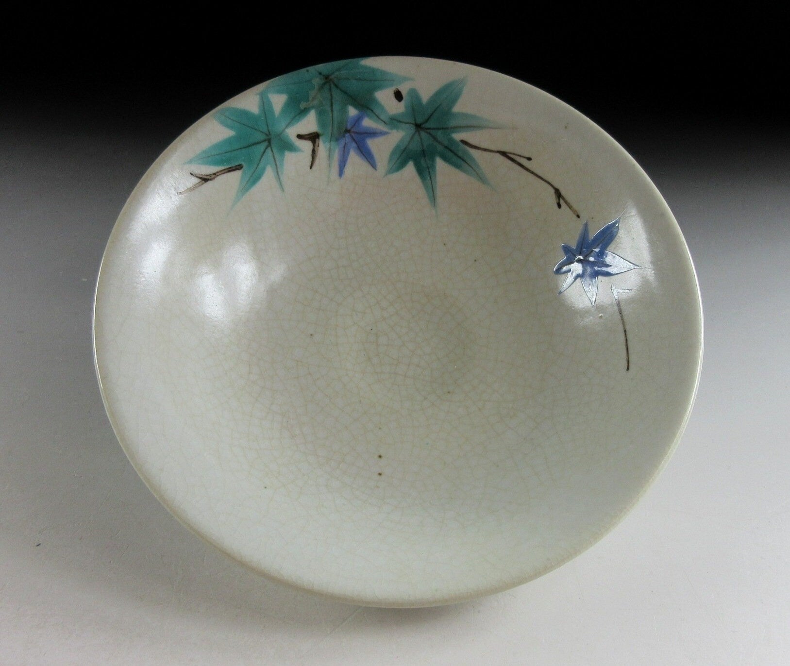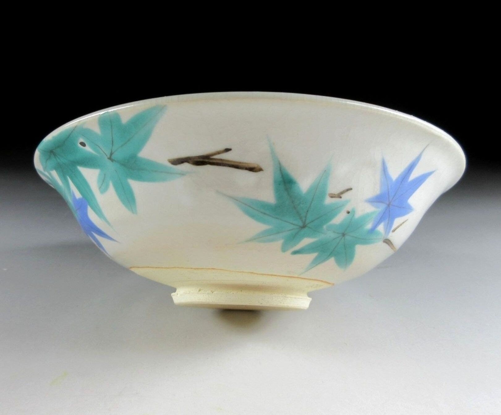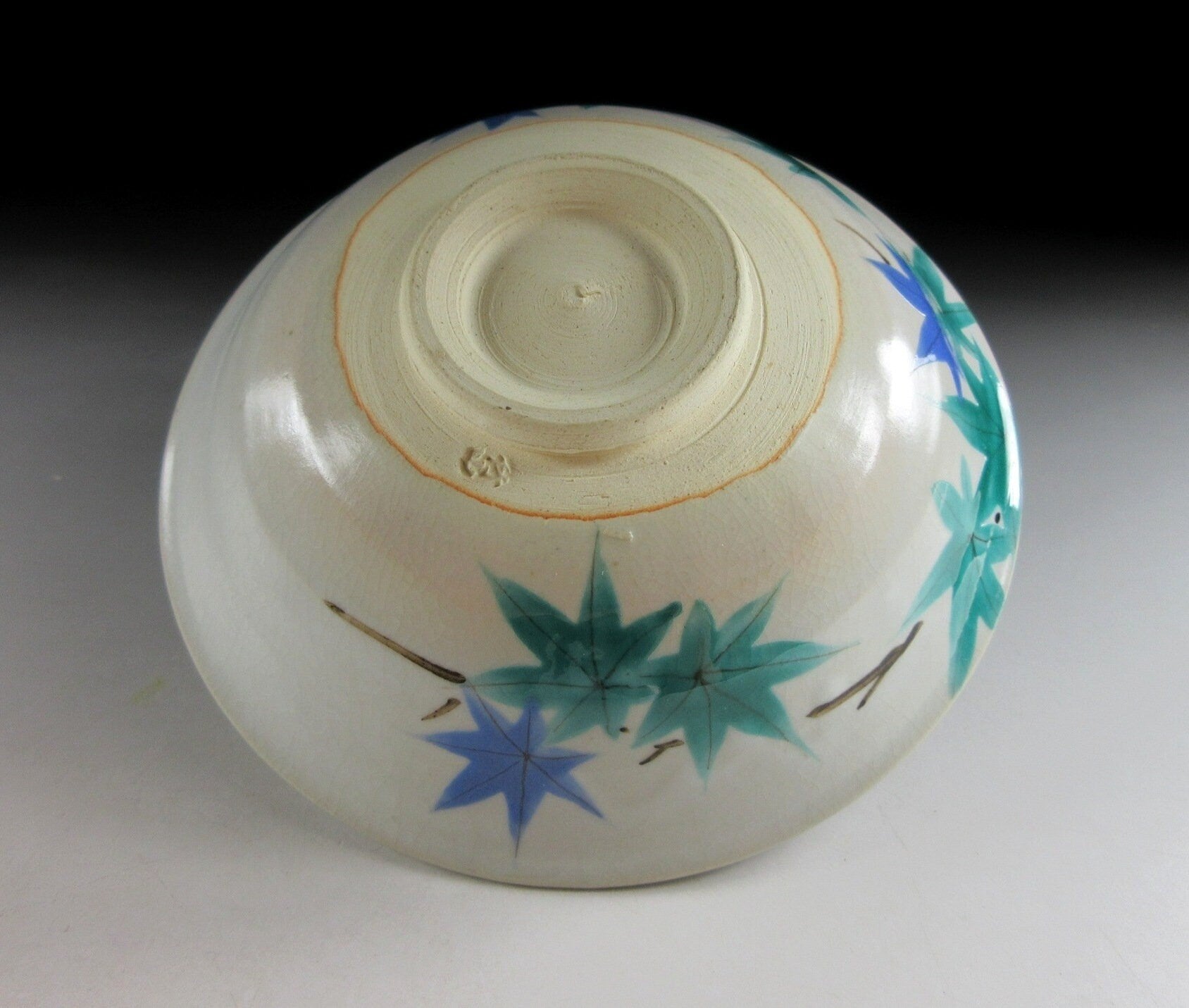 This listing is for a small Kyo-ware hira chawan made around 40 years ago and signed ‘Takeyama’. It is wheel-thrown and the flat hira type used during the summer season. Hira chawan are shallow bowls with low sides designed to cool tea down faster. Also Kyo-ware potters tend to put more focus on decorating the interior, as this part is readily seen by the tea drinker. The bowl in this listing is decorated with hand-painted green and blue Kaede maple leaves over a white glazed base. The stamp of the potter can be found on the bottom, sorry no box.