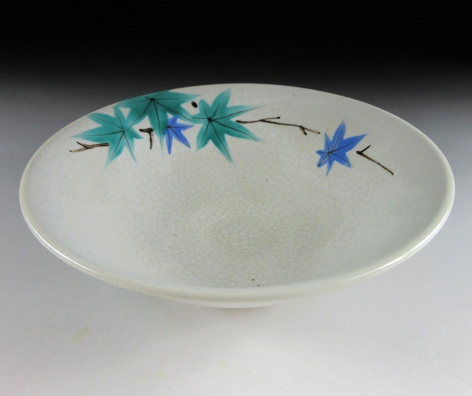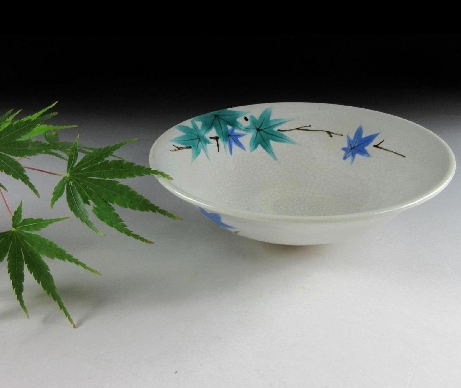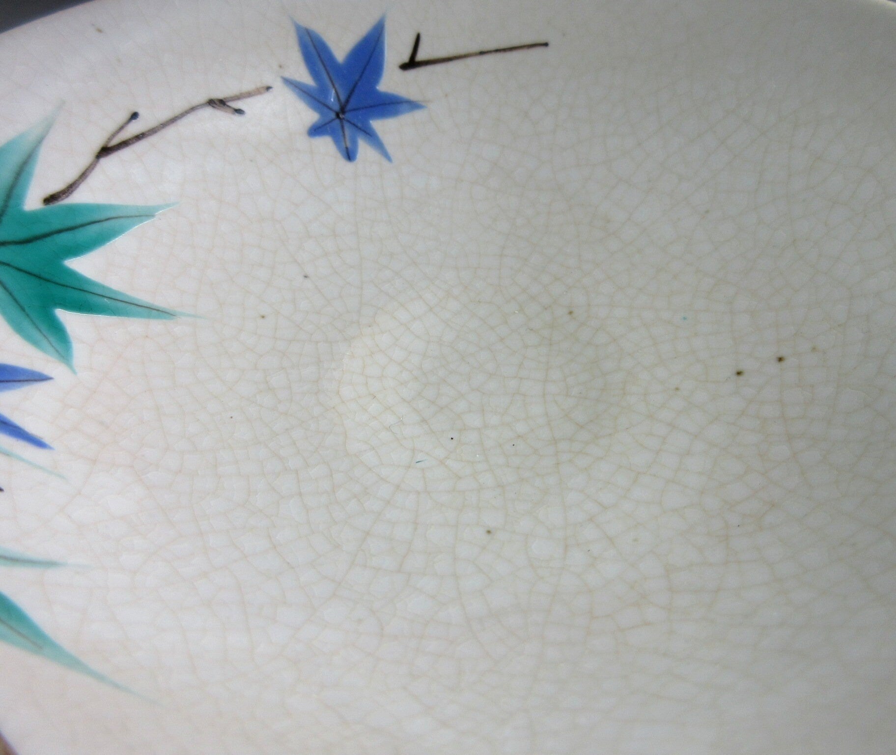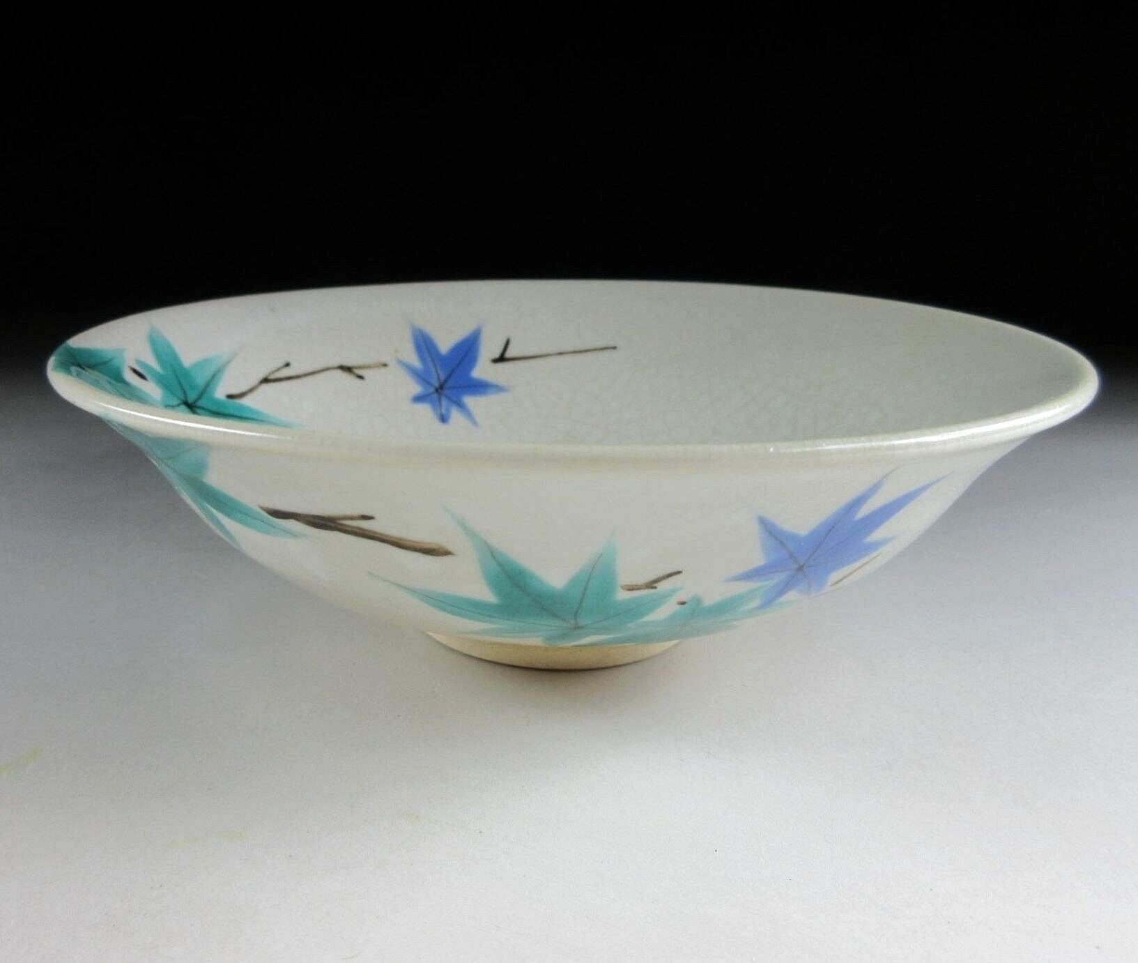 This listing is for a small Kyo-ware hira chawan made around 40 years ago and signed ‘Takeyama’. It is wheel-thrown and the flat hira type used during the summer season. Hira chawan are shallow bowls with low sides designed to cool tea down faster. Also Kyo-ware potters tend to put more focus on decorating the interior, as this part is readily seen by the tea drinker. The bowl in this listing is decorated with hand-painted green and blue Kaede maple leaves over a white glazed base. The stamp of the potter can be found on the bottom, sorry no box.