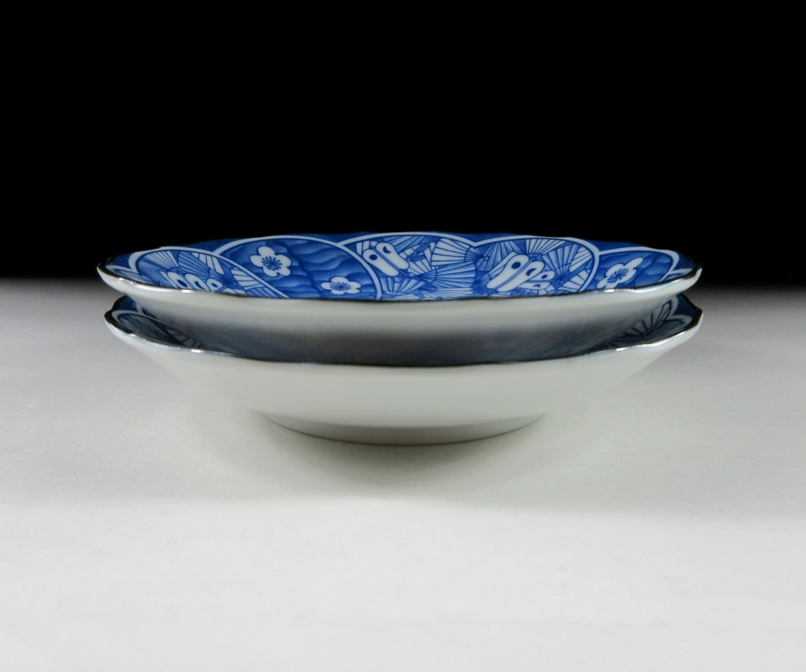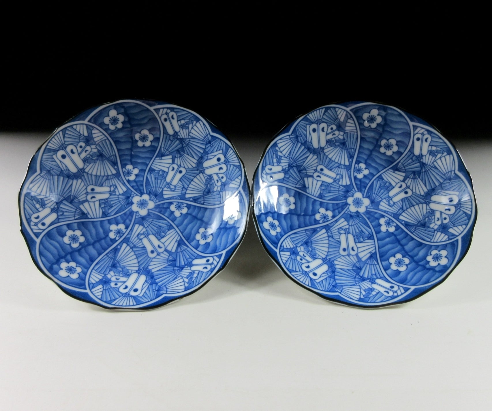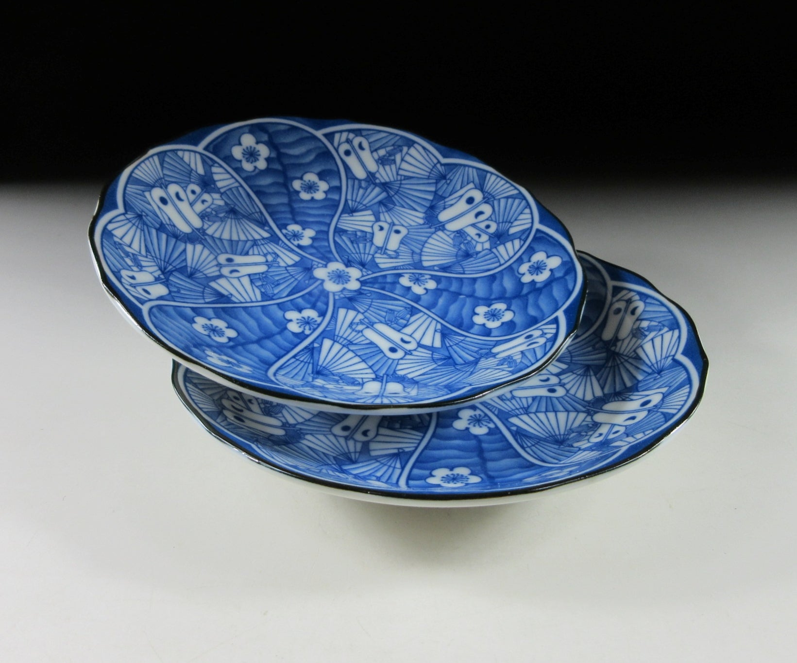 This listing is for a pair of sumo themed Arita-ware plates made around 10 years ago. They are made of porcelain and decorated with folding fans and gunbai. Long ago gunbai served as military leader’s fans, however these days they are used by sumo referees. The plates are also painted to resemble a blossom and have been decorated using a stencil.