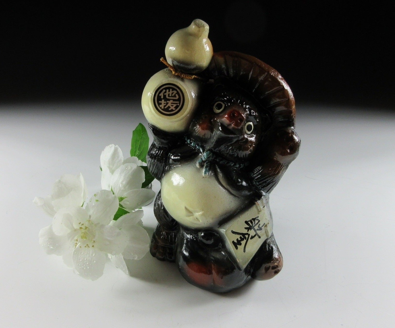 Tanuki are generally considered to bring good luck and are characterized as having eight traits. The straw hat protects against trouble, the big eyes are for surveying the environment and making good decisions, the sake bottle symbolizes virtue, the big tail provides stability and strength, the very large testicles symbolize financial luck and big sacks of money, the promissory note signifies trust, the large belly indicates the ability to make good decisions under pressure, and finally they are friendly with a warm smile.