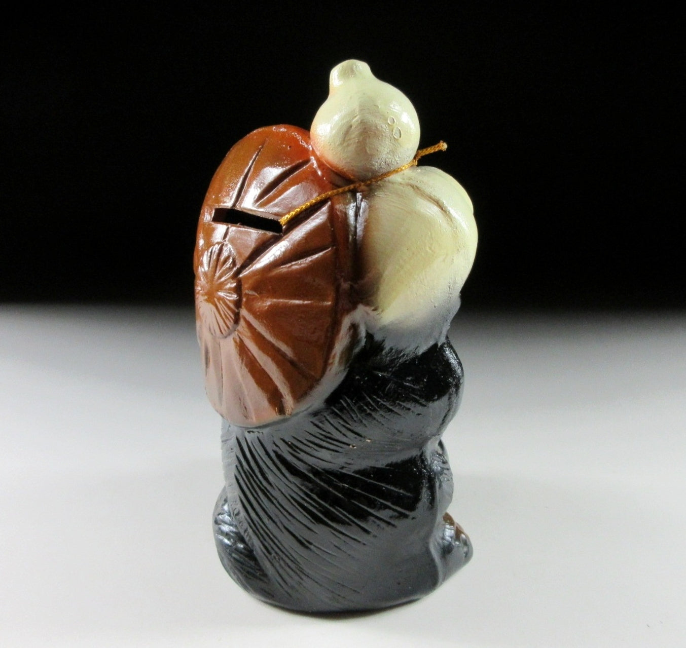 This listing is for a small tanuki made around 40 years ago. It was made from a slip mould and has a small slot on the back for inserting coins. Originally it would have has a rubber stopper, however this is long gone and the bottom has been taped over with black tape. This piece is perfect for popping on a shelf, or for those who have a soft spot for tanuki.