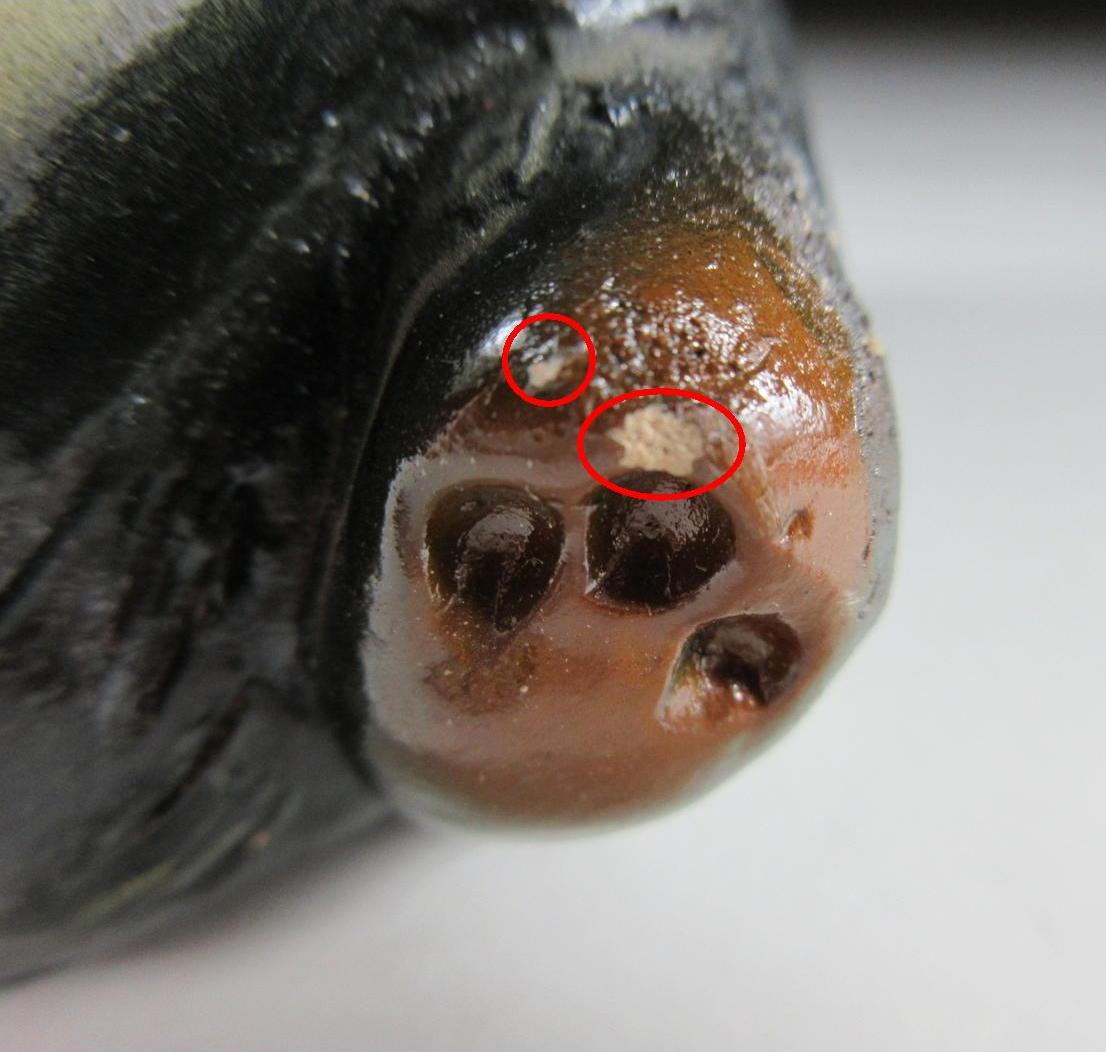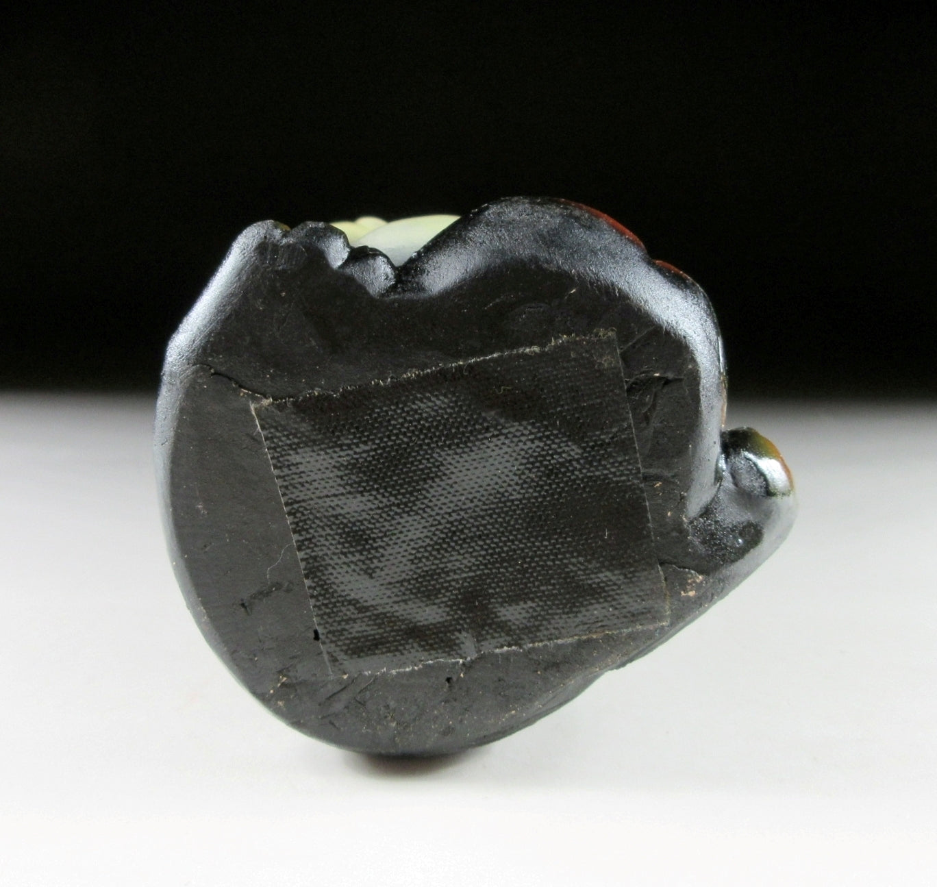 It’s in pretty good condition aside from the bottom being taped over where a rubber stopper what have been, and there are a few spots of chipped glaze (please refer to the last photo). Due to the tape and missing stopper, this piece is being sold as an ornament, not as a functioning moneybox.