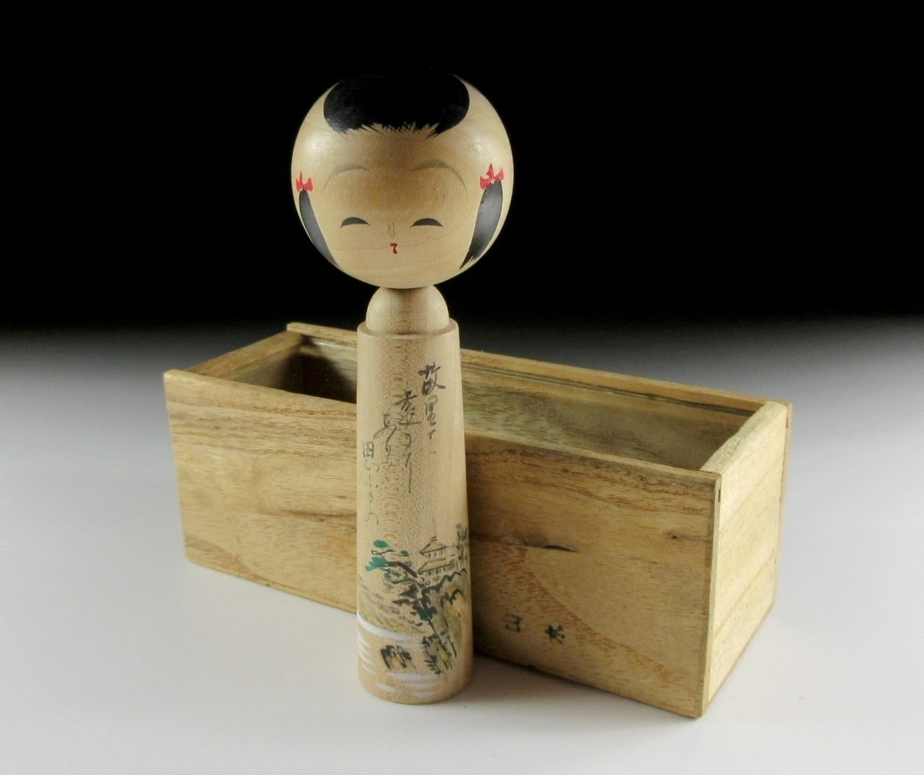 This listing is for a small vintage kokeshi doll made about 30-40 years ago. The front is decorated with what appears to be a temple along with a short poem written in a classical style. The writing on the back reads as ‘Atami Hot Springs’ so this little doll was most likely purchased as a souvenir. She comes with a small wooden storage box with glass lid.