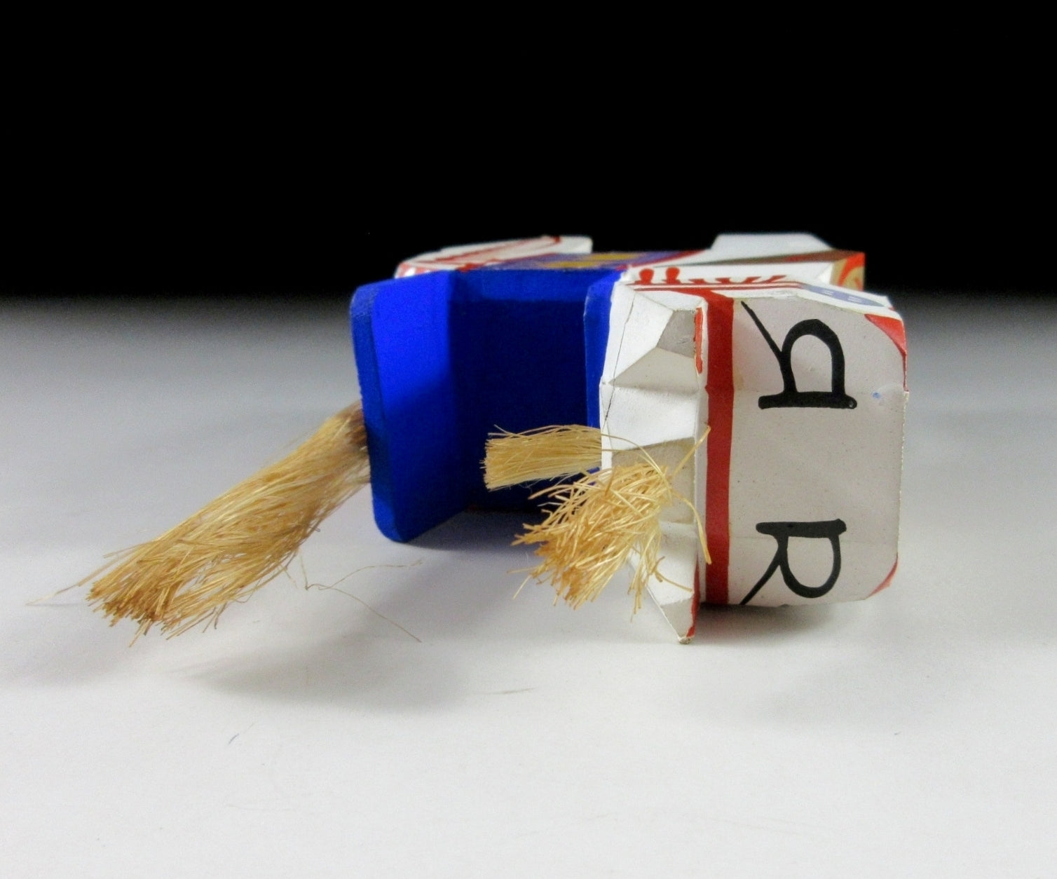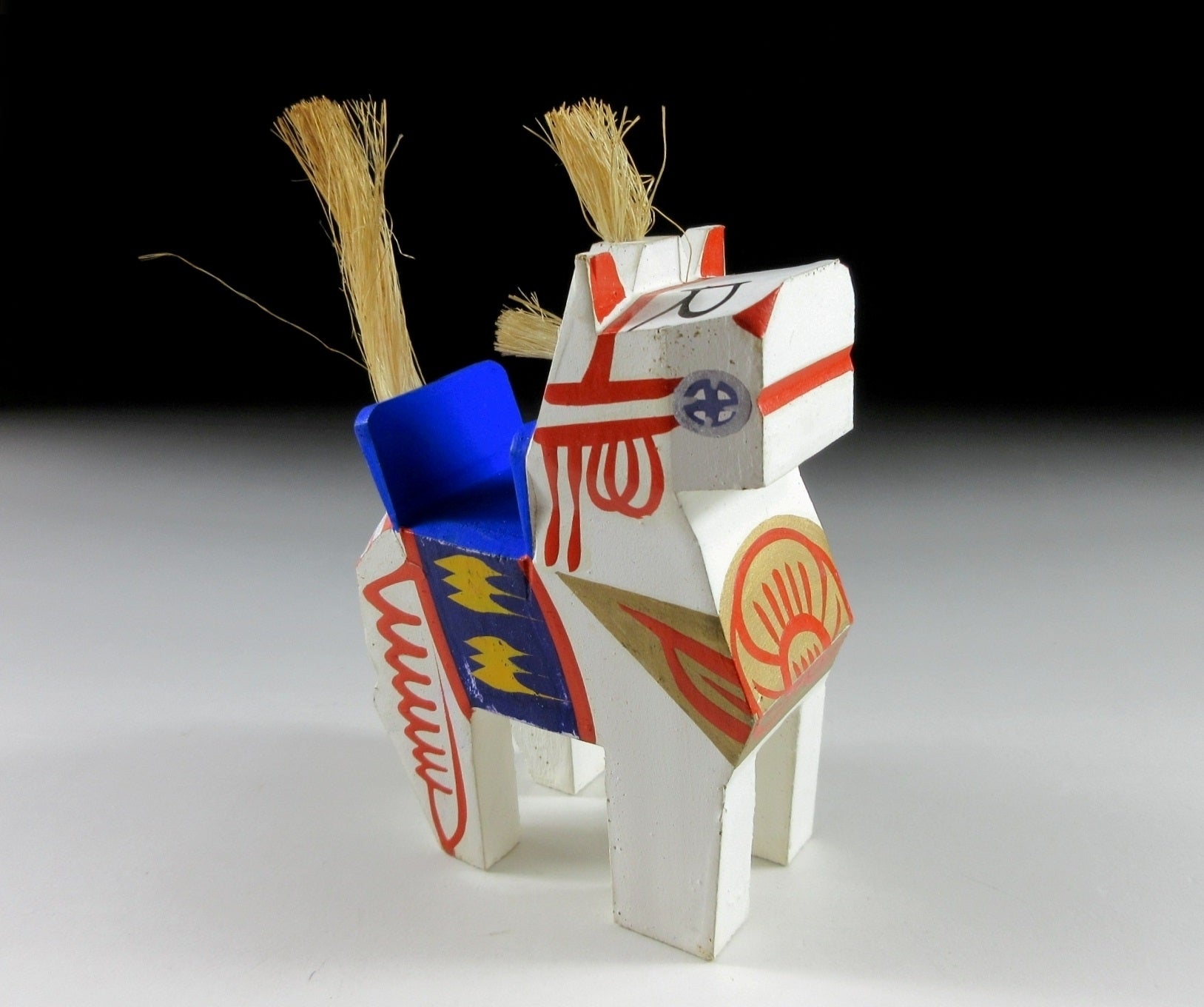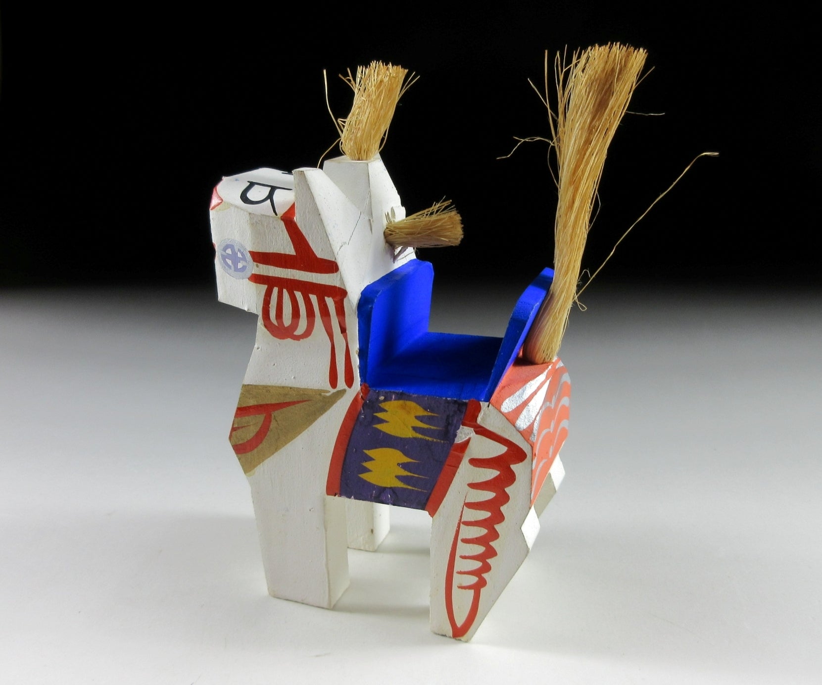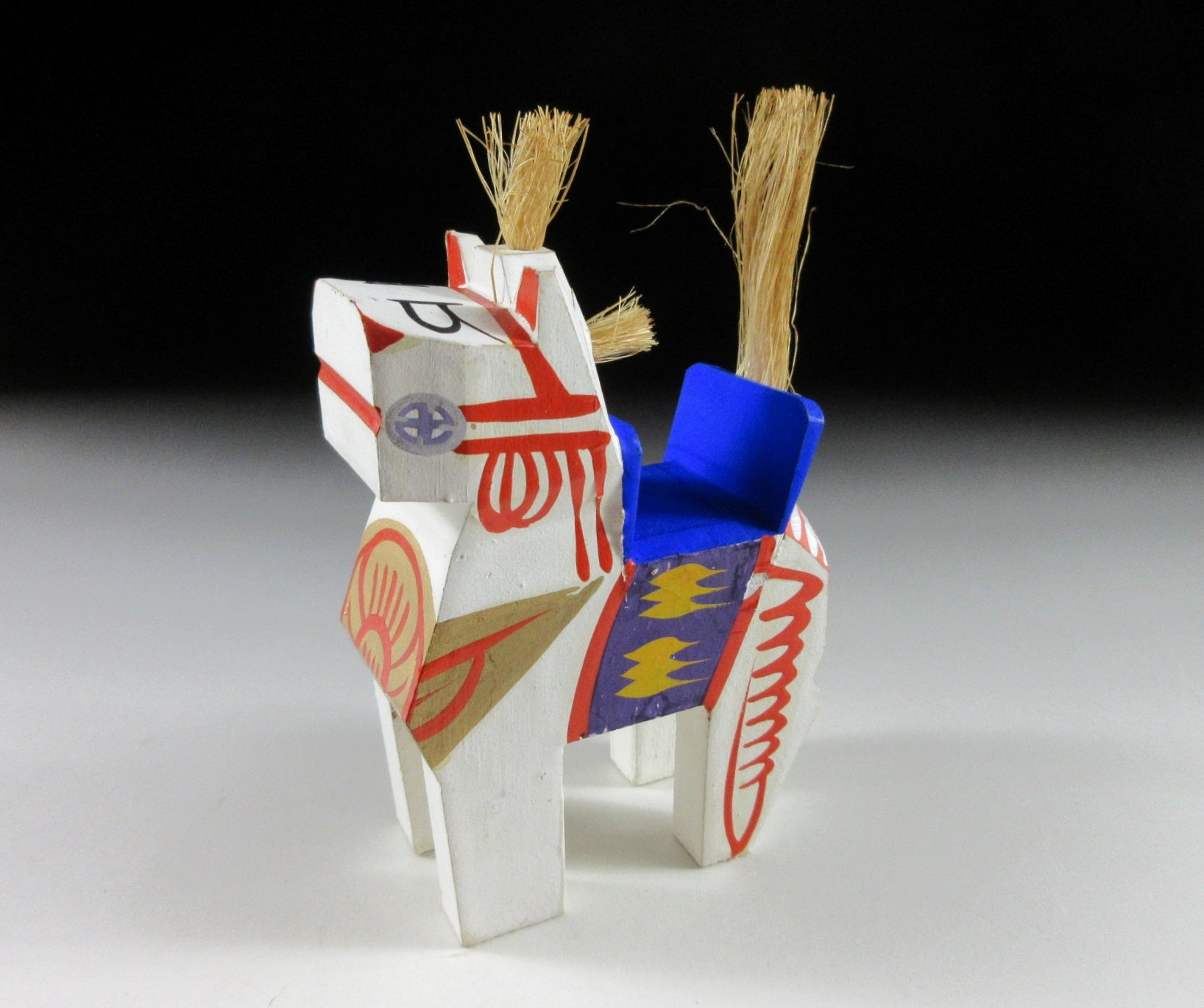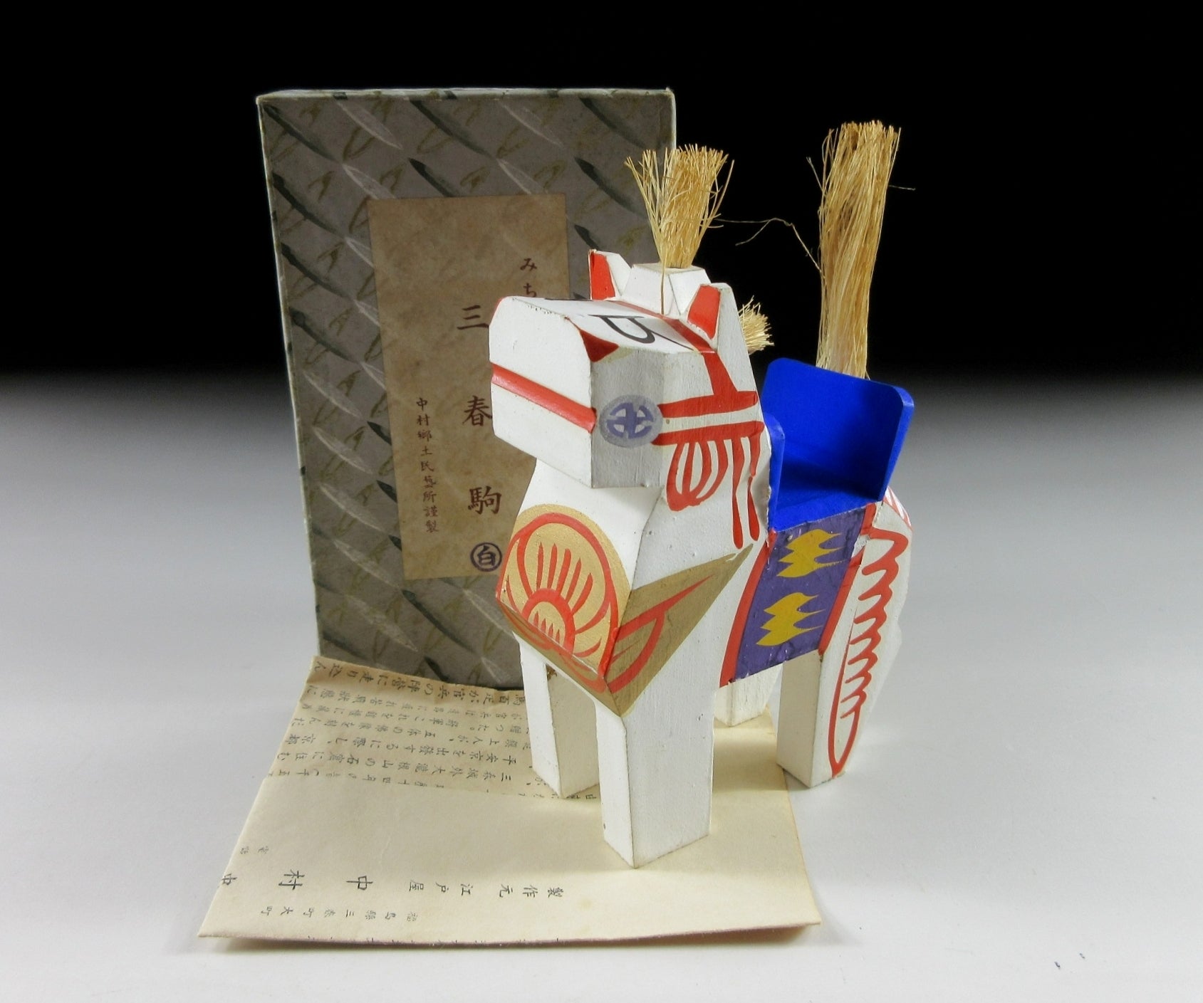 This listing is for a very small Miharu-goma wooden horse dated Showa 33 (1958). Miharu-goma are brightly coloured wooden horses from Fukushima. They are angular in shape and feature red, blue and yellow decorations hand-painted onto the body. The mane and tail are made from coarse hemp fibre, and Miharu-goma are generally black or white in colour. It is said that the origin of Miharu-goma is based on a legend about 100 wooden horses that suddenly appeared and helped Heian shogun Sakanoue no Tamuramaro succeed in battle. The little horse in this listing comes with a Japanese language profile paper about Miharu-goma, and its original paper storage box. The handwriting on the bottom of the box reads as ‘Showa 33 (1958) Yadake Onsen sounvenir’.