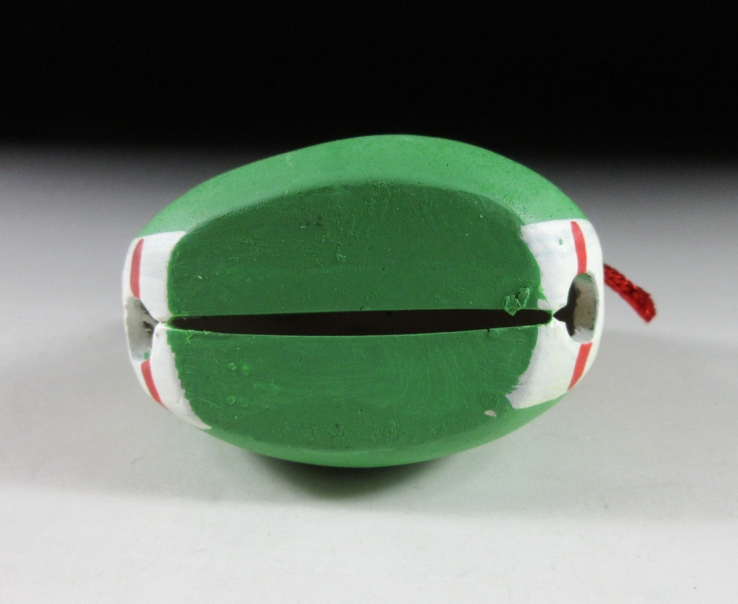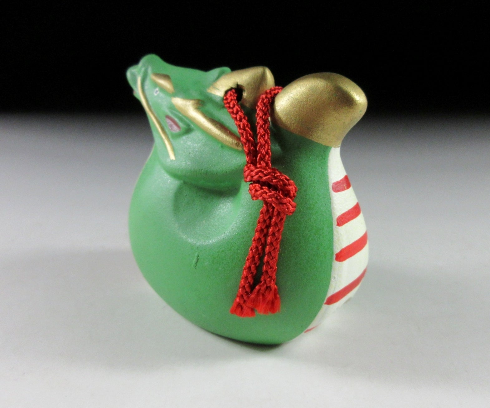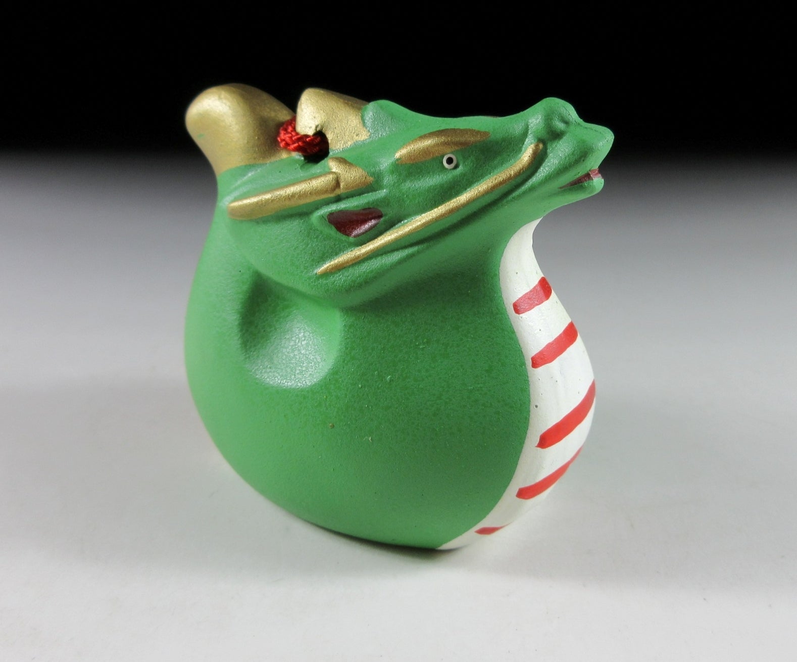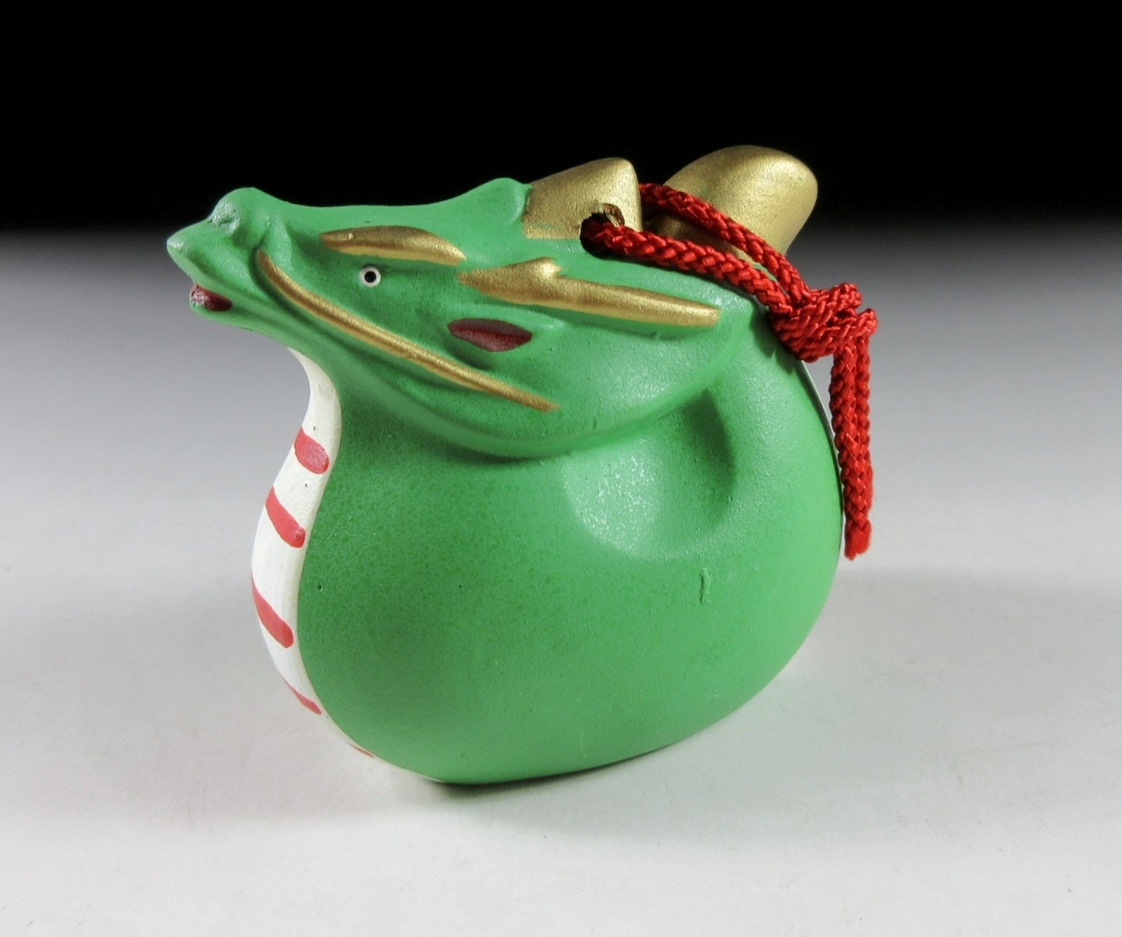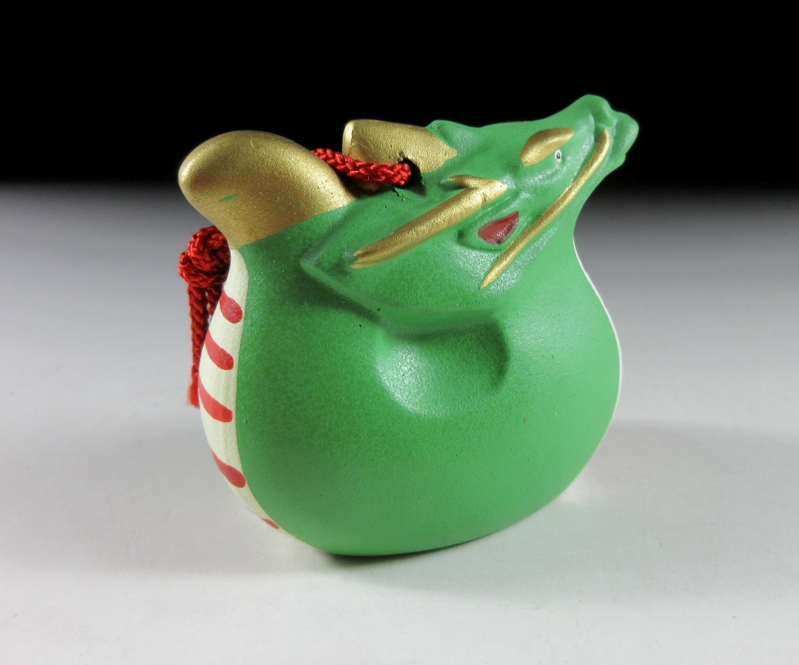 This listing is for a cute little dragon bell made around 12 years ago. It is made of earthenware and painted with green gesso, and trimmed with gold, red and white on the horns, whiskers and belly. The bell has a small loop and red string attached to the top to enable easy handling. It was most likely made to commemorate the Year of the Dragon back in 2012.