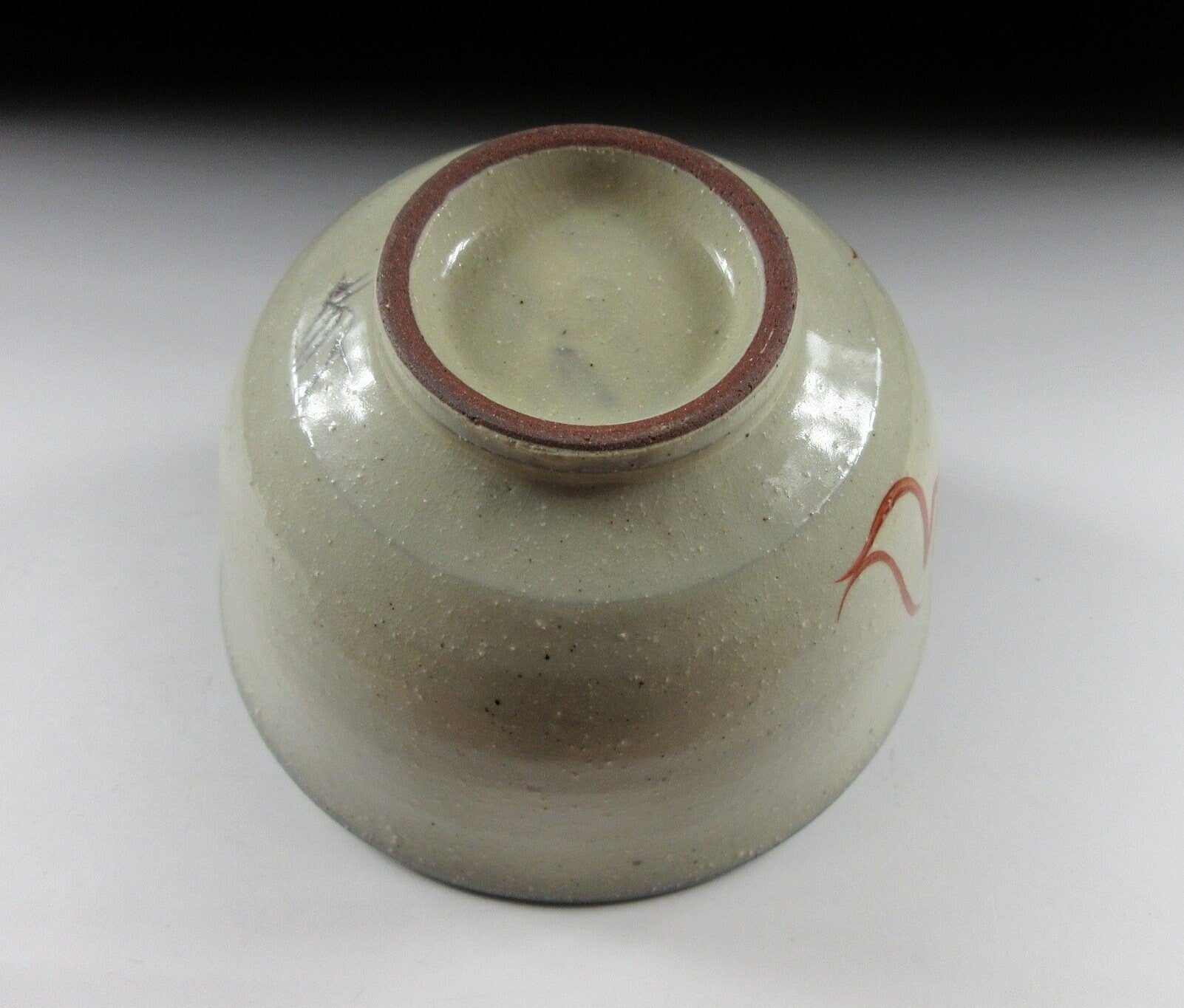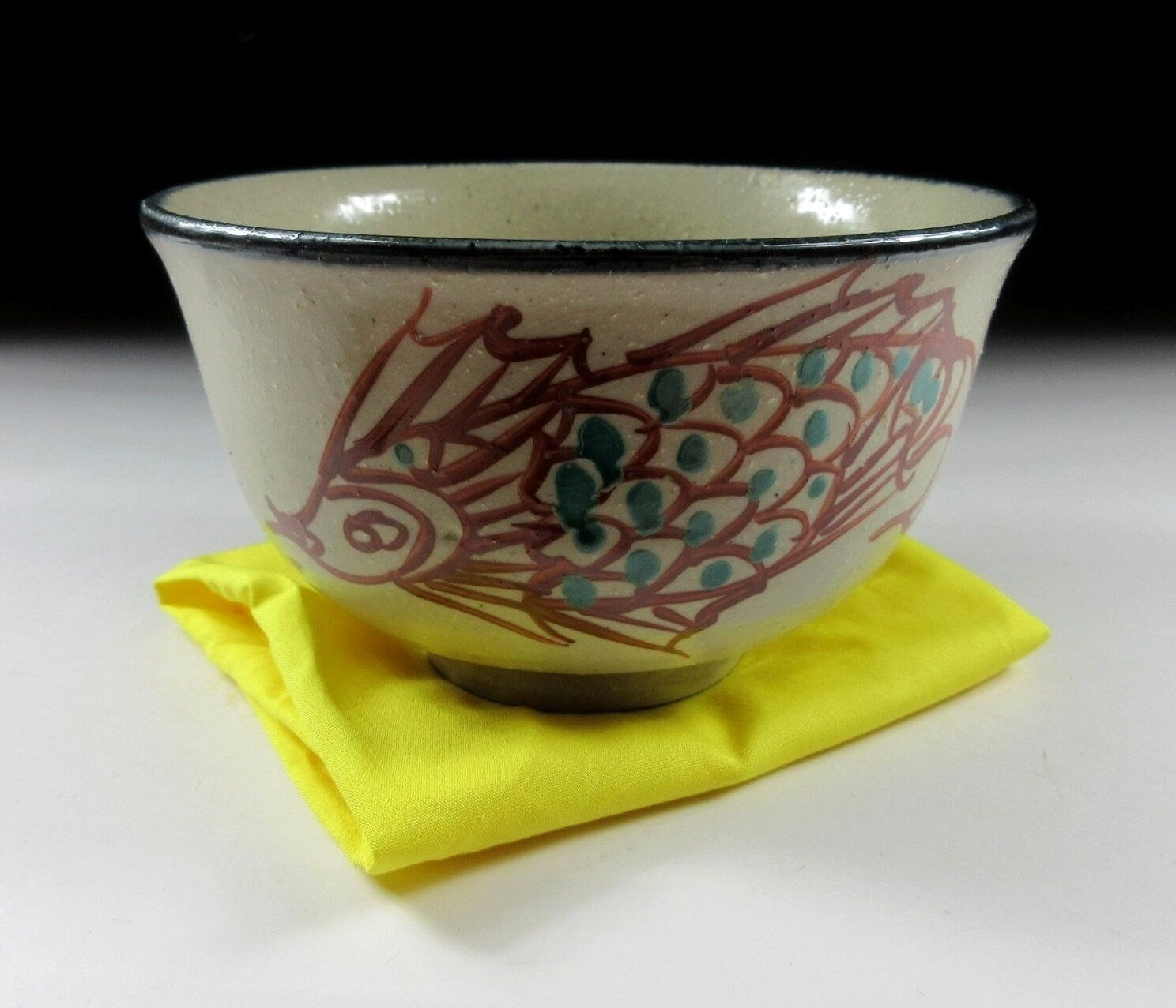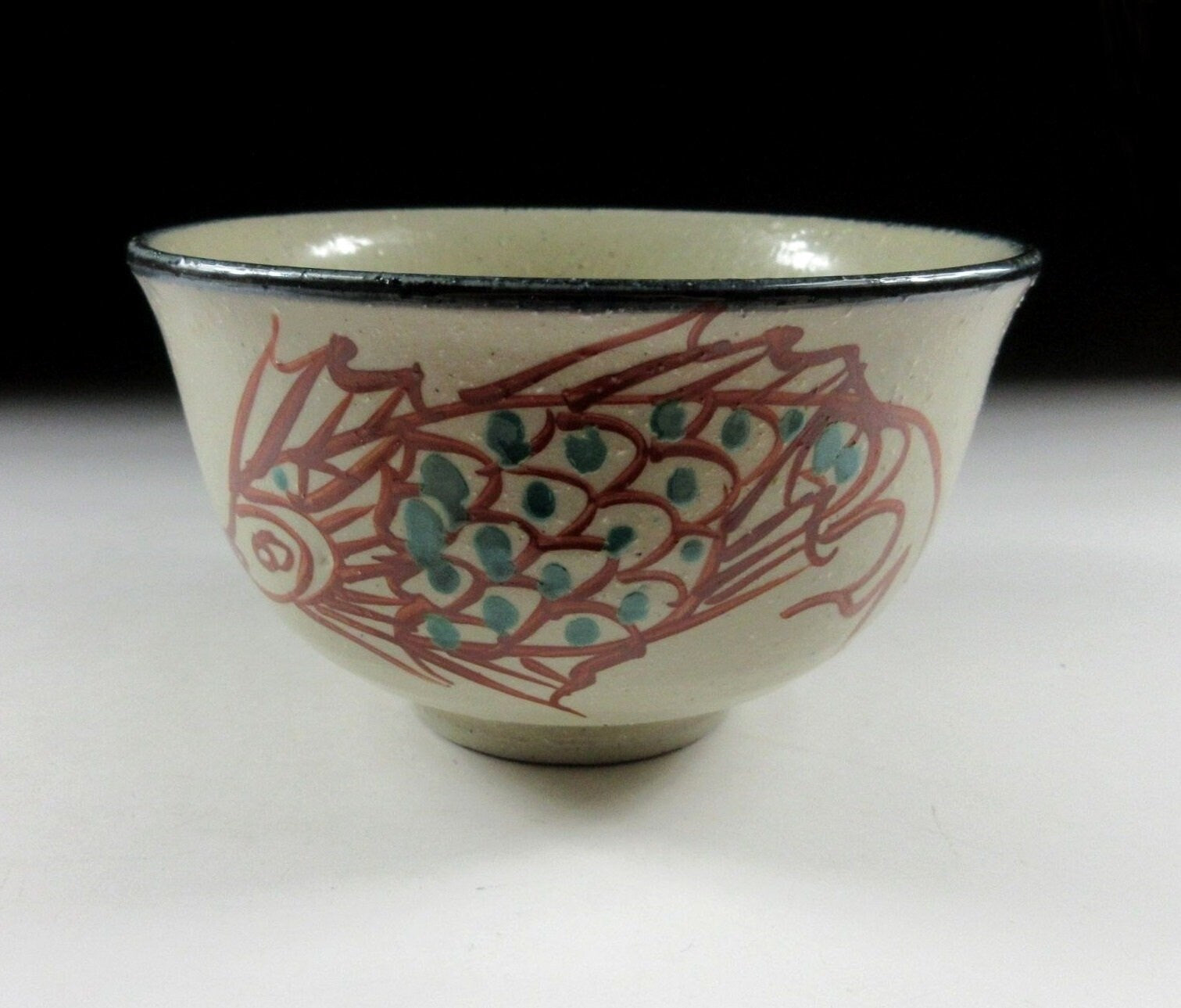 This listing is for an Okinawan Yomitan Tsuboya-ware chawan made by Soma Masakazu from Toushin Gama. It is wheel-thrown and decorated with a hand-painted fish motif using the complementary colour scheme of red and green. The rim of the bowl has been trimmed with dark bluish-black glaze. The signature of the potter can be found on the bottom, and it comes with a yellow wrapping cloth for when the item is not in use. It also comes with a Japanese language profile about the potter. *PLEASE NOTE THAT THE CHASHAKU IS NOT INCLUDED.