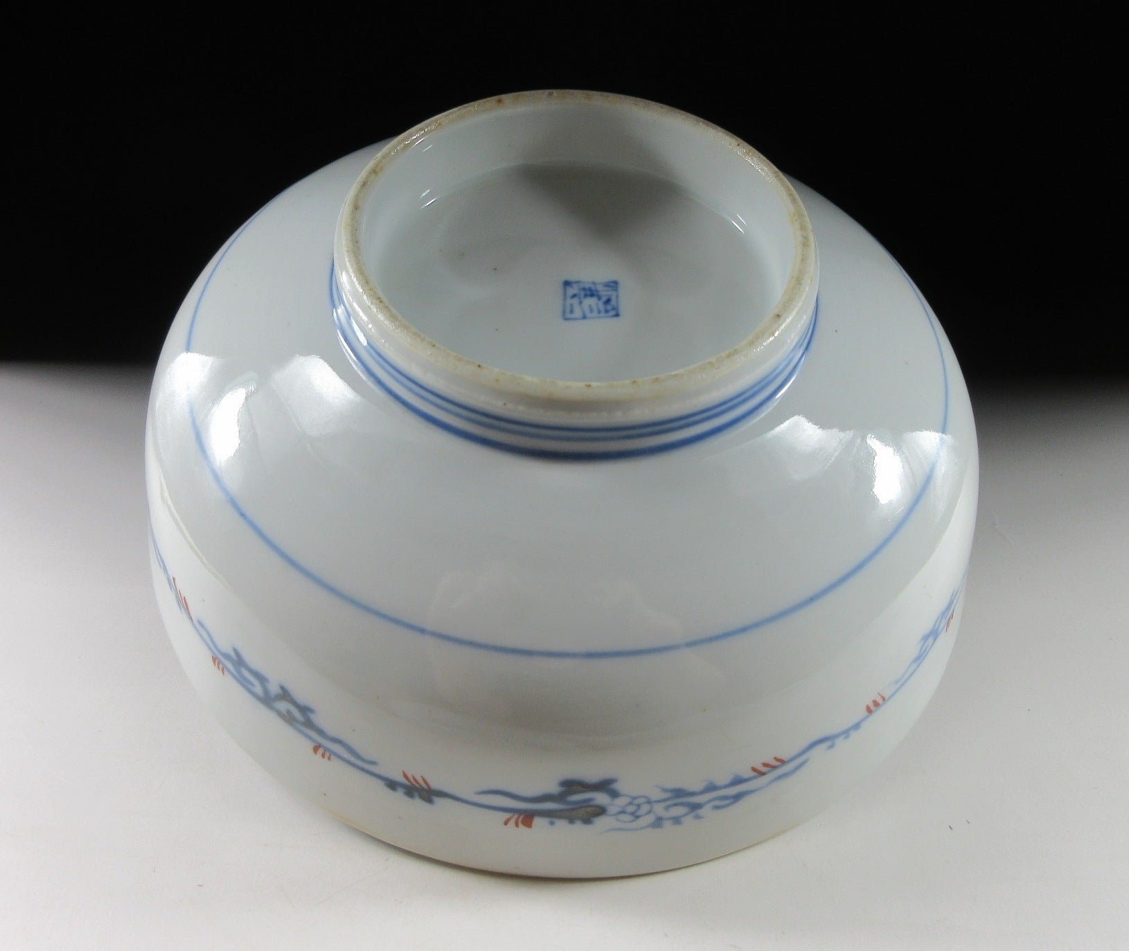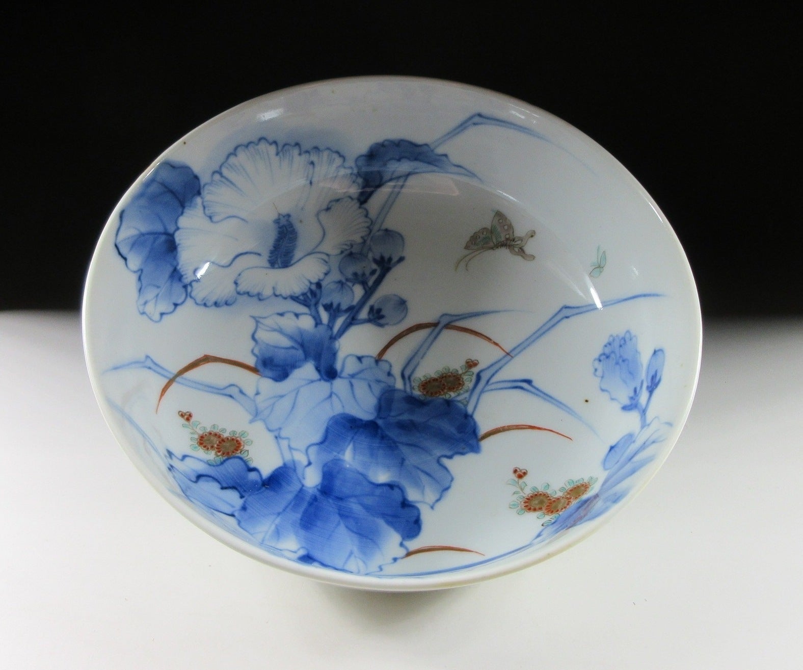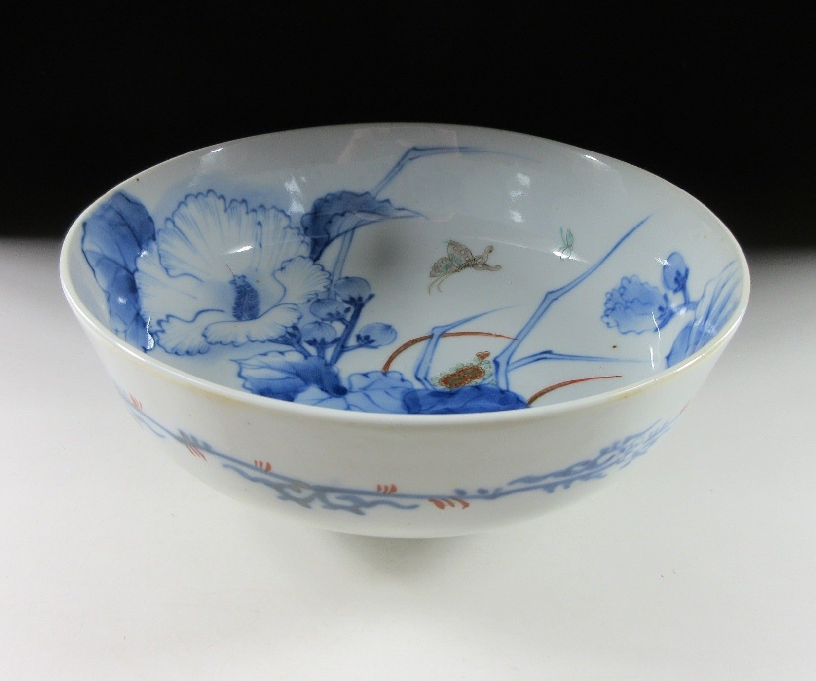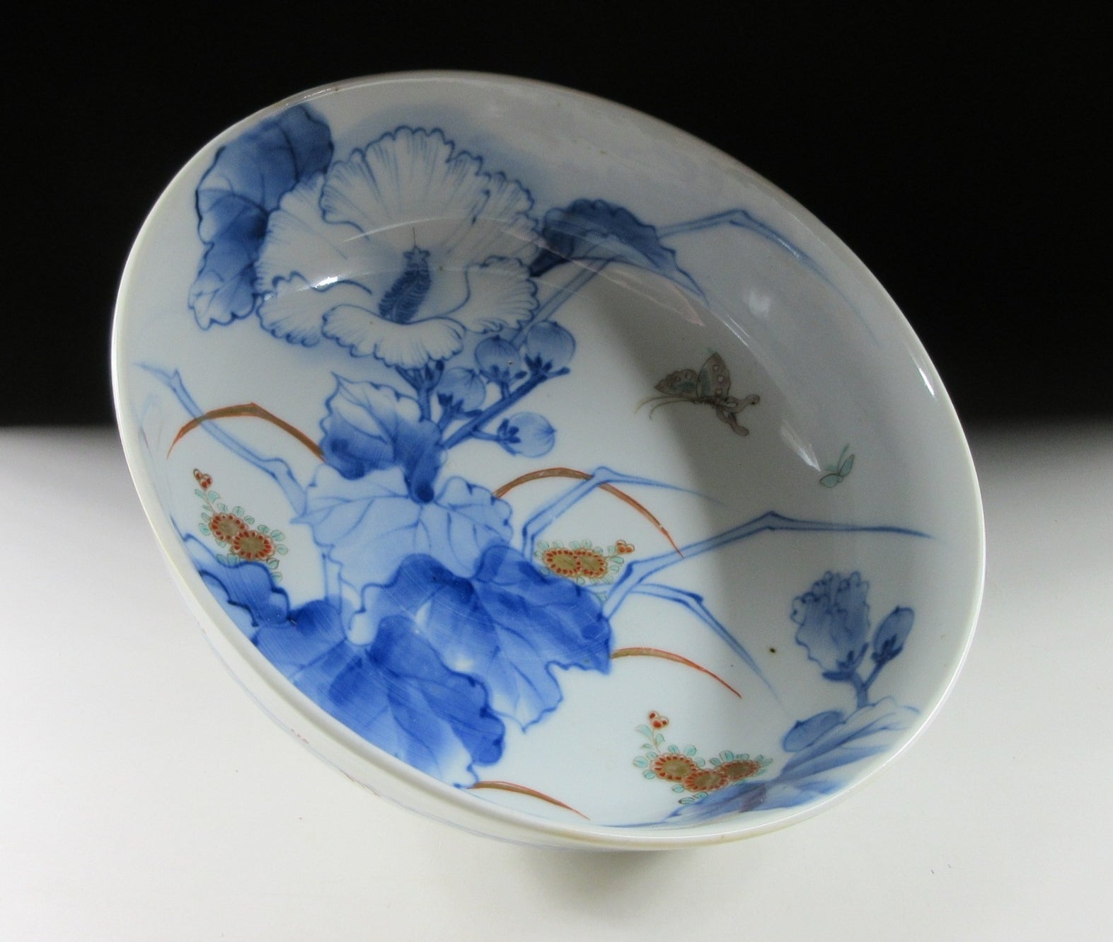 This listing is for an Imari-ware bowl made around 60-70 years ago. It is made of porcelain and the interior is decorated with sometsuke depictions of hibiscus flowers, as well as two small butterflies and what appear to be tiny chrysanthemums. The exterior of the bowl features a pattern of blue and red lines and a few small flowers. The signature of the potter can be found on the bottom and reads as ‘Ken’.