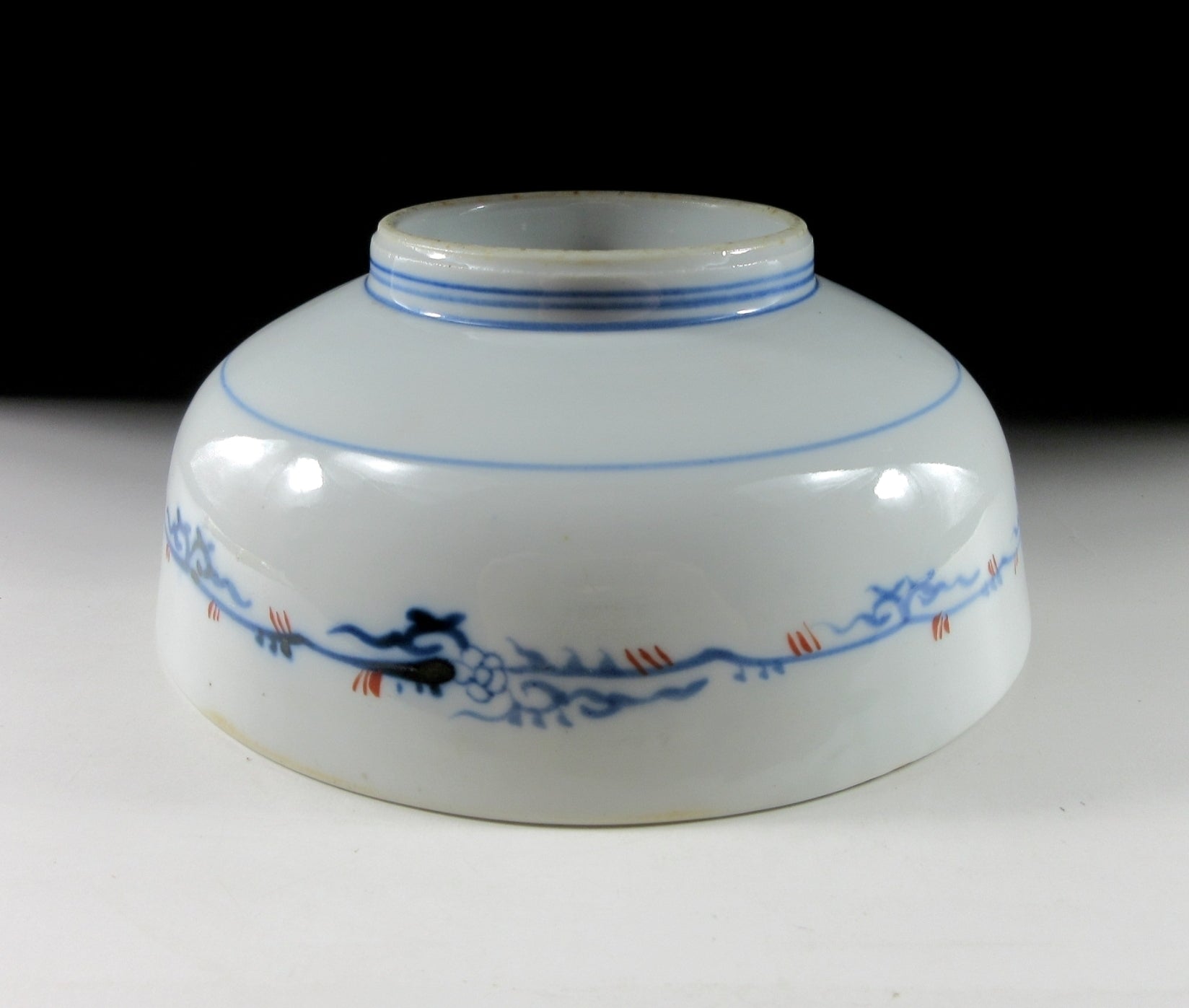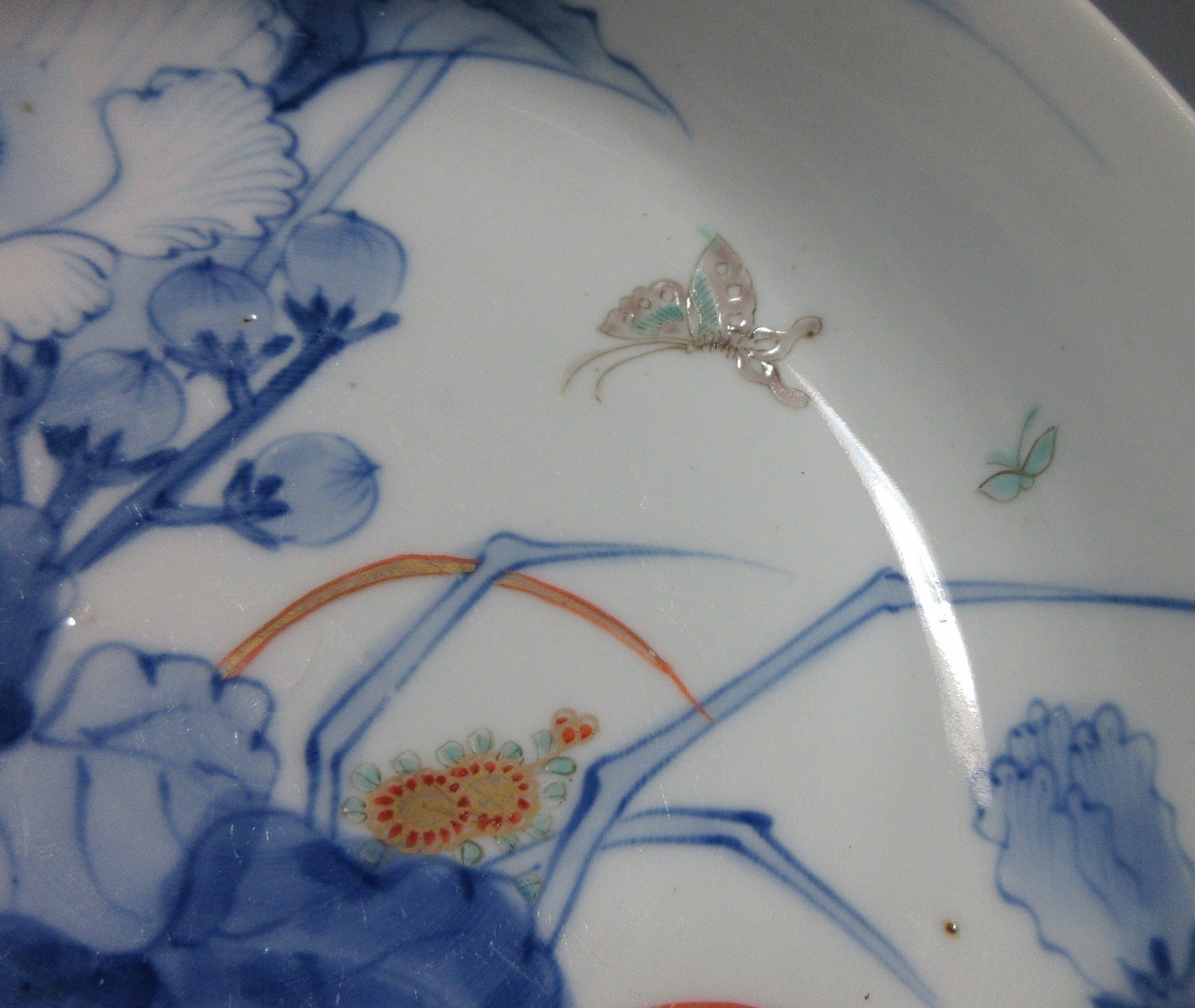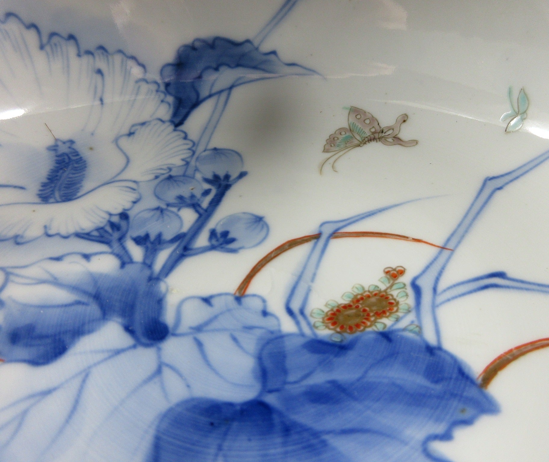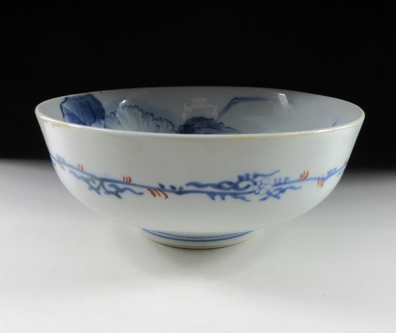 This listing is for an Imari-ware bowl made around 60-70 years ago. It is made of porcelain and the interior is decorated with sometsuke depictions of hibiscus flowers, as well as two small butterflies and what appear to be tiny chrysanthemums. The exterior of the bowl features a pattern of blue and red lines and a few small flowers. The signature of the potter can be found on the bottom and reads as ‘Ken’.