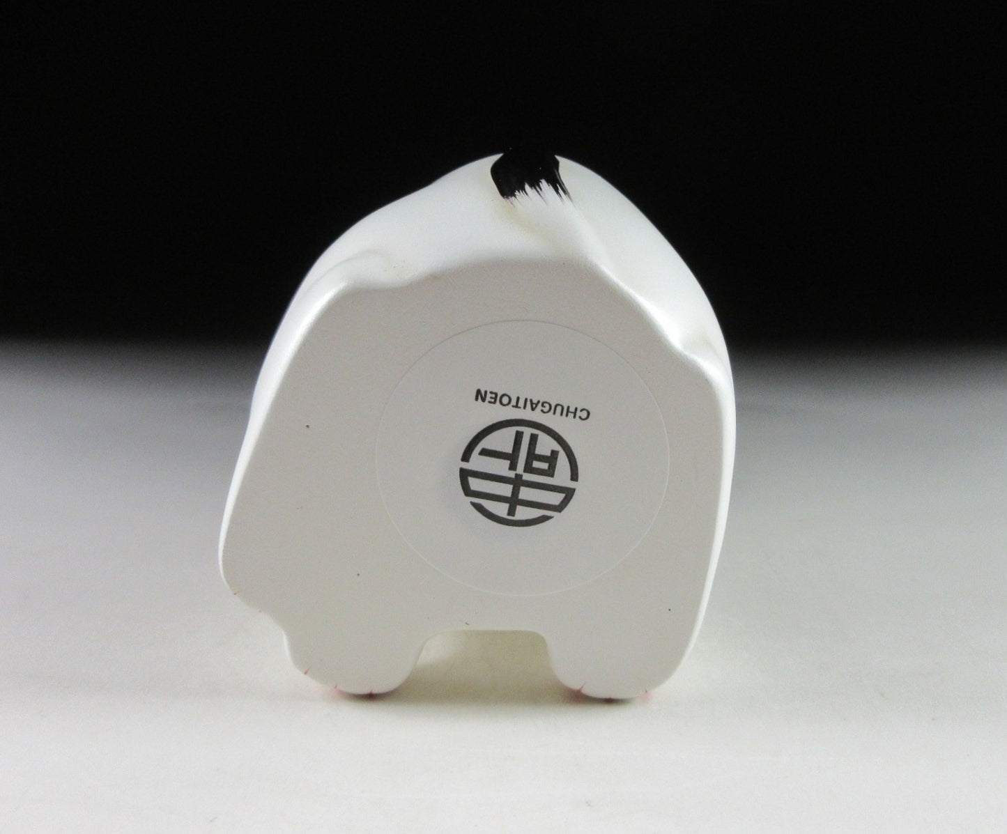 This listing is for a brand new maneki neko made by Chugai Toen. A maneki neko is a beckoning cat that’s believed to bring good luck to its owner, thus making them a very common sight in stores and restaurants. The maneki in this listing is made from a mould and painted white with black and grey spots, and it has a red collar with a gold bell tied around its neck. This particular maneki has its right paw raised and is a part of the kiln’s Seto Manekineko series. It also comes with its original paper storage box. The English on the back of the box explains that a raised right paw is said to be beckoning money, whilst a raised left paw invites patronage.