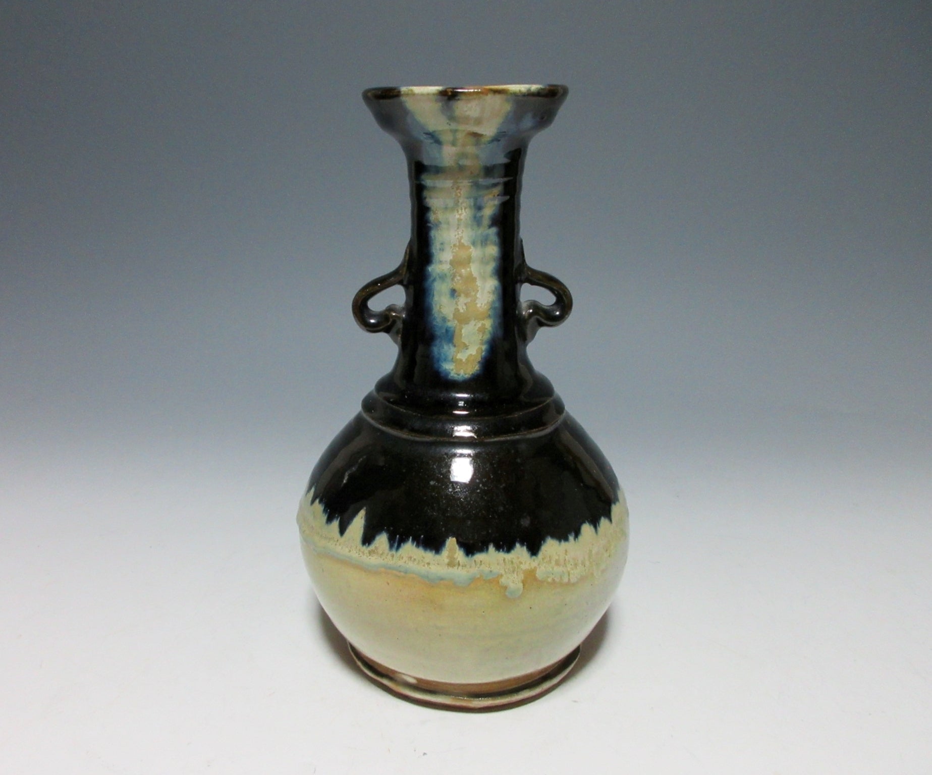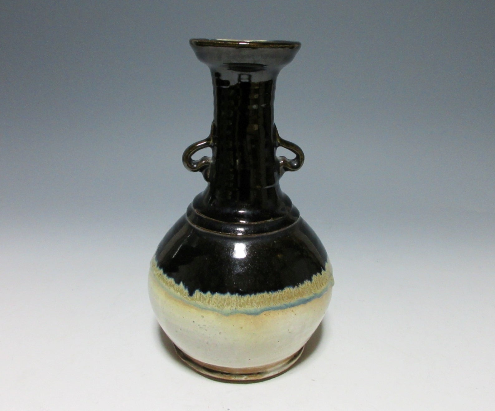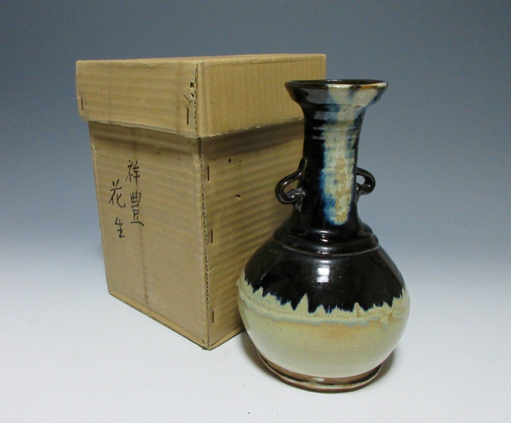 This listing is for a vintage vase possibly made around 50-60 years ago by noted potter, Suda Shoho. It is wheel-thrown and features Korean Karatsu glaze work, and is meant to be a reinterpretation of an art object from the past. It has two small handles on the neck, and a slightly flared rim at the top. It is not signed on the bottom, but the paper inside of the paper box attributes this piece to Suda. We cannot say 100% whether this piece was made by Suda or not, so we are selling it at a regular price.