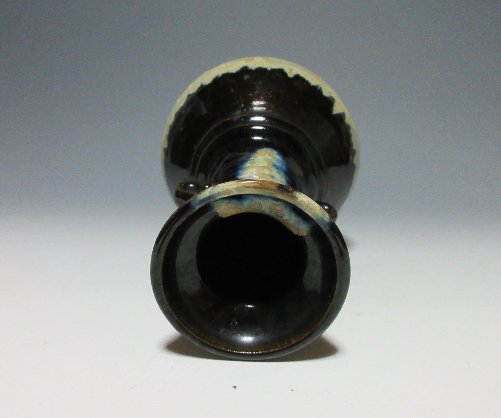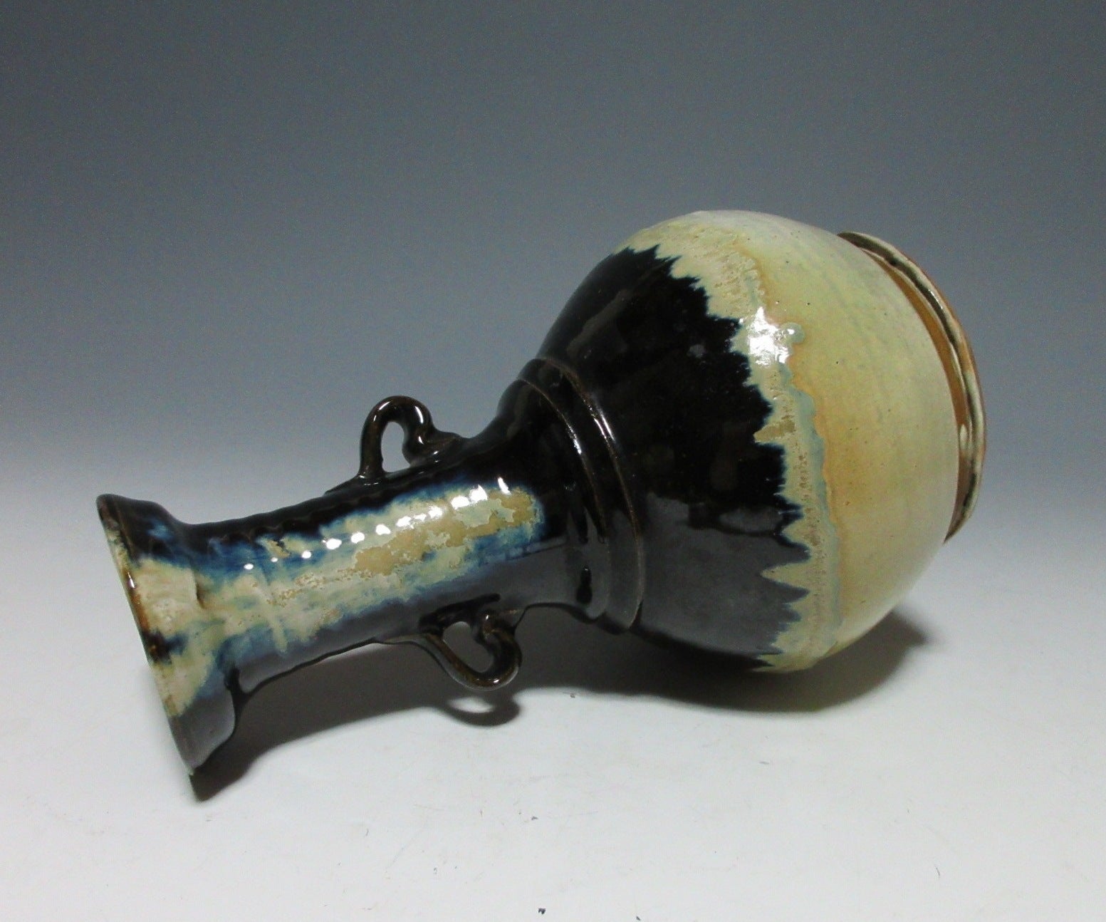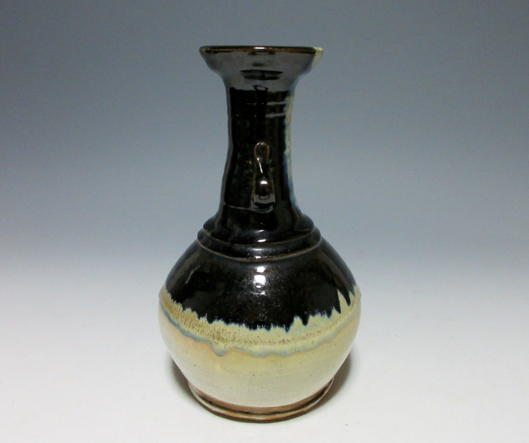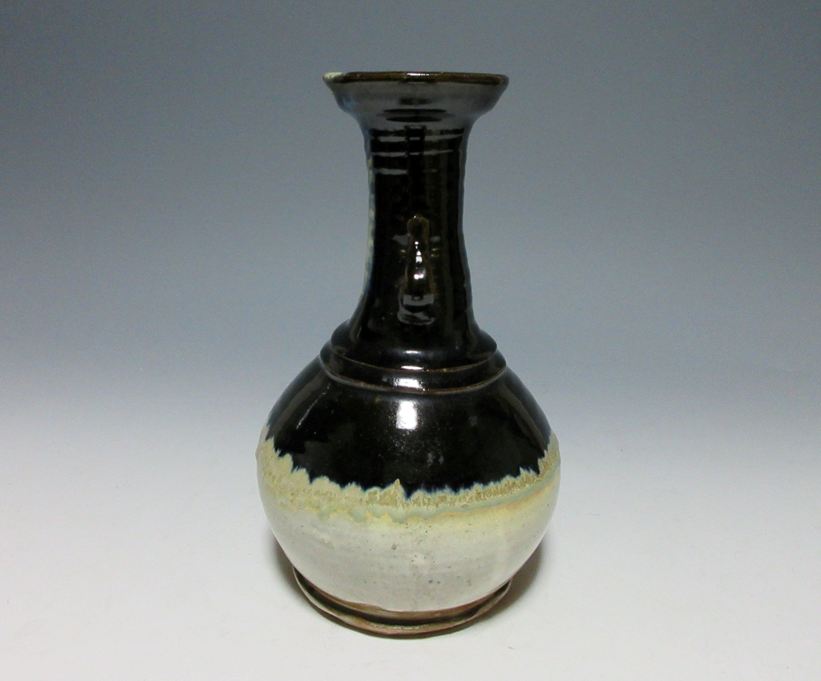 This listing is for a vintage vase possibly made around 50-60 years ago by noted potter, Suda Shoho. It is wheel-thrown and features Korean Karatsu glaze work, and is meant to be a reinterpretation of an art object from the past. It has two small handles on the neck, and a slightly flared rim at the top. It is not signed on the bottom, but the paper inside of the paper box attributes this piece to Suda. We cannot say 100% whether this piece was made by Suda or not, so we are selling it at a regular price.