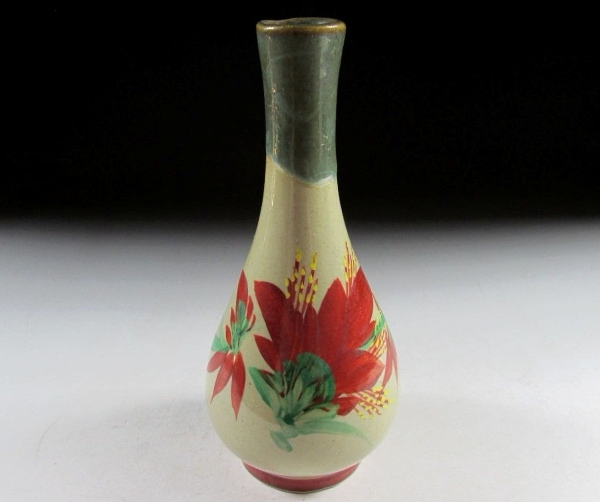 This listing is for an Okinawan Yomitan Tsuboya-ware vase made by Suekichi Gama. It has a tall slender shape and is decorated with a traditional Okinawan red flower design. The opening is wide enough to accommodate a few thin stemmed flowers, and the stamp of the kiln can be found on the bottom.