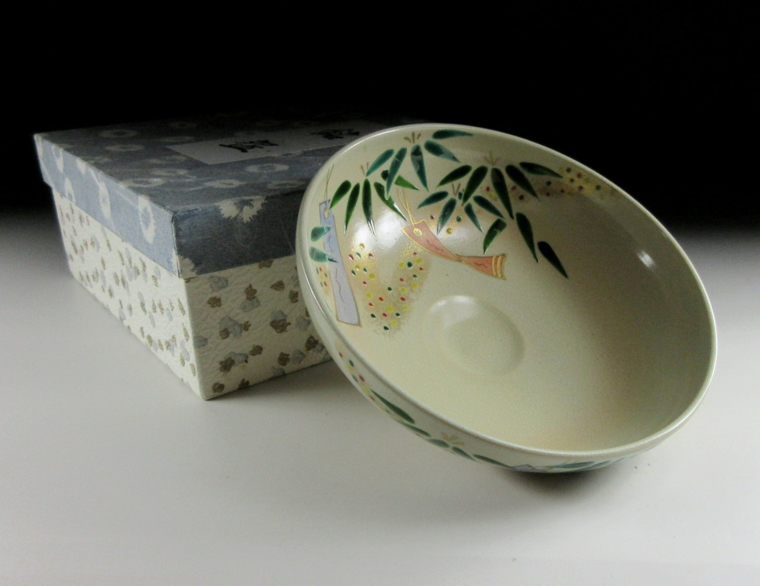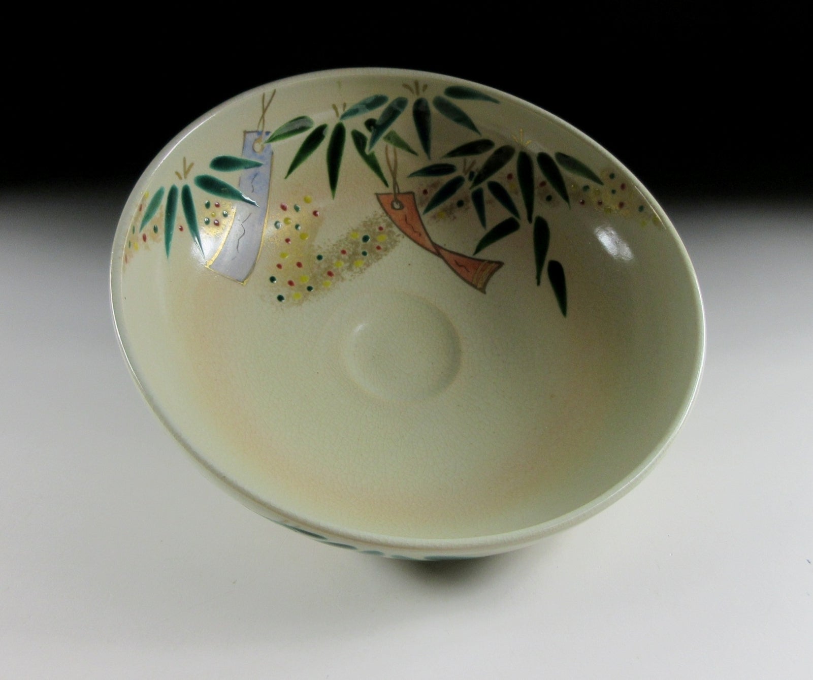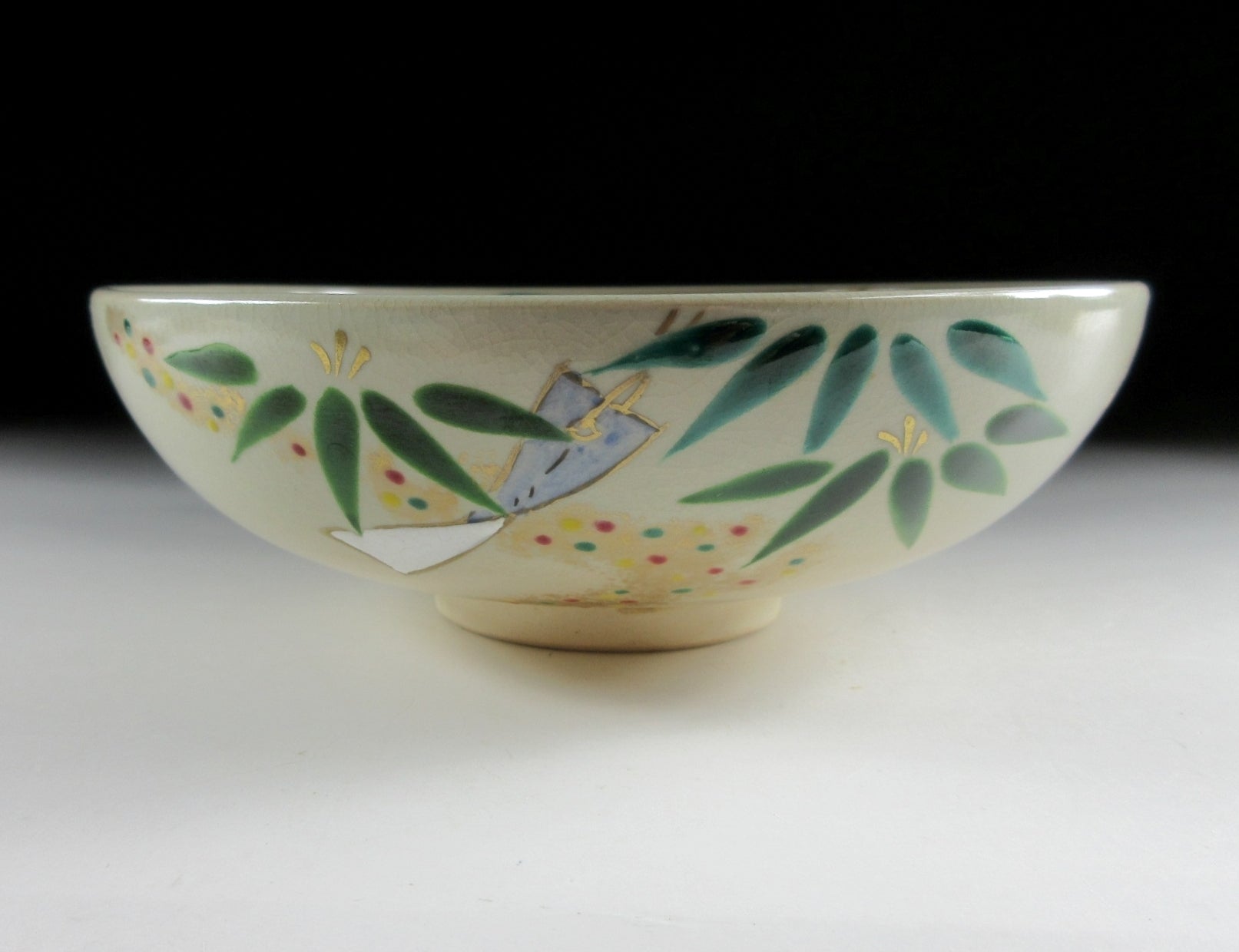 This listing is for a Kyo-ware hira chawan made around 20-30 years ago by Suide Soken. It is wheel-thrown and the flat hira type used during the summer season. Hira chawan are shallow bowls with low sides designed to cool tea down faster. The bowl in this listing is decorated with a hand-painted and colourful ‘tanabata’ pattern. Tanabata is the annual star festival held on either July or August 7th depending on the region. During this festival people write wishes on colourful strips of paper and hang them from bamboo branches. If the skies are clear and it doesn’t rain that night it is said that the wishes will come true. The stamp of the potter can be found on the bottom, and it comes with its original paper storage box.