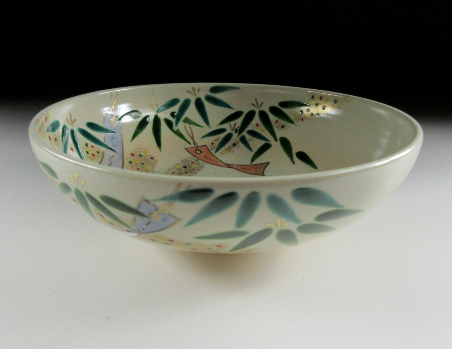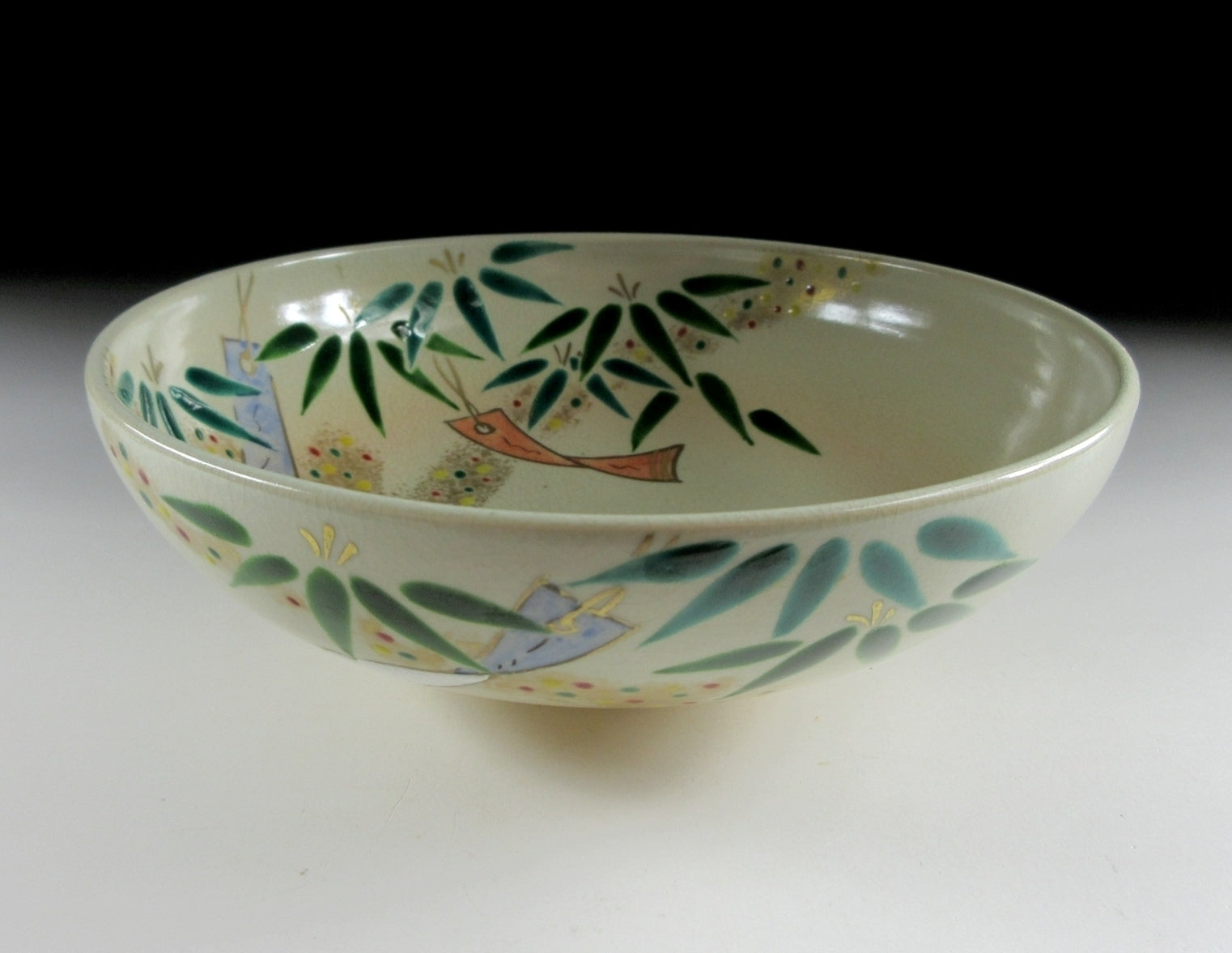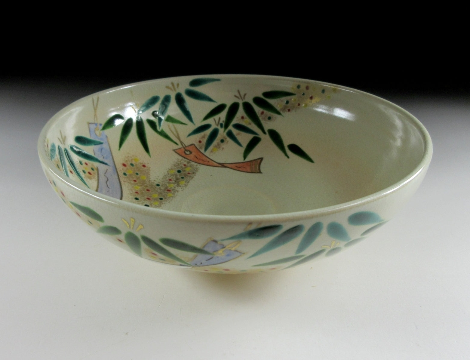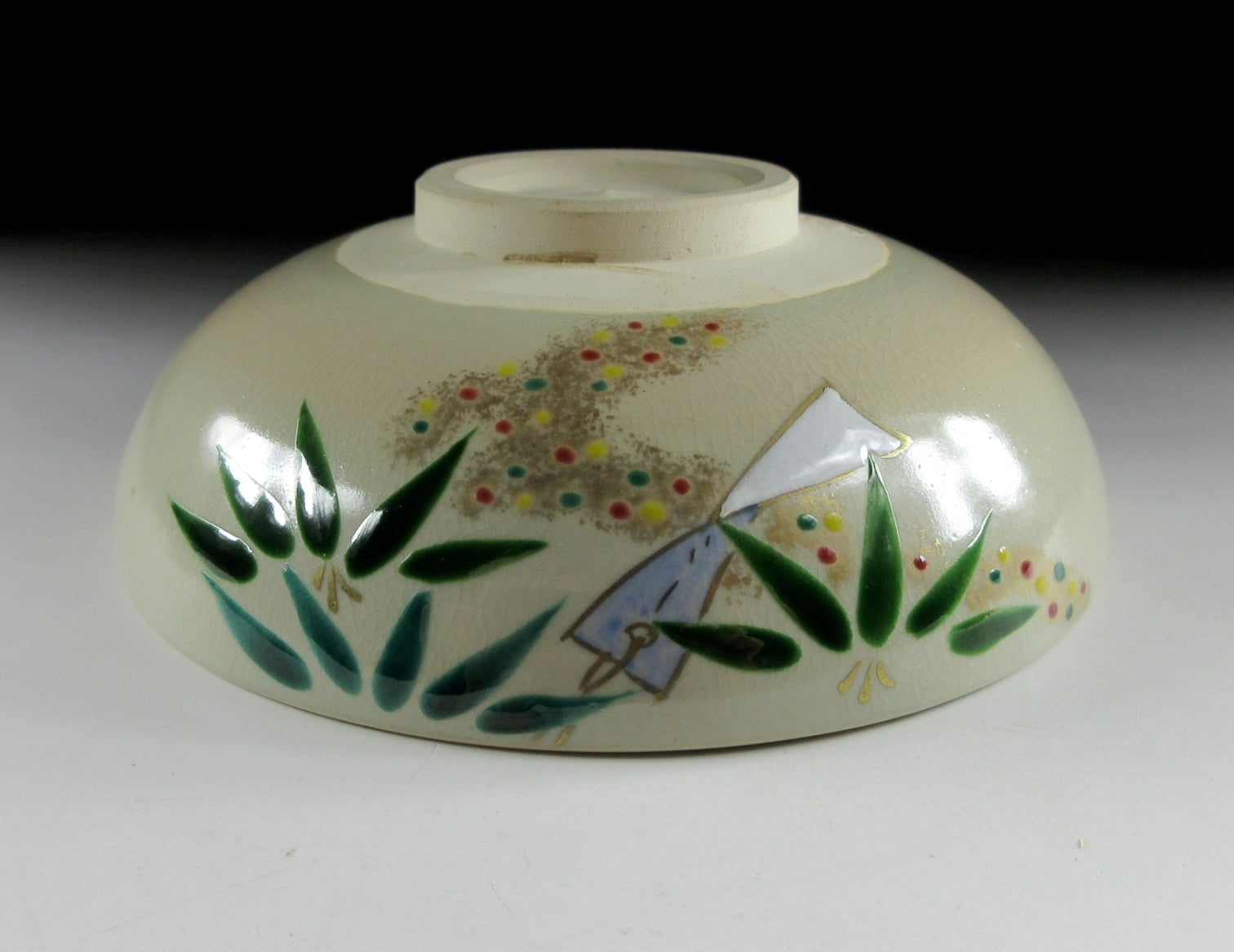 This listing is for a Kyo-ware hira chawan made around 20-30 years ago by Suide Soken. It is wheel-thrown and the flat hira type used during the summer season. Hira chawan are shallow bowls with low sides designed to cool tea down faster. The bowl in this listing is decorated with a hand-painted and colourful ‘tanabata’ pattern. Tanabata is the annual star festival held on either July or August 7th depending on the region. During this festival people write wishes on colourful strips of paper and hang them from bamboo branches. If the skies are clear and it doesn’t rain that night it is said that the wishes will come true. The stamp of the potter can be found on the bottom, and it comes with its original paper storage box.