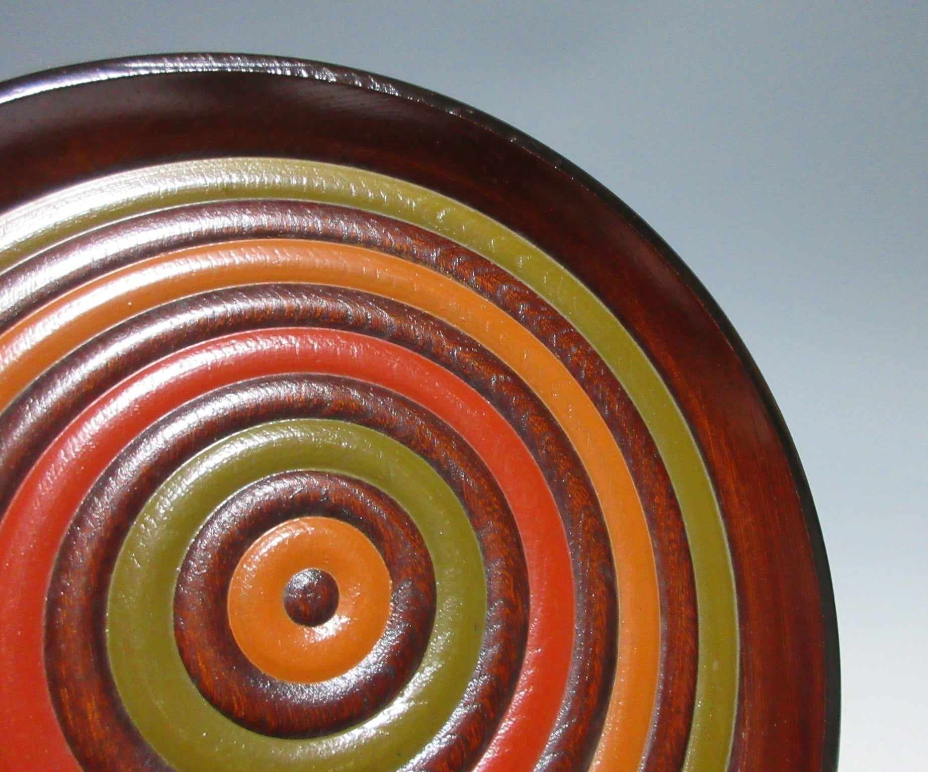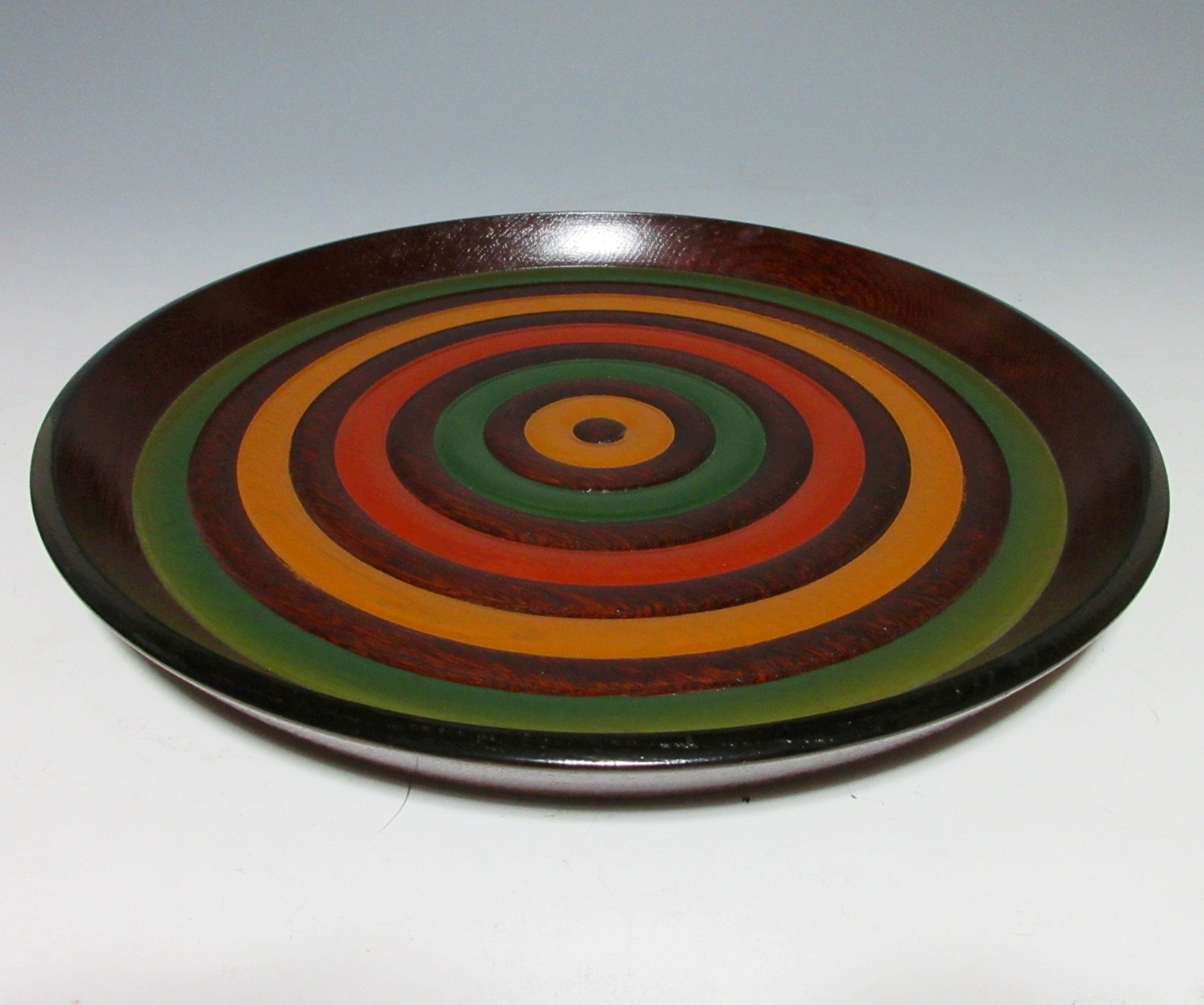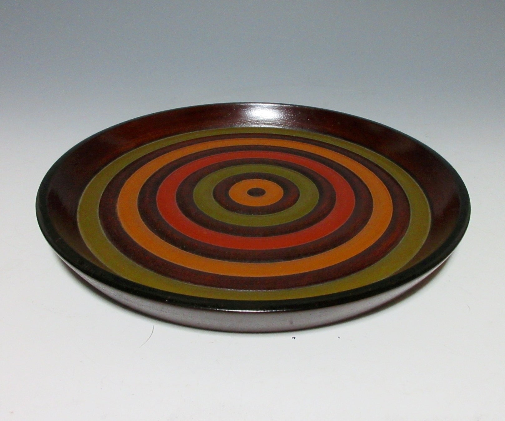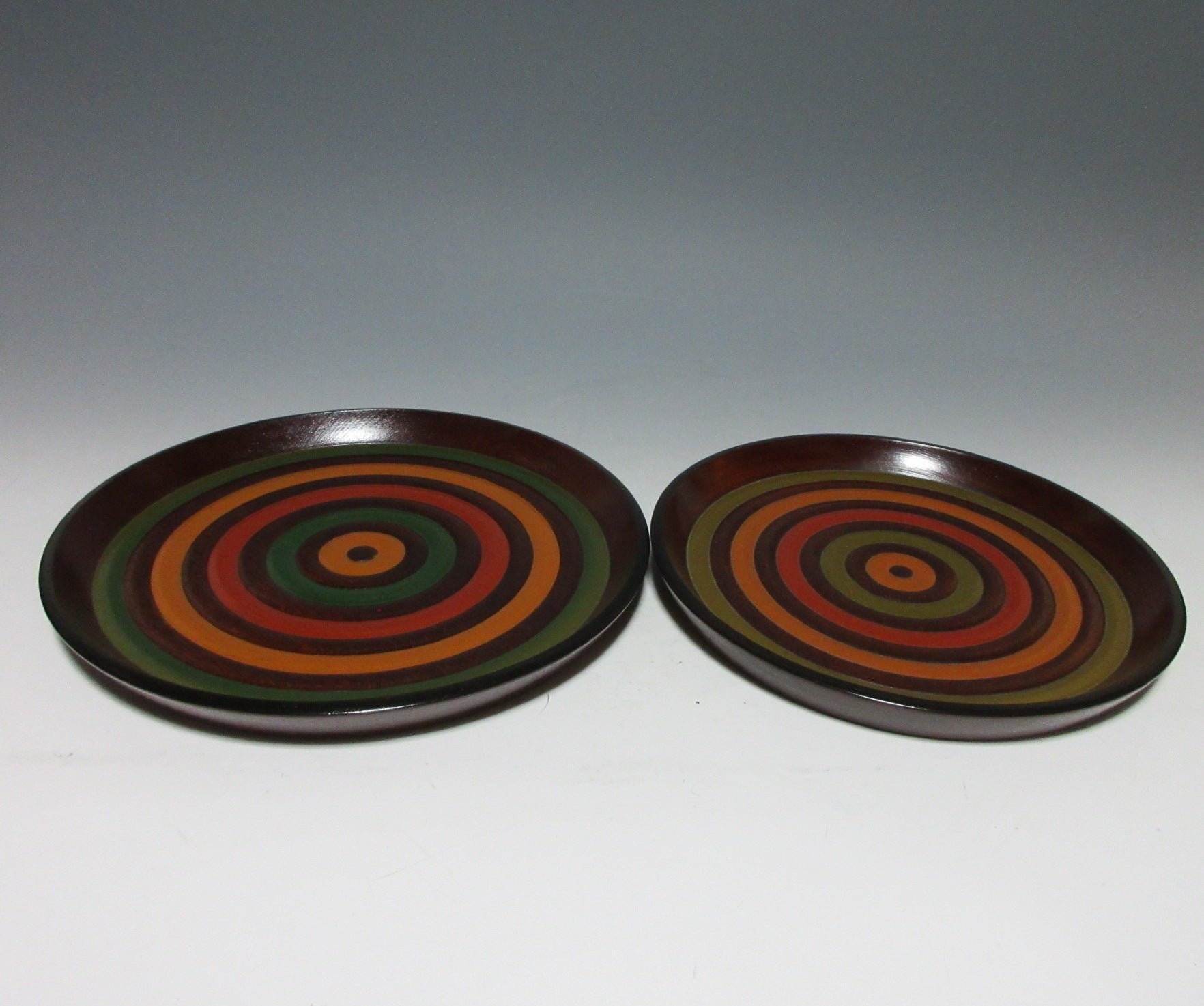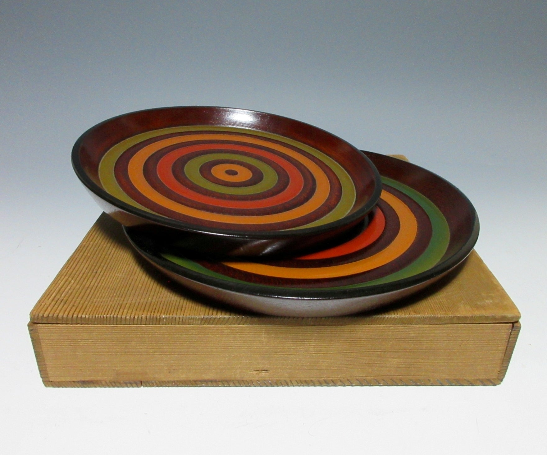 This listing is for a pair of Kyo-nuri ‘koma’ trays made around 50 years ago by master craftsman, Suzuki Hyosaku II. They are made of wood and the design consists of thick concentric circles made with three colours of lacquer. A koma is a spinning top, a traditional folk-art toy played with during New Year. Spinning tops are considered auspicious and symbolise things turning from bad to good, and flowing along smoothly. Both trays are in excellent condition and come with their original signed wooden storage box.