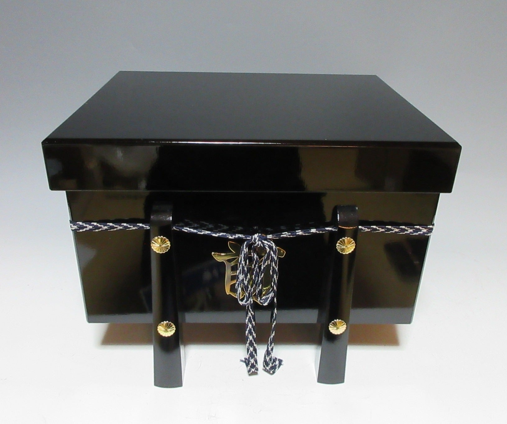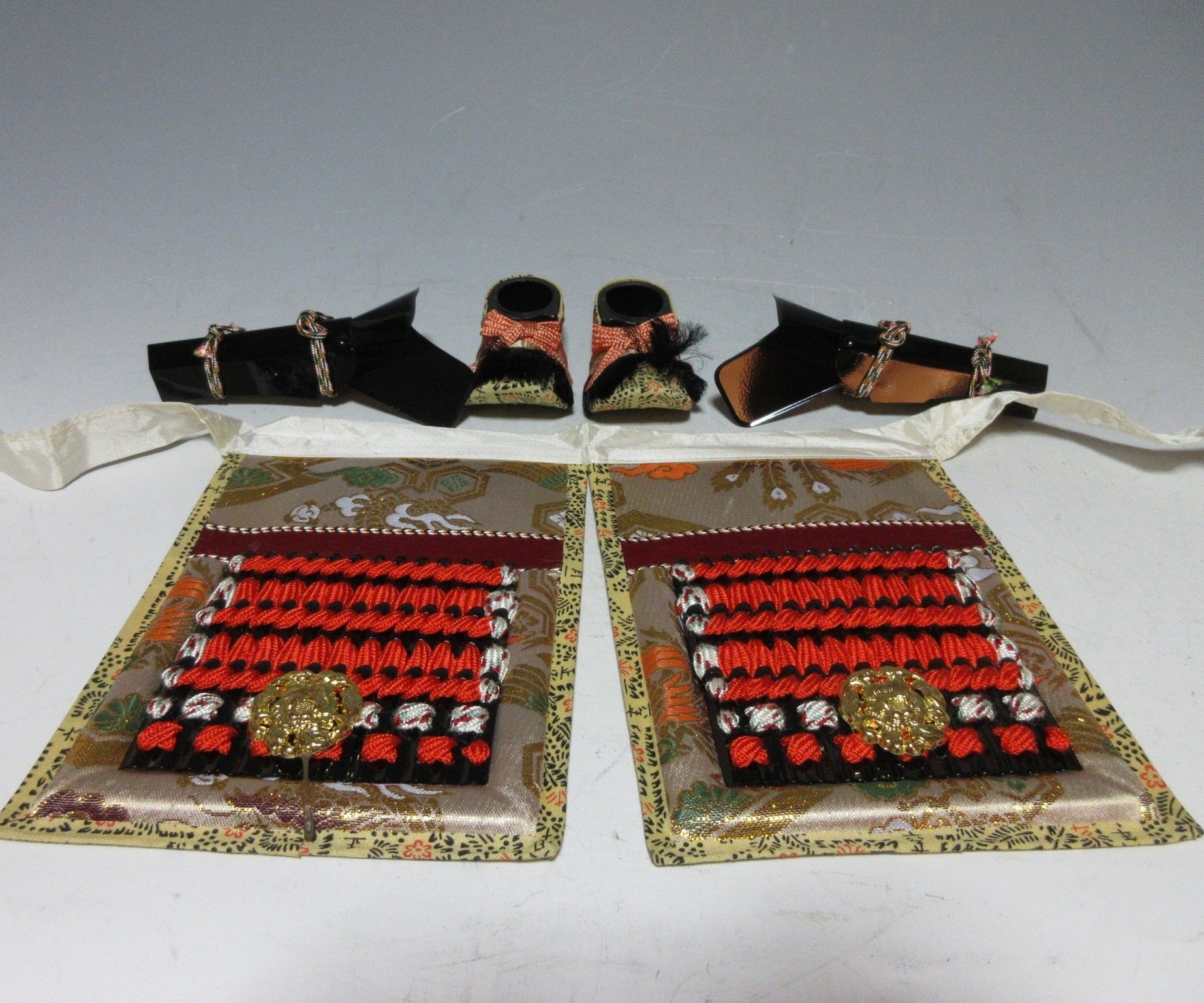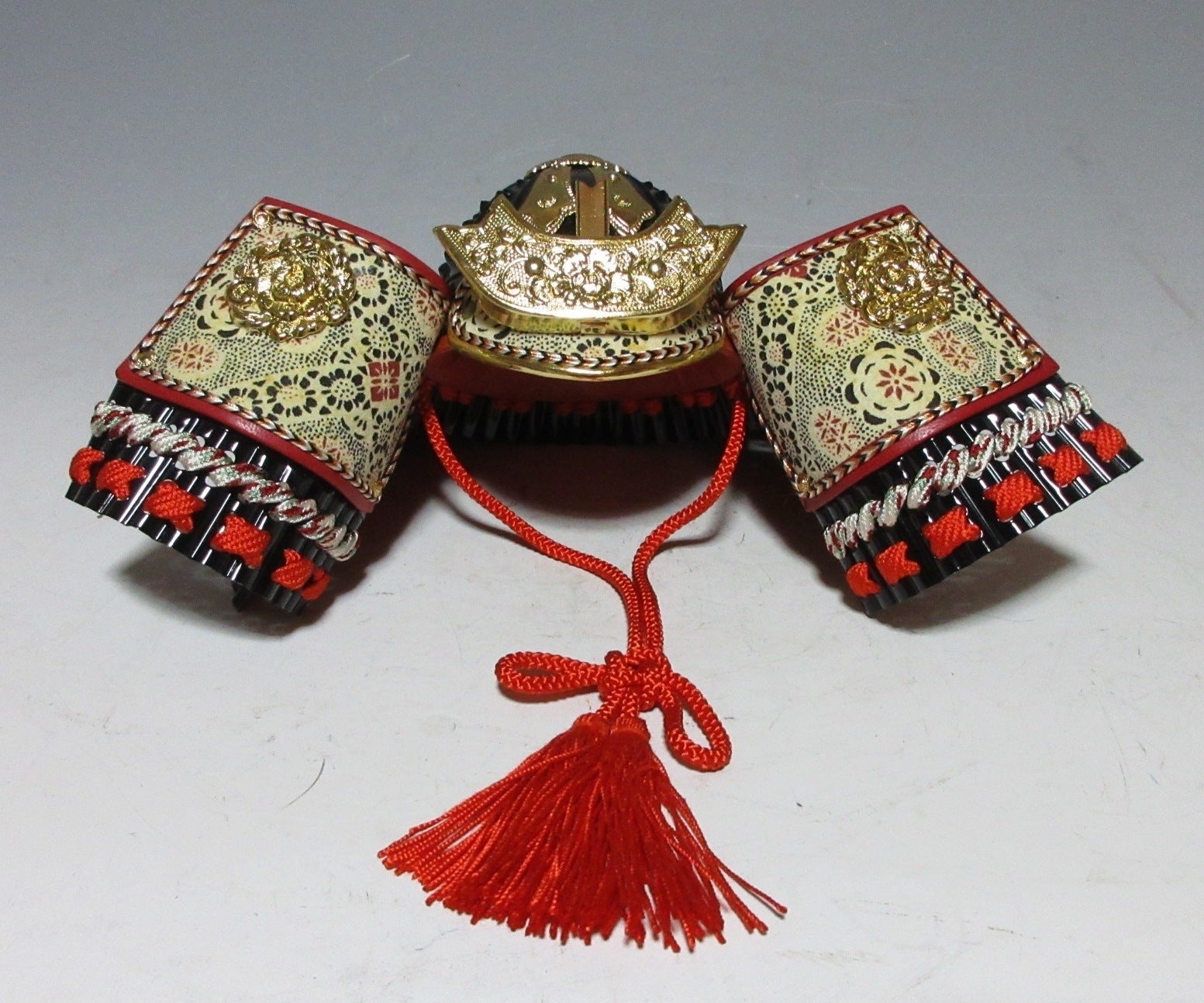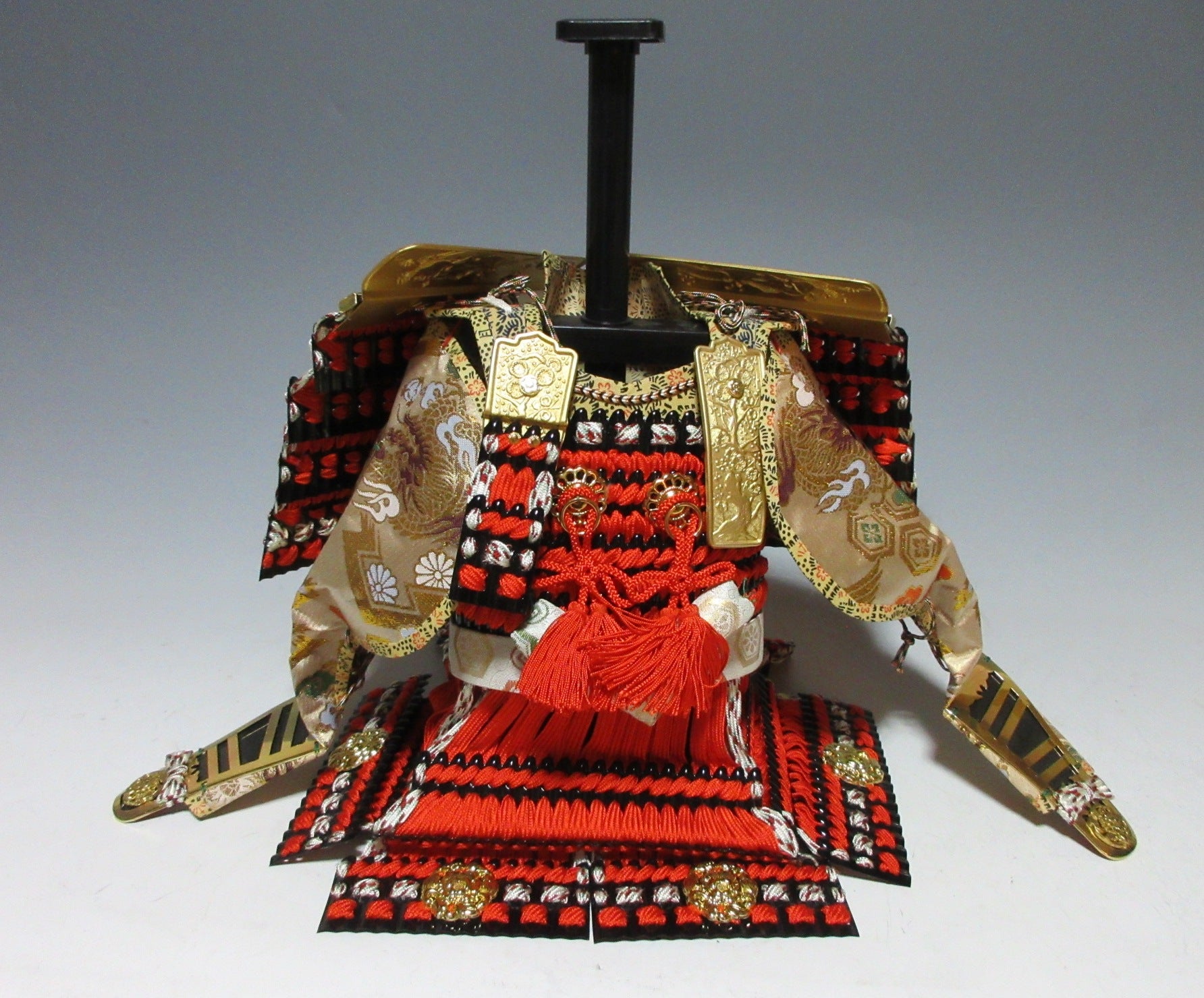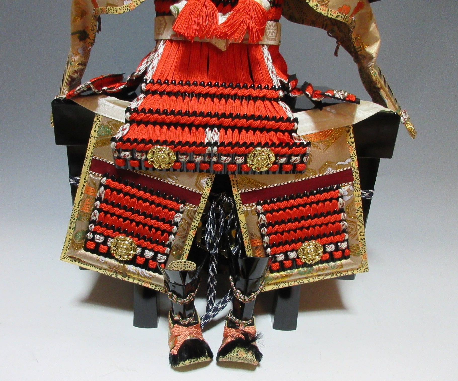 This listing is for an o-yoroi samurai armour decoration made around 30-40 years ago. The set consists of a small armour, plastic stand, a black lacquered storage box and also an outer paper box to protect everything during storage. His boots are made of plastic, however his shin guards are metal. These types of decorations are intended for Tango-no-Sekku celebrations held on May 5th. Tango-no-Sekku was a boy’s day festival although now it is referred to as Children’s Day. This set has been well taken care of and has been in storage for awhile.