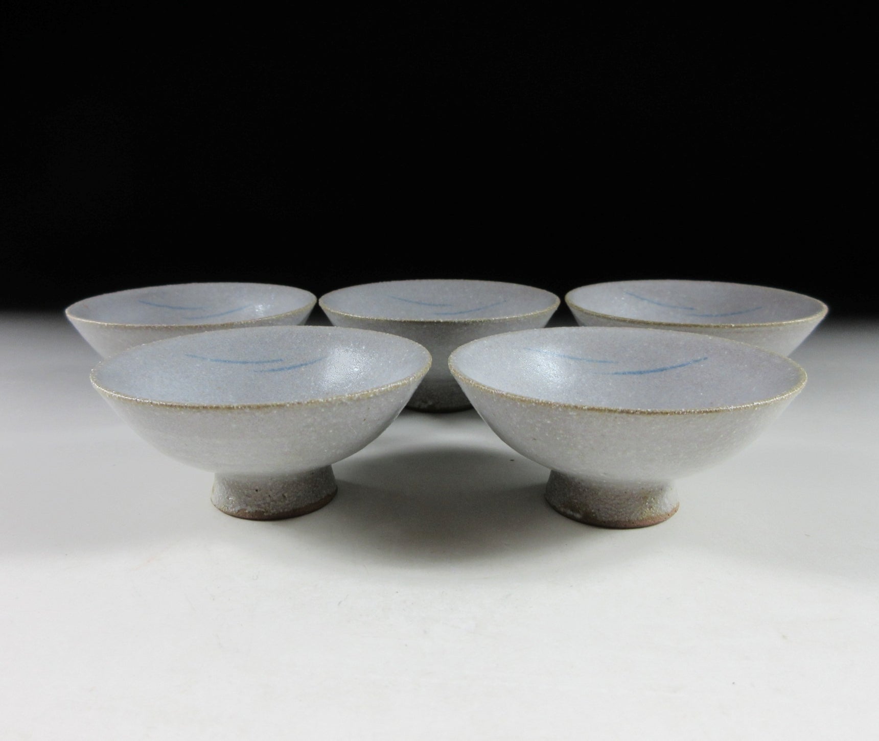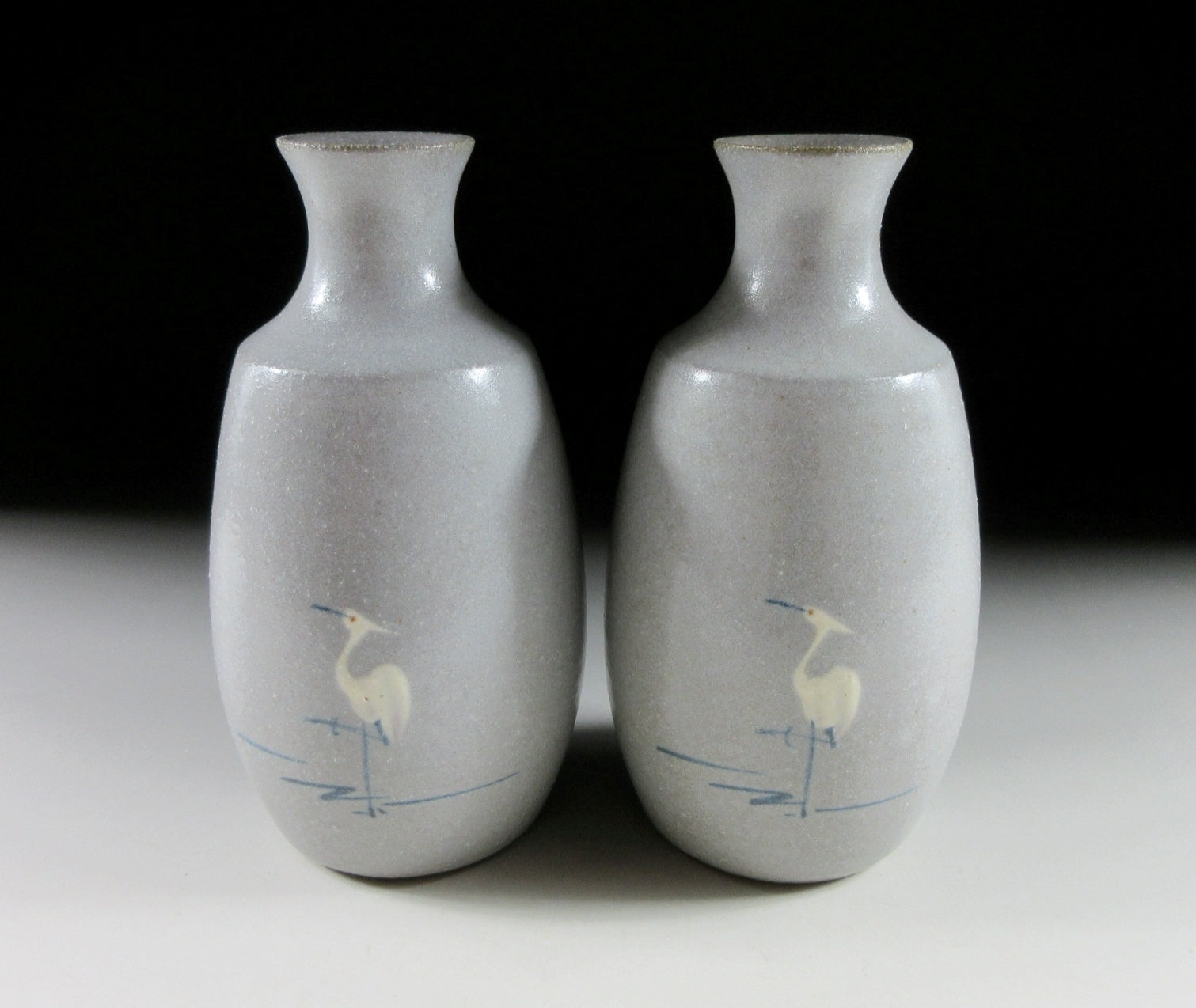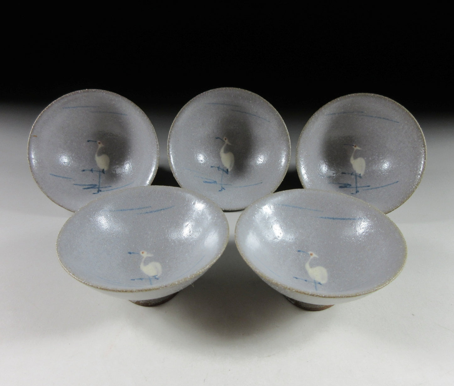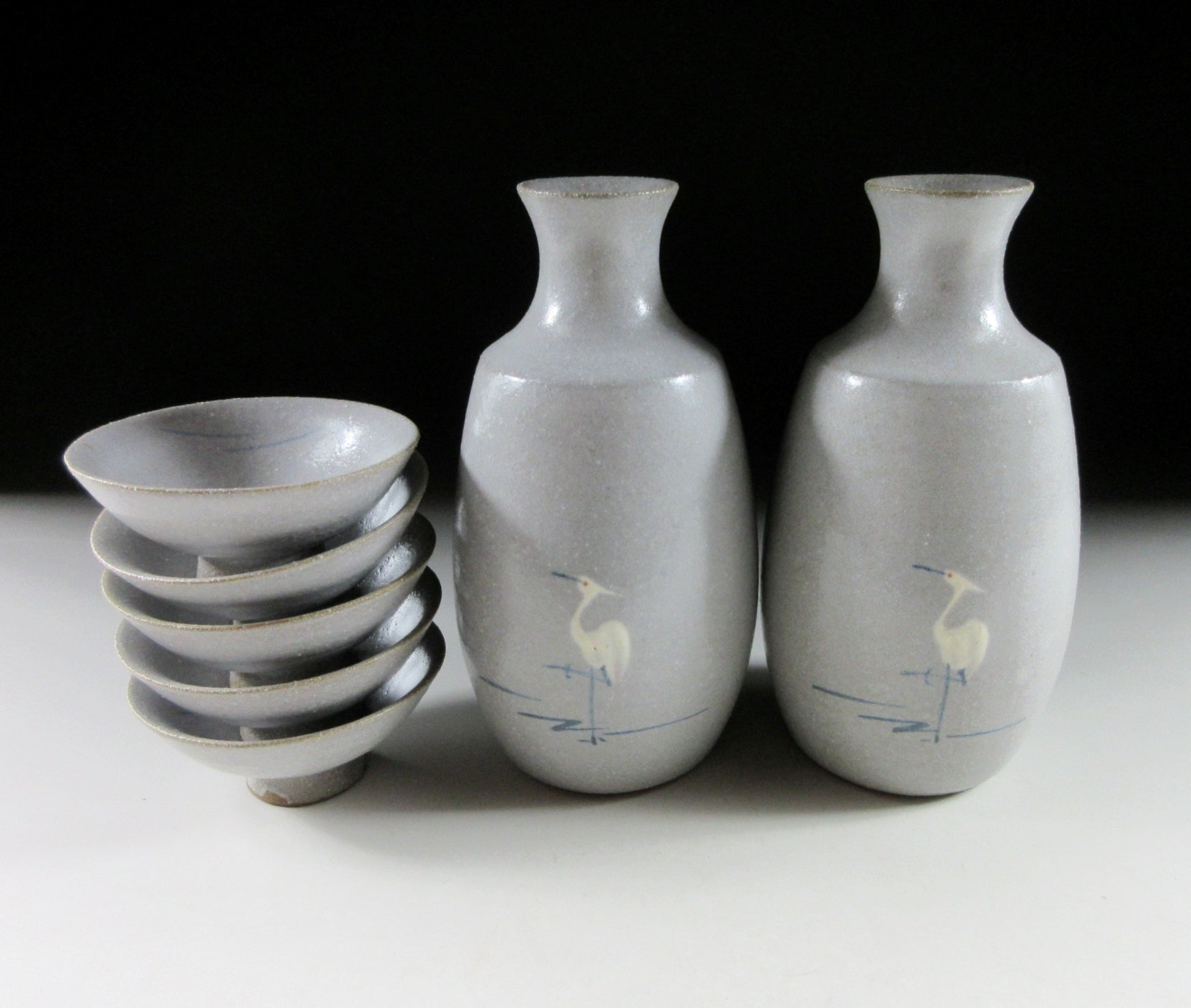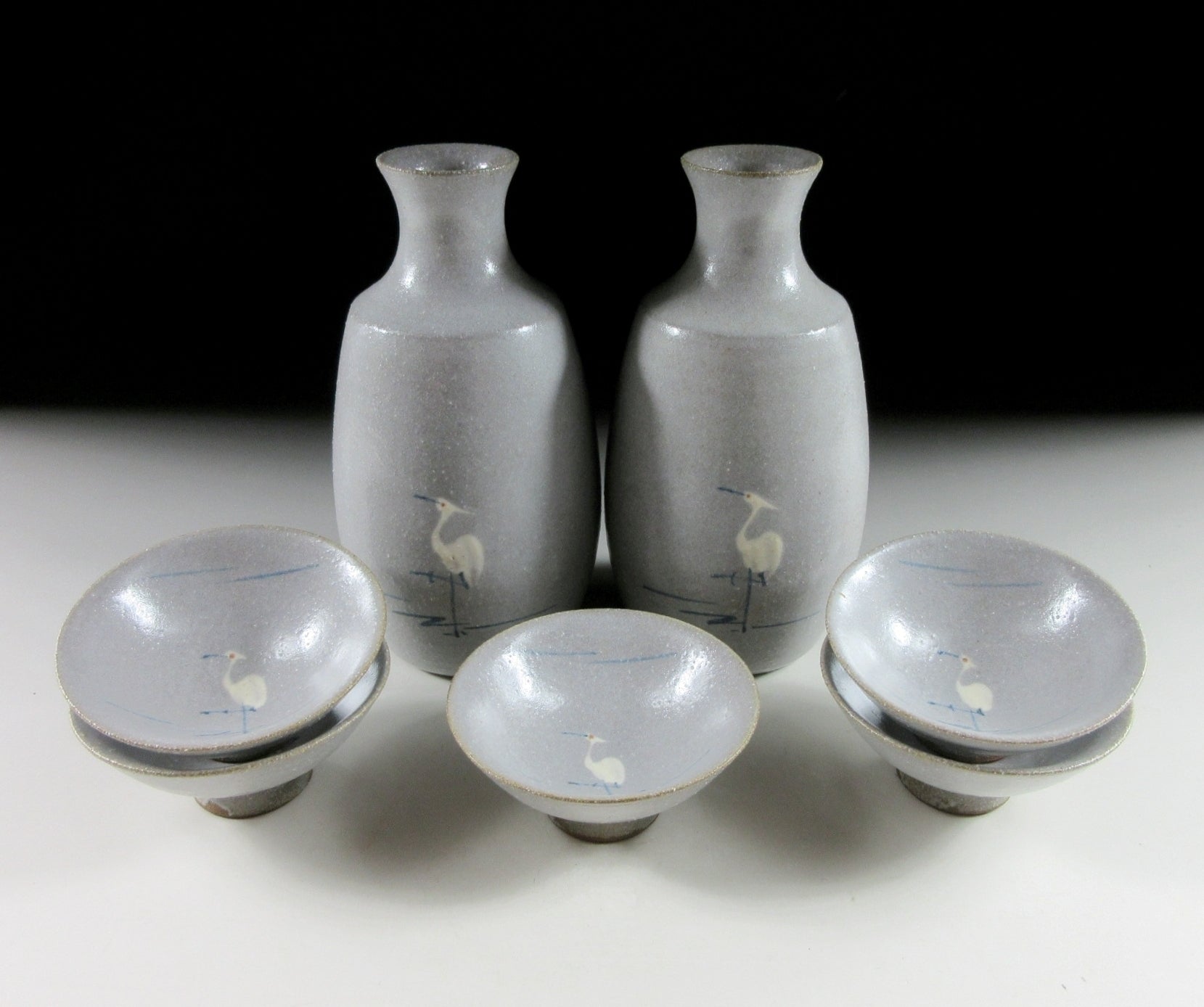 This listing is for a vintage sake set made around 20 years ago for Tachikichi. The set includes a tokkuri and five matching sakazuki cups. Each piece is decorated with a white egret over a matte grey glaze base, and the cups have a slight texture to them. The stamp of the kiln can be found on the bottom of each piece, and they come with their original paper box.