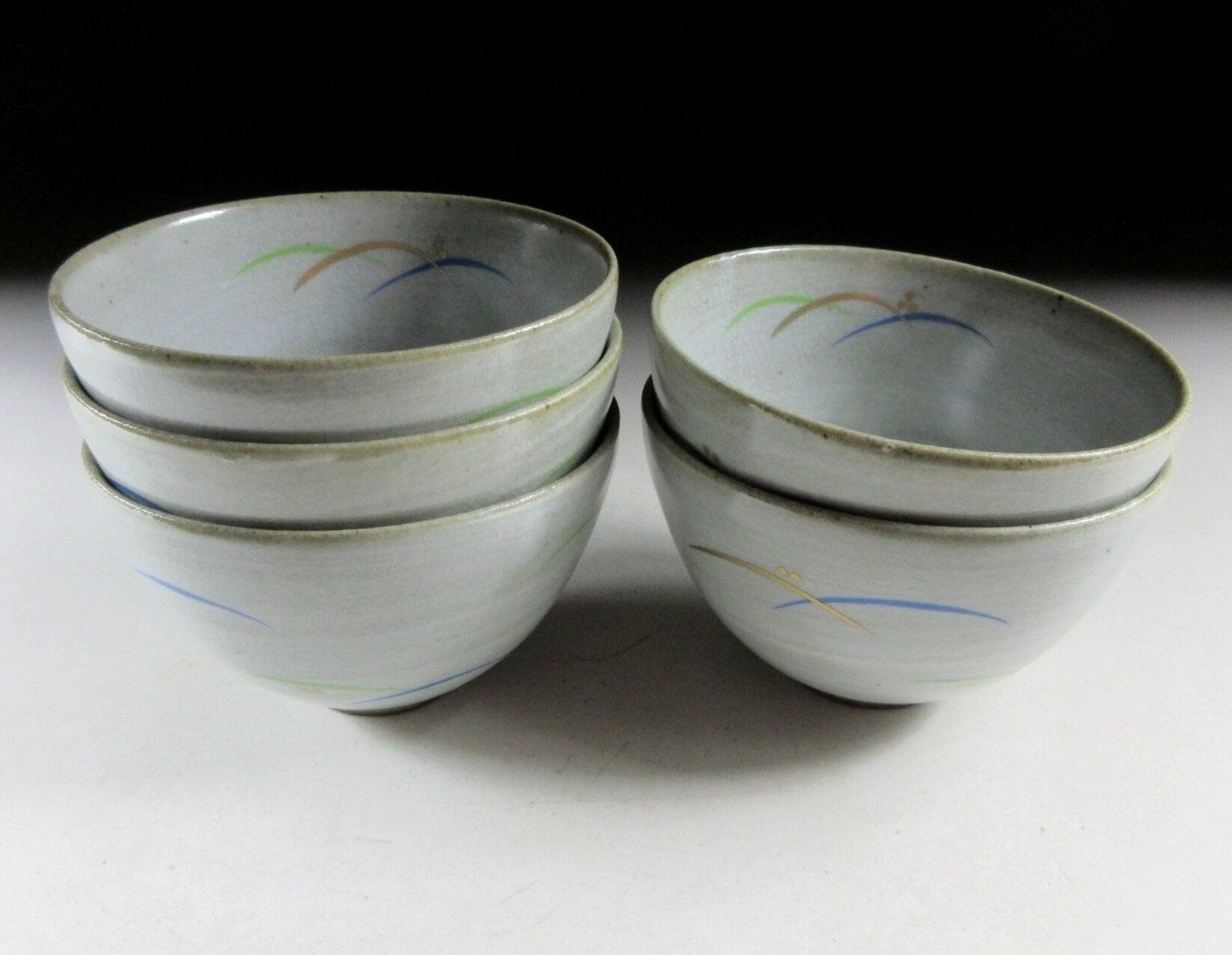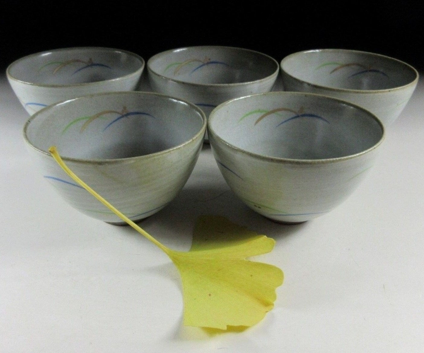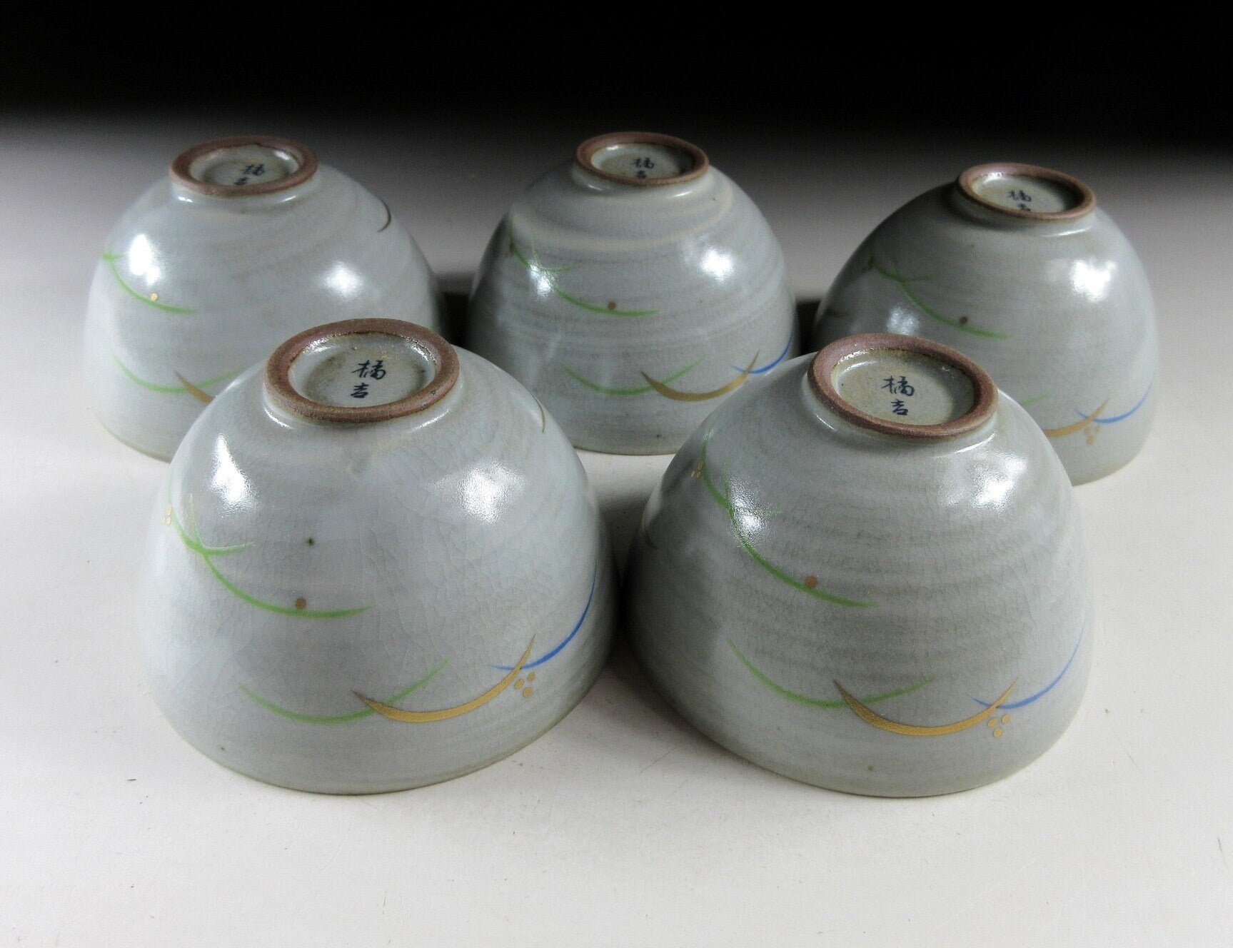 This listing is for a set of five tea cups made around 20 years ago for Tachikichi in Kyoto. They are wheel-thrown and decorated with a stylised pattern of lines and dots, the lines interpreted as cresting waves and the dots as spray from the sea. I have also read that the dots represent fireflies, and the lines grass. These cups are intended for serving sencha, and they are suitable for daily use. The Tachikichi mark can be found on the bottom of each cup, and they come with their original signed wooden storage box.