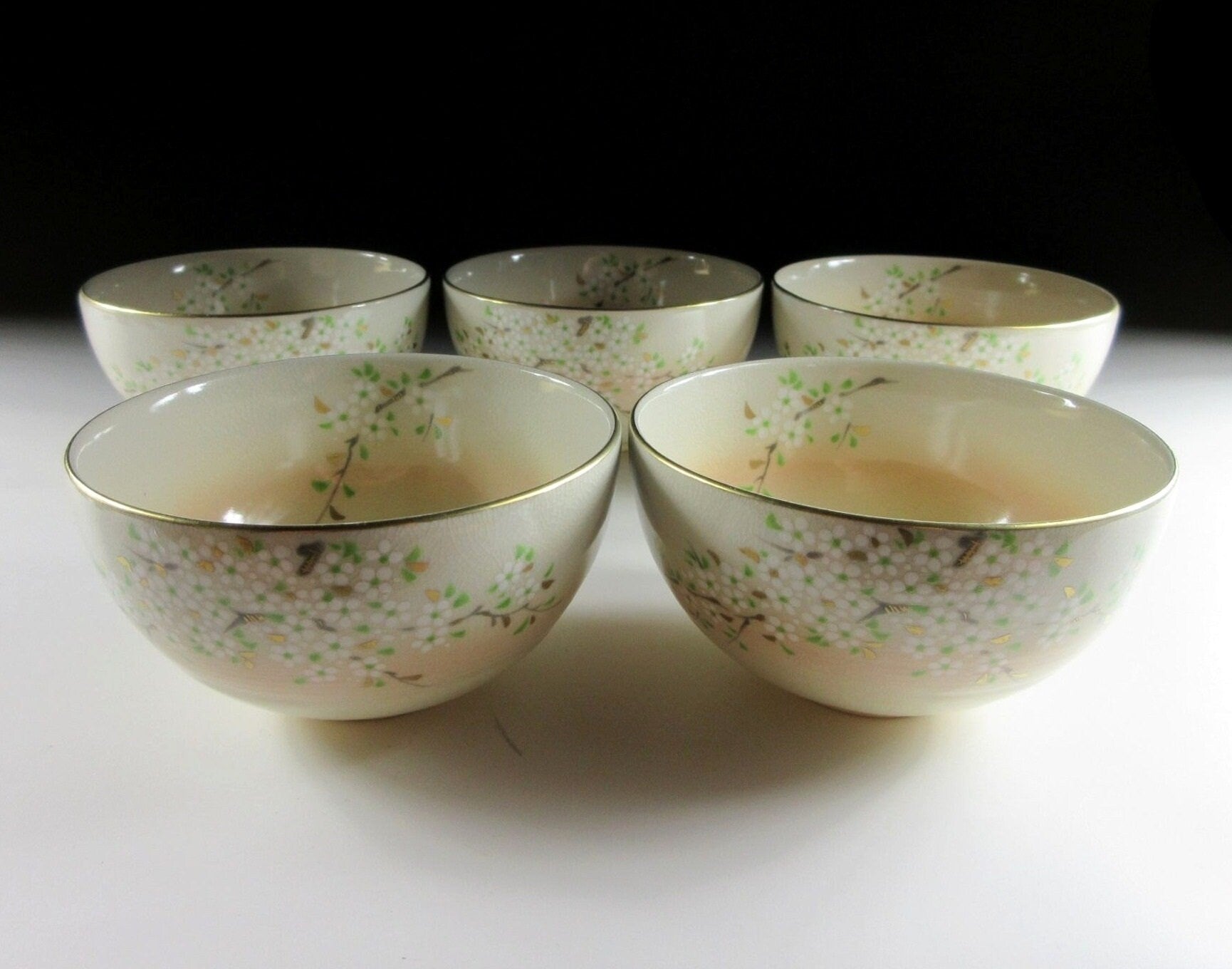 This listing is for a set of five tea cups made around 20 years ago for Tachikichi in Japan. They are wheel-thrown and the front and interior of each cup is decorated with dainty sakura cherry blossoms over a light coloured base. This set is made of high-fired stoneware and is suitable for daily use. The stamp of the kiln can be found on the bottom of each cup, sorry no box for this set.