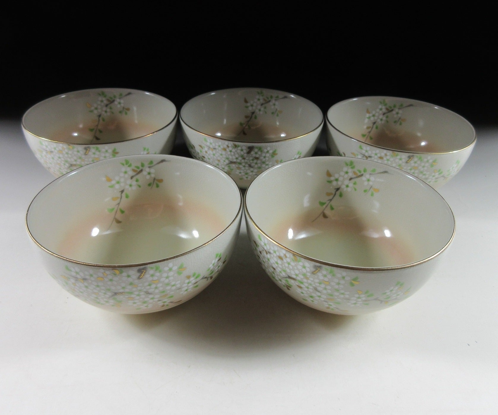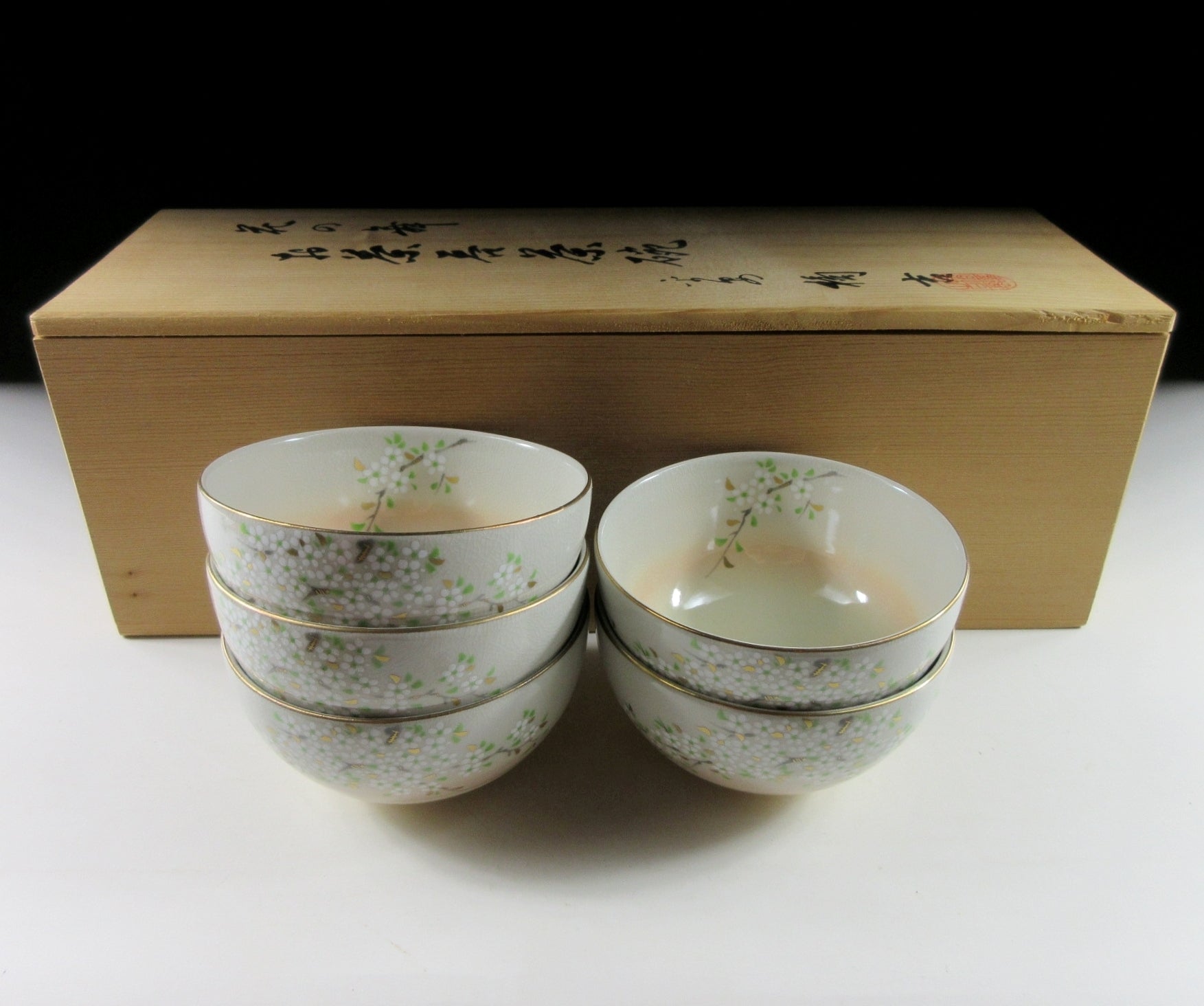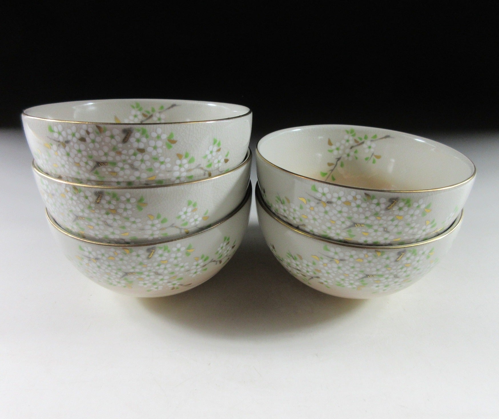 This listing is for a set of five tea cups made around 20 years ago for Tachikichi in Japan. They are wheel-thrown and the front and interior of each cup is decorated with dainty sakura cherry blossoms over a light coloured base. This set is made of high-fired stoneware and is suitable for daily use. The stamp of the kiln can be found on the bottom of each cup, and they come with their original signed wooden storage box.