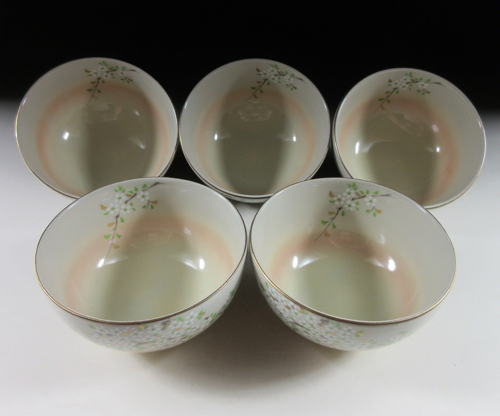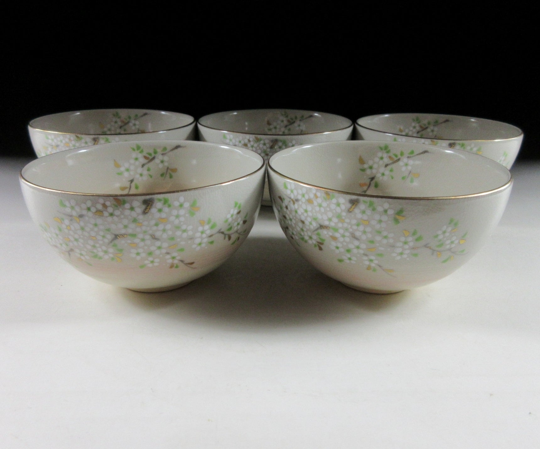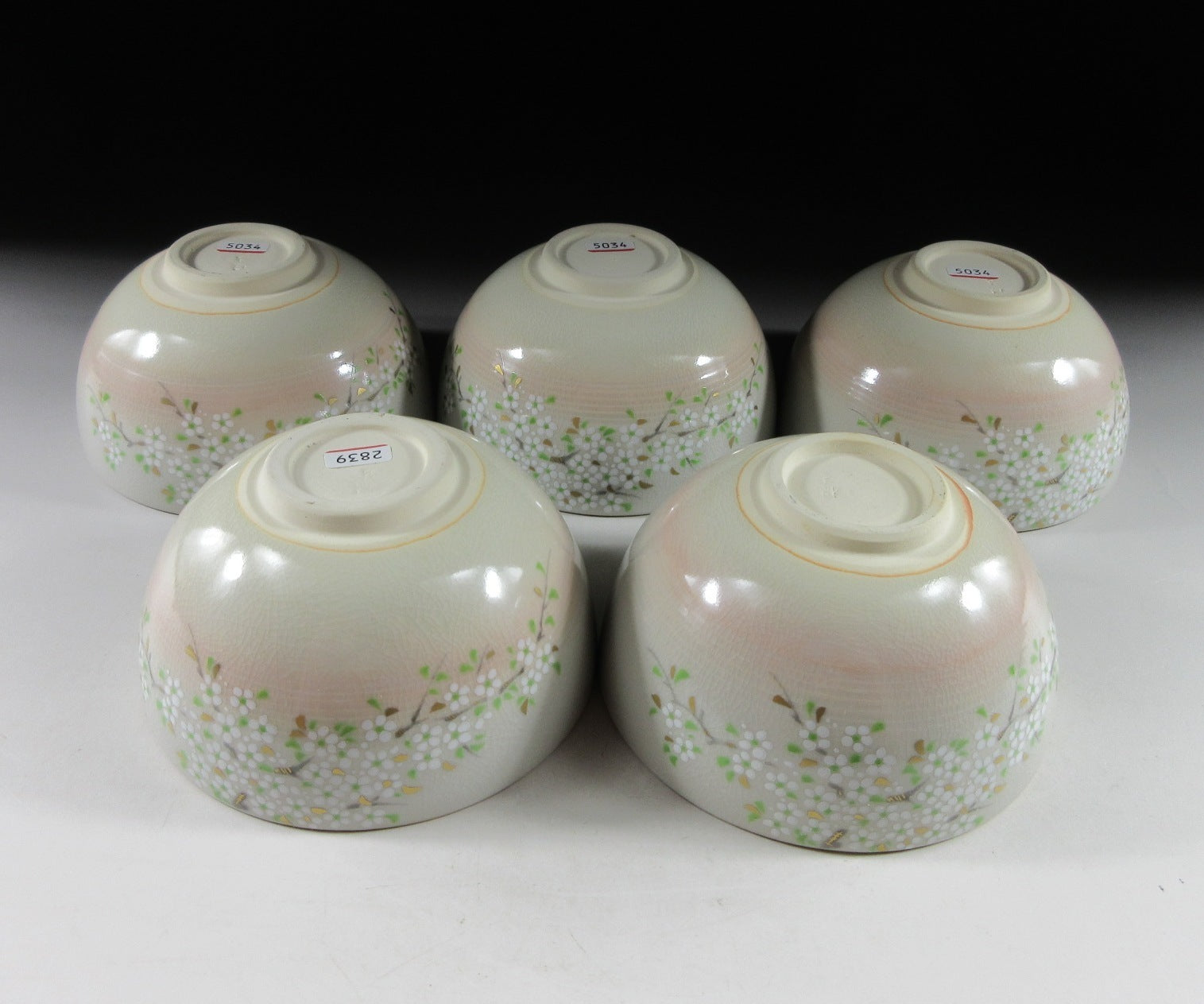 This listing is for a set of five tea cups made around 20 years ago for Tachikichi in Japan. They are wheel-thrown and the front and interior of each cup is decorated with dainty sakura cherry blossoms over a light coloured base. This set is made of high-fired stoneware and is suitable for daily use. The stamp of the kiln can be found on the bottom of each cup, and they come with their original signed wooden storage box.