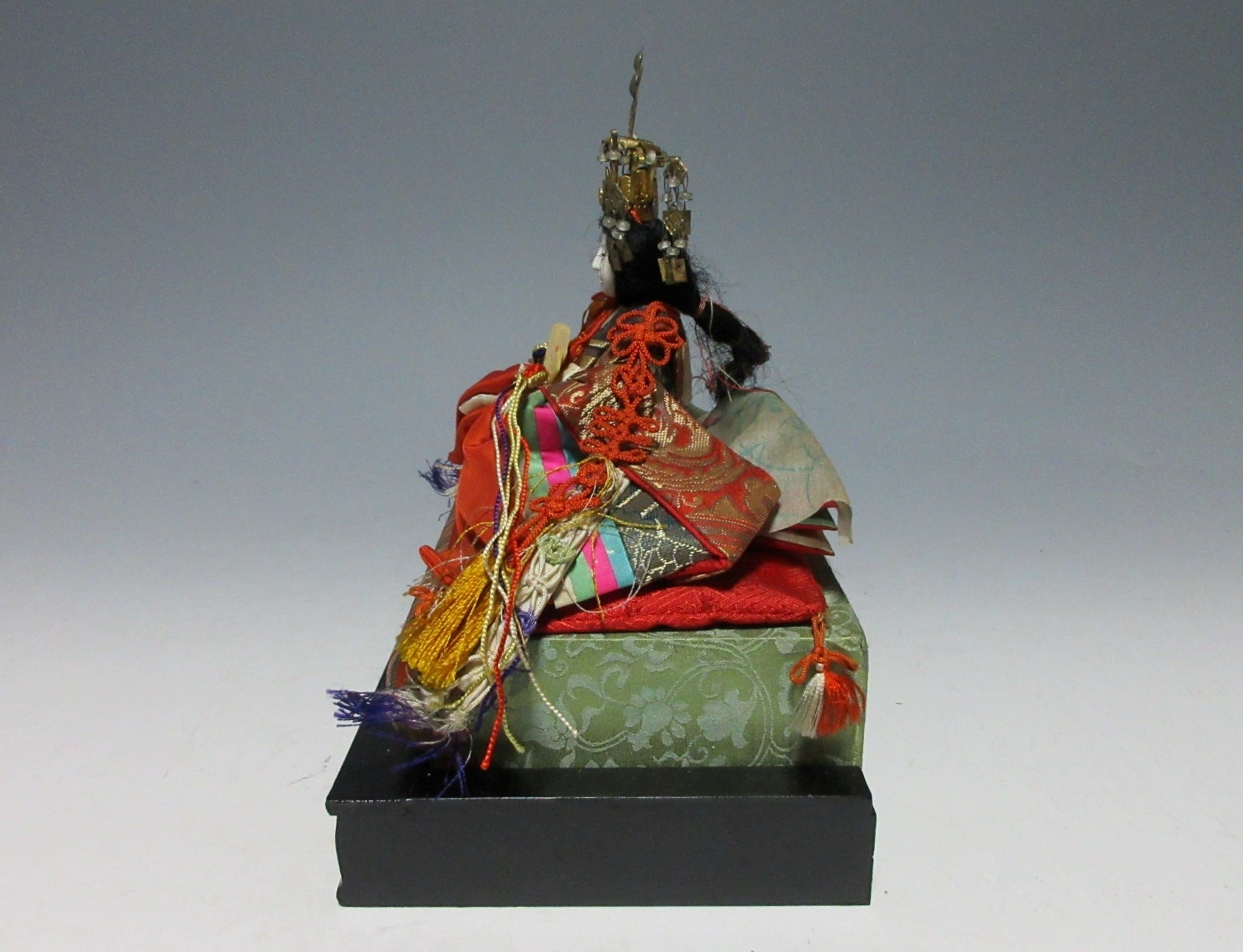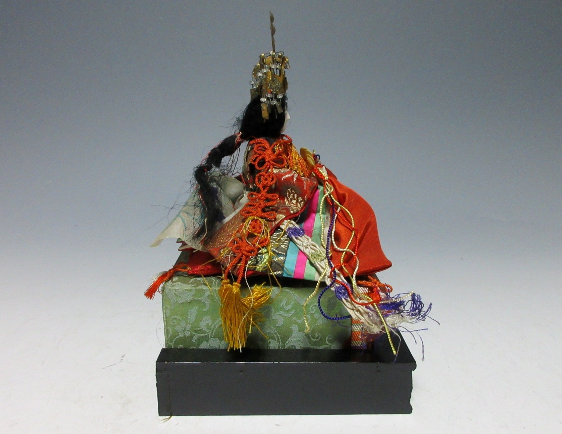 The wooden box is discoloured, spotty, has scratches/scuffing, the lid has loose nails and parts, but still slides in and out as it should. The lid also has gaps, and the nails at the back of the box are coming loose. There are little wooden nails on the interior of the box suggesting that there was perhaps a little shelf area in there. The clothes and hair belonging to the emperor is in great condition, the only noticeable thing is that the lacquer on the wooden stand is a little cloudy and his hair has a little wear. The empress’s hair is ‘messy’ and her scalp is showing under her crown. The tassels and small strings are messy however her clothes are in very good condition.