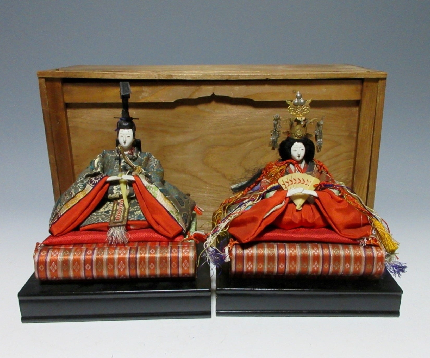 Hina ningyo are ornamental dolls displayed during the annual hina matsuri on March 3rd. This is a day to pray for young girl's growth and happiness, and most families with girls display these dolls and eat special kinds of food. The dolls are usually arranged on a five or seven-tiered stand covered with a red carpet. At the top are the Emperor and Empress. The next tier contains three court ladies, followed by the five musicians, then two imperial guards, and finally three servants ending the bottom row in a five-tiered display. The display also includes small pieces of furniture, small meal dishes, and little lanterns.