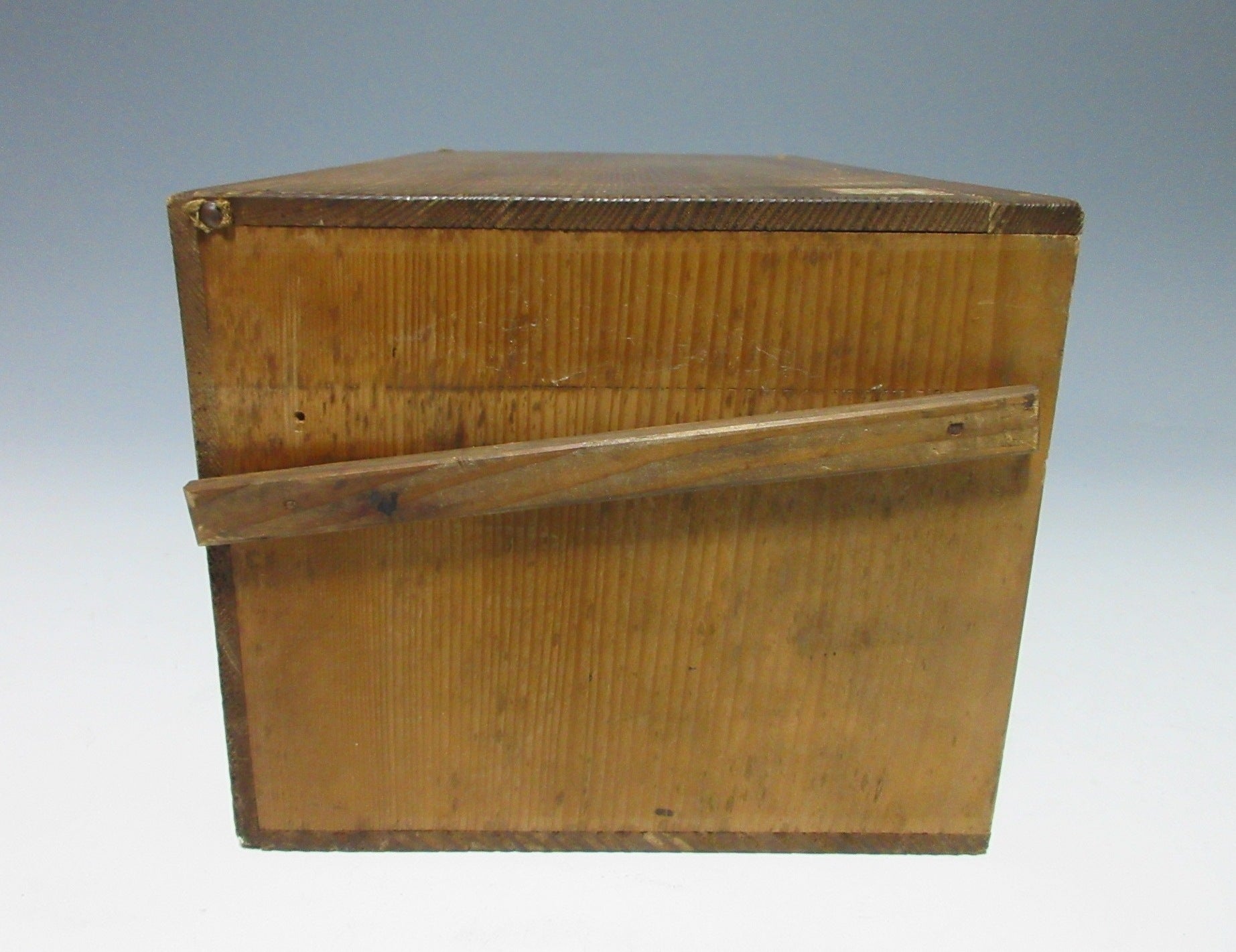 The wooden box is discoloured, spotty, and has scratches/scuffing. Also the wooden strip along the left side of the box is loose (please see the last photo). The faces of the dolls were covered so they are in beautiful condition. Their hair and clothing are also in great condition. The lacquer on the stands is a little cloudy and it has minor peeling in places (edges/corners). The small drum stand may have been glued at some stage, the tall drum has only very minor wear. There are two strips of wood in the box, they were probably attached to the box at some stage.
