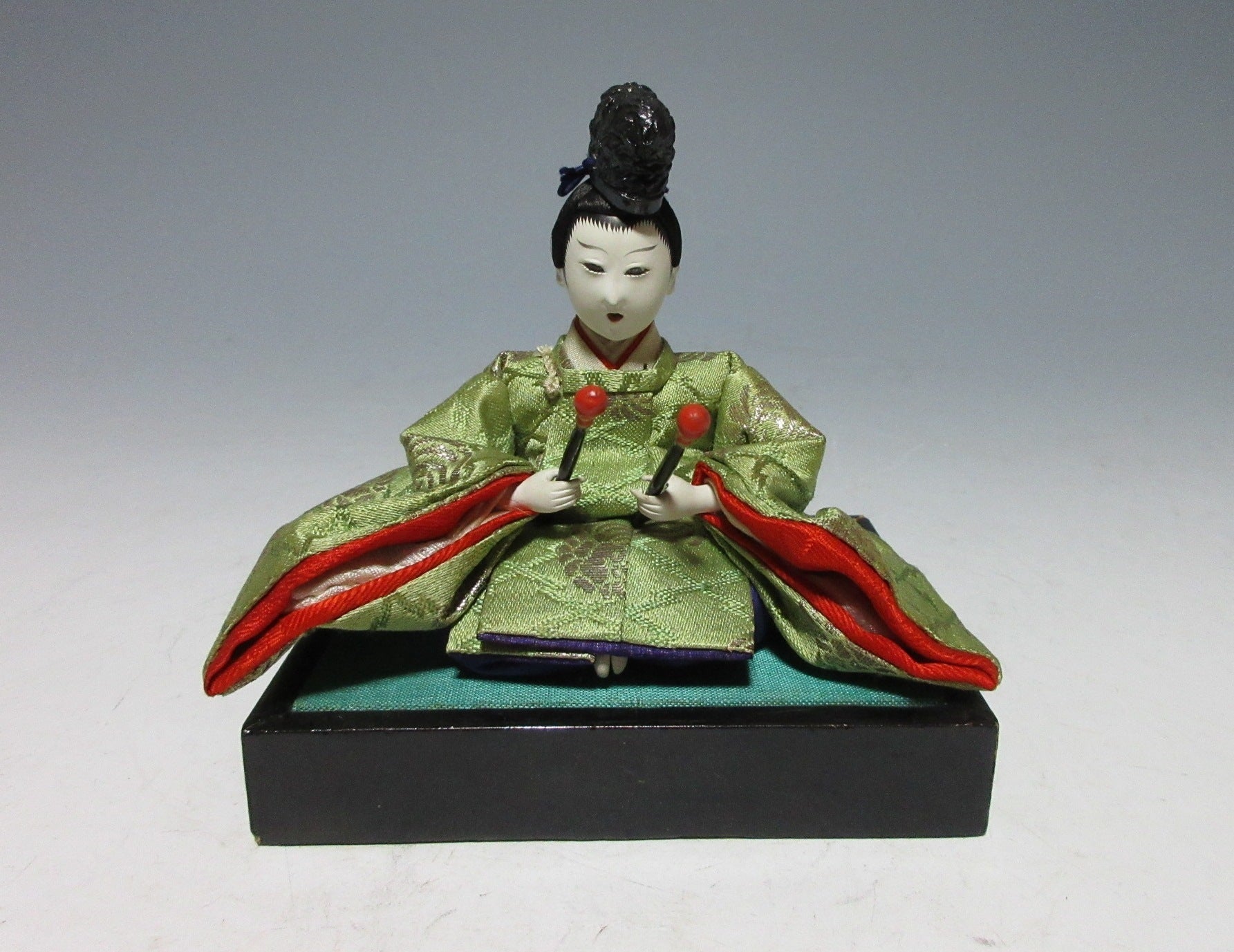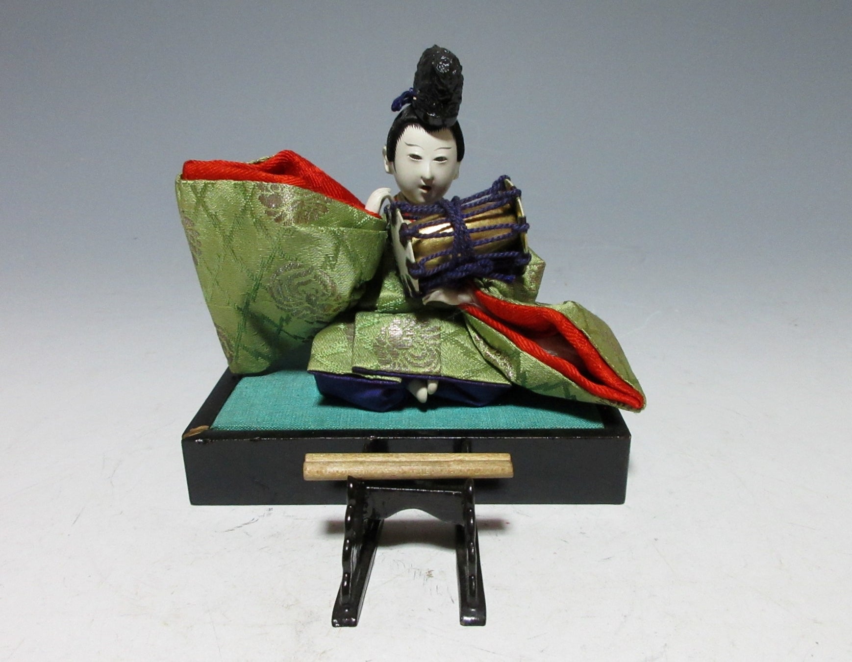 This listing is for a set of five Gonin-bayashi court musician dolls dating back to the early 1930s. They were created for Mitsukoshi Ginza Department store and belonged to a local family here in Setagaya in Tokyo. Their costumes are made of silk and are in excellent condition considering the age of the dolls. The dolls faces and limbs are painted with gofun pigment and their eyes are made of carved bone. Each doll is seated on a wooden stand decorated with lacquer. According to various blog entries these dolls were possibly made by Maruhei Ooki Doll shop in Kyoto. We had trouble arranging the dolls for photos, we couldn’t figure out which instruments belonged to whom. The wooden drum sticks we think don’t fit in any of the dolls hands, so we’re not sure if they’re simply placed with the drum or not. Some doll displays have the drum placed on the shoulder of the doll, however this set has a drum stand so we assume the drum is displayed there, and therefore we still don’t know where the drumsticks belong. Those of you who are more knowledgeable about hina displays will no doubt be able to set the dolls up correctly. The dolls come with their original wooden storage box and their faces were wrapped in soft gauze for protection. They were very well taken care of.