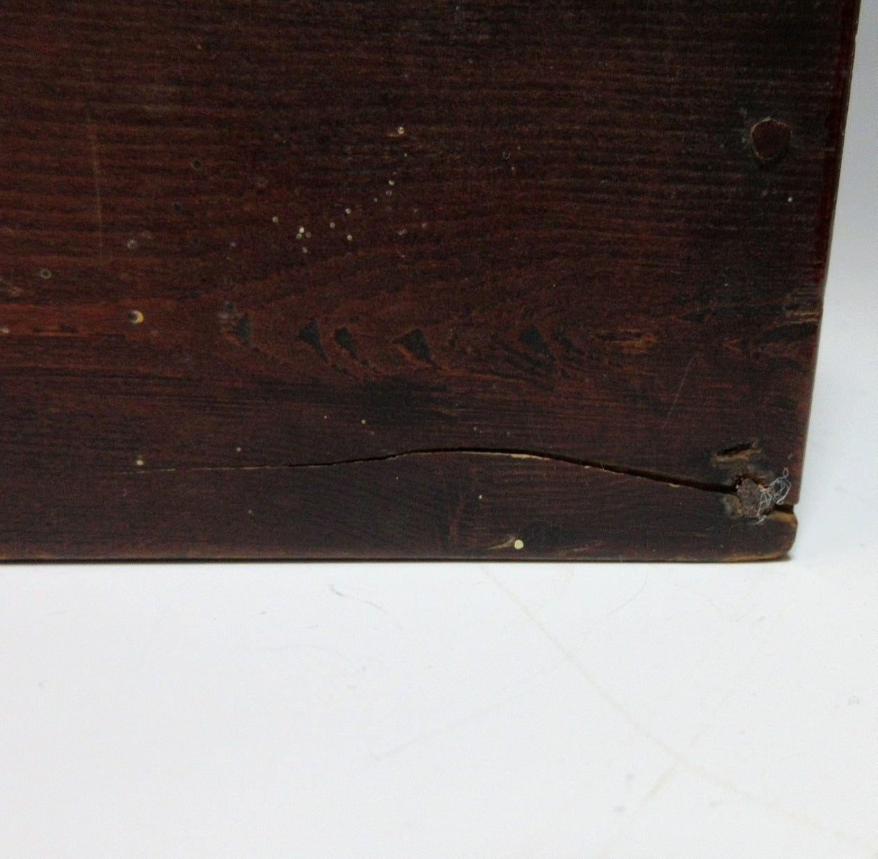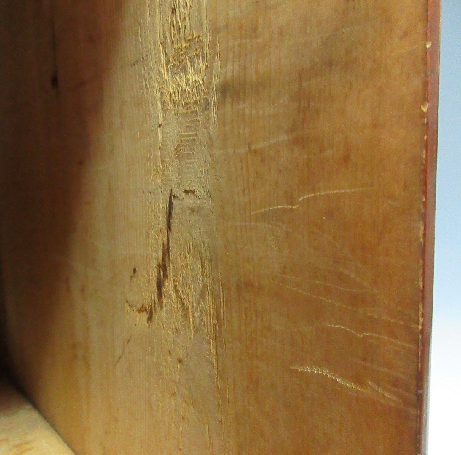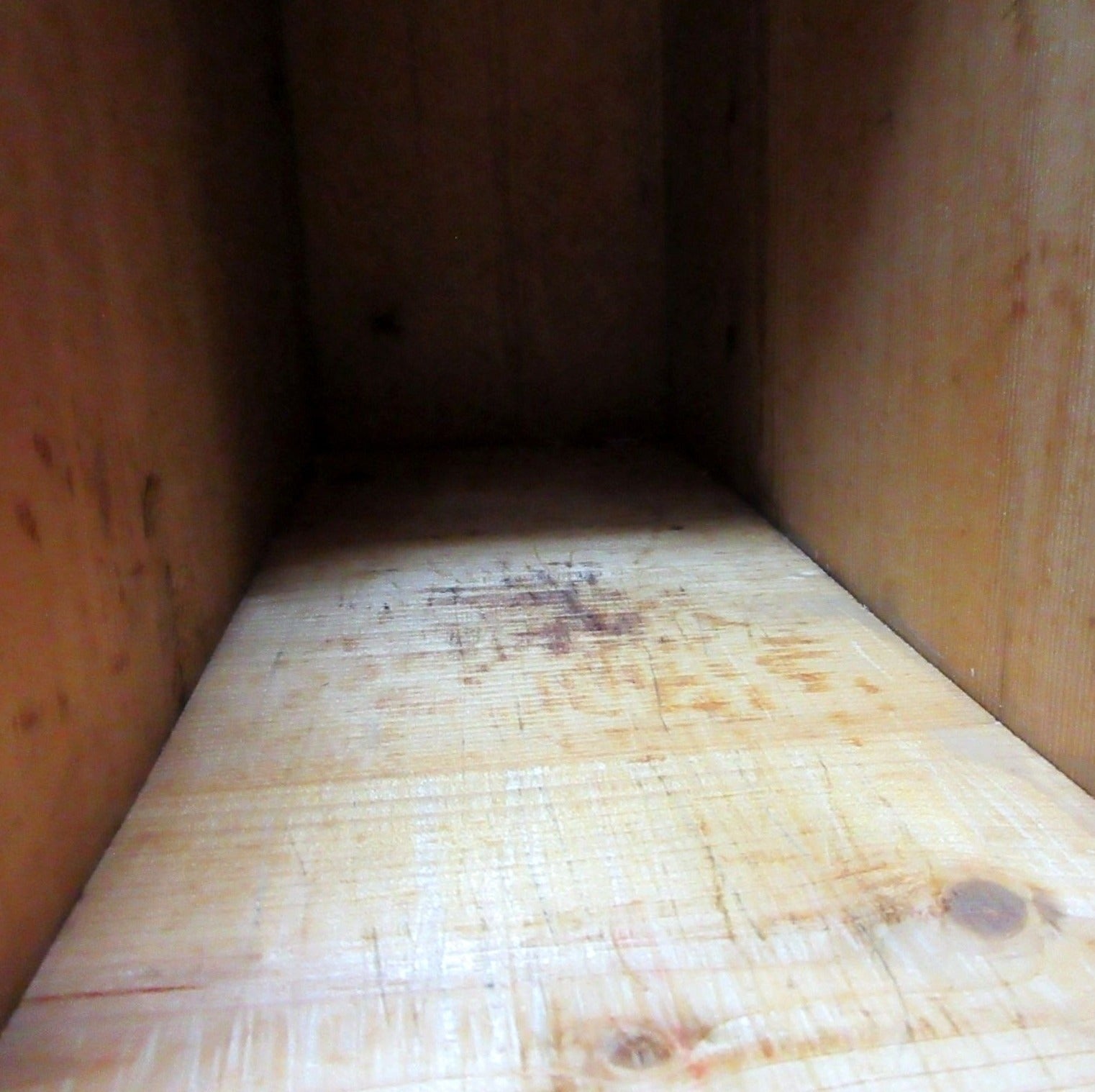 It’s in decent condition aside from some marks on the interior, some worn lacquer along the edges, the left side back corner and left side front corner is loose, there’s some wear on bottom and back where it was hung, many scratches on the back, and the lacquer on the top and back are dull/cloudy and darker in colour.