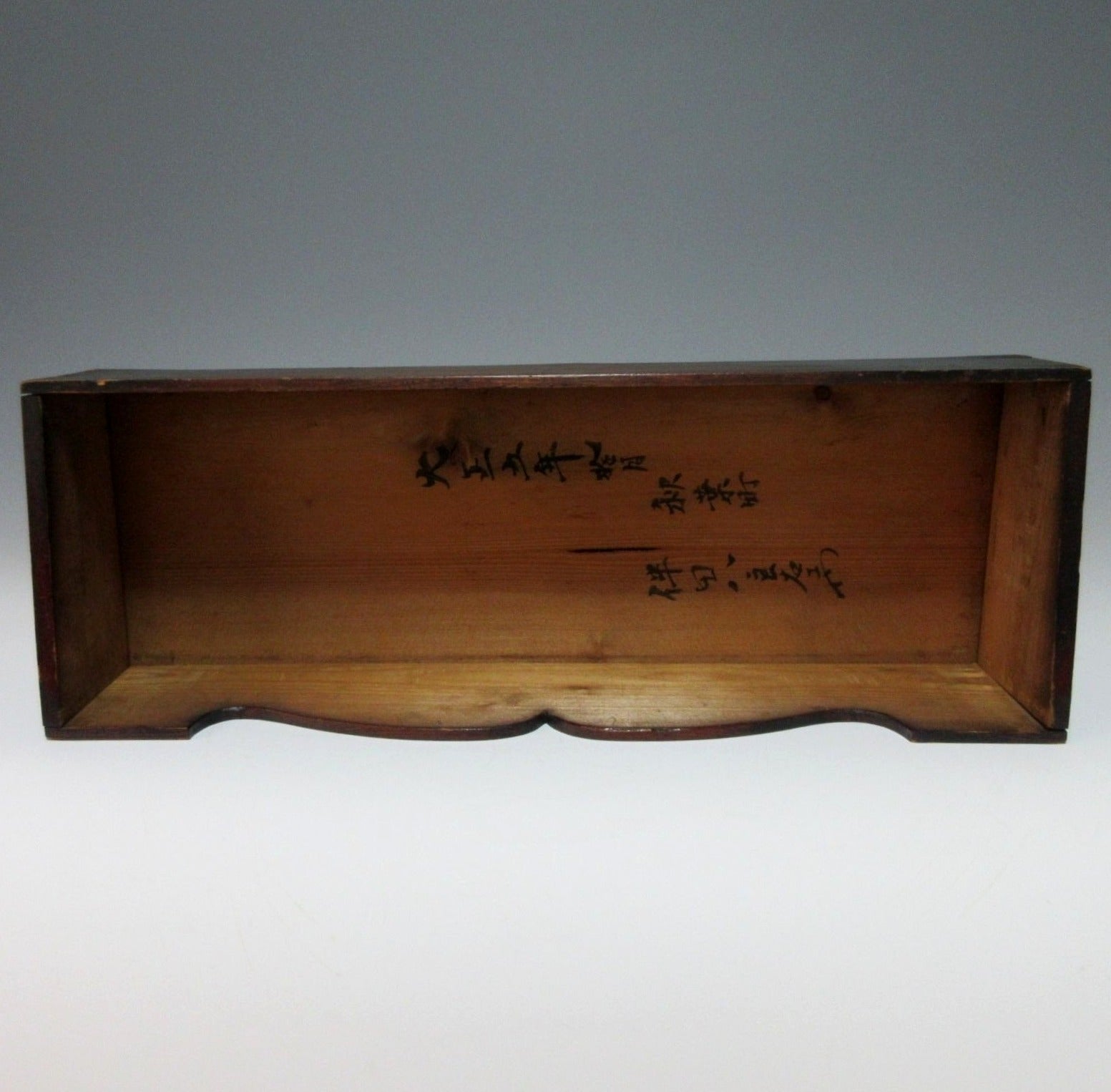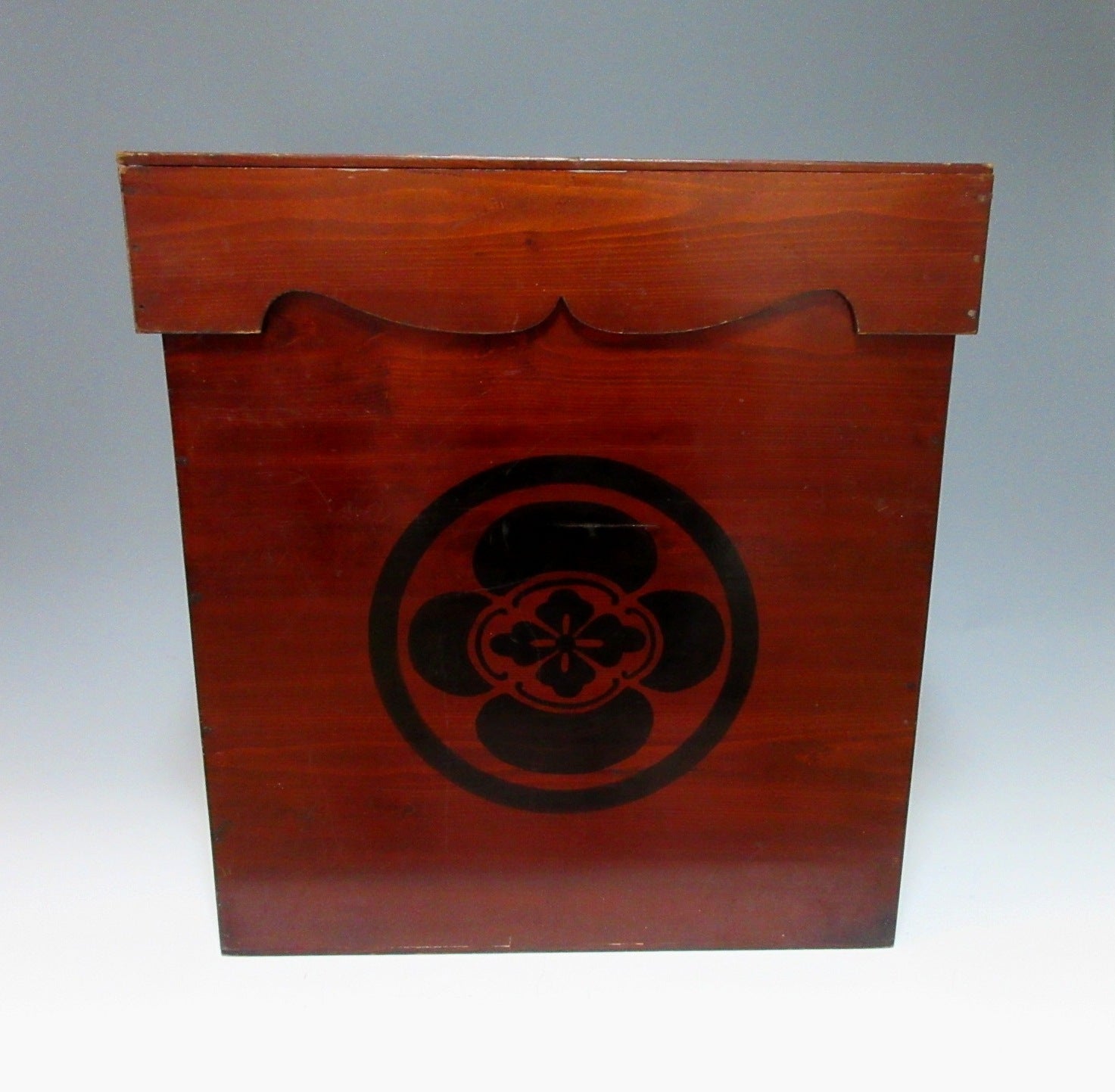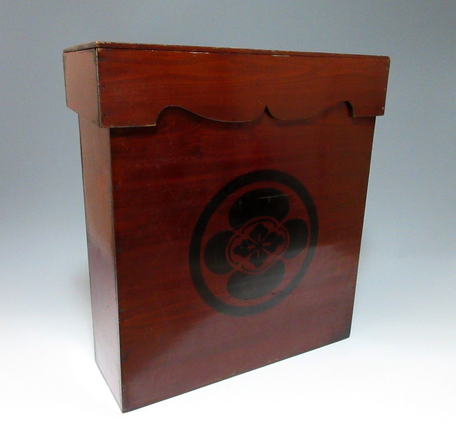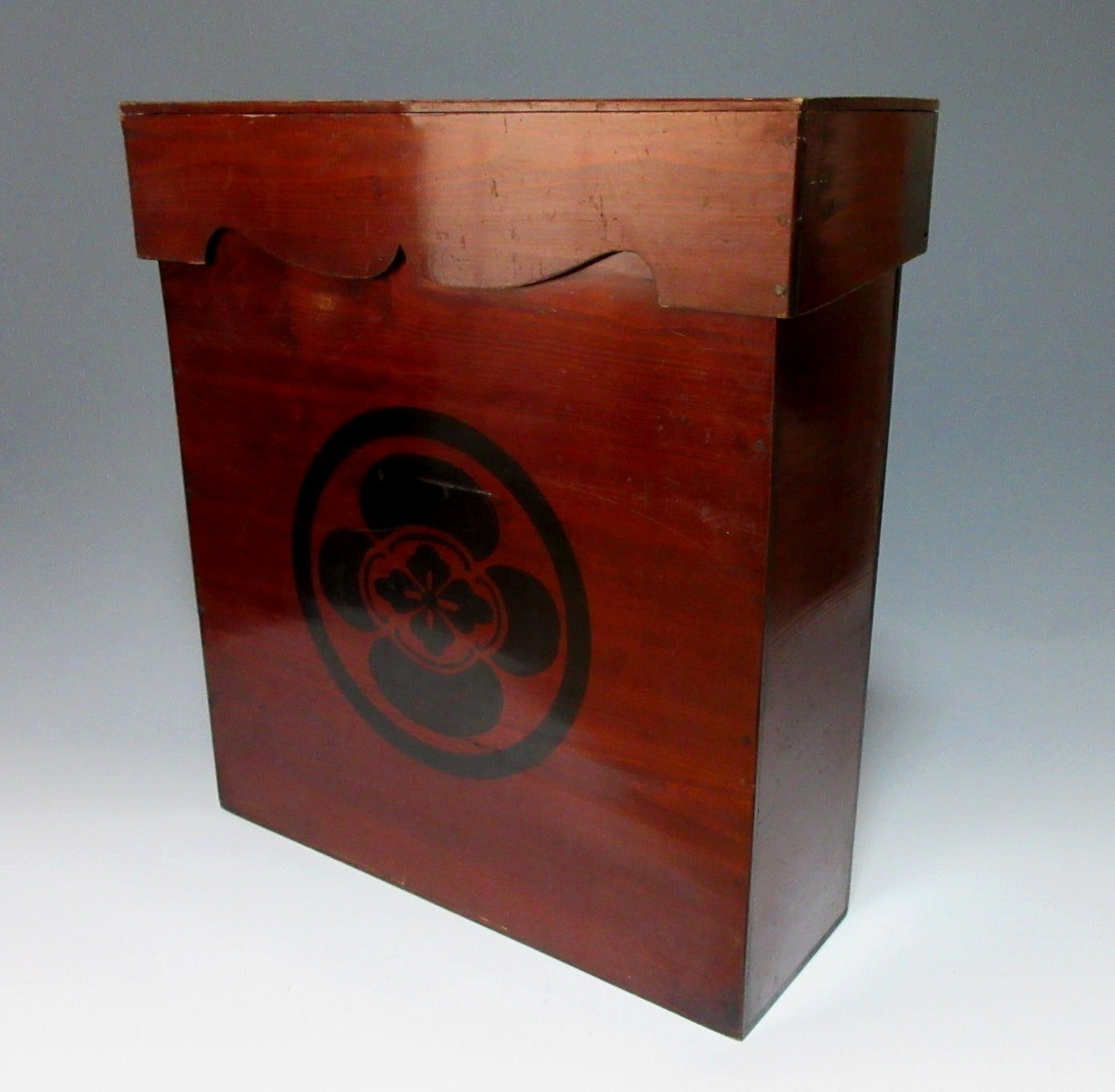 This listing is for an antique chochin paper lantern storage box dated Taisho 5 (1916). It is made of lacquered wood and the front features a kamon family crest. During the Edo period, it was forbidden to walk without lights at night, so every house had to be equipped with portable lanterns. Each household hung a wooden box decorated with their family crest on the wall, and they stored their lanterns in there. Even now there are still some old folk houses dating back to the Edo-Taisho periods with these wooden boxes tucked away or hanging on their wall. This particular box came from an old house in Niigata. The owner’s name and district is written under the lid, as well as the date. It’s still in usable condition and would make a great piece of décor. Please read below regarding the condition.