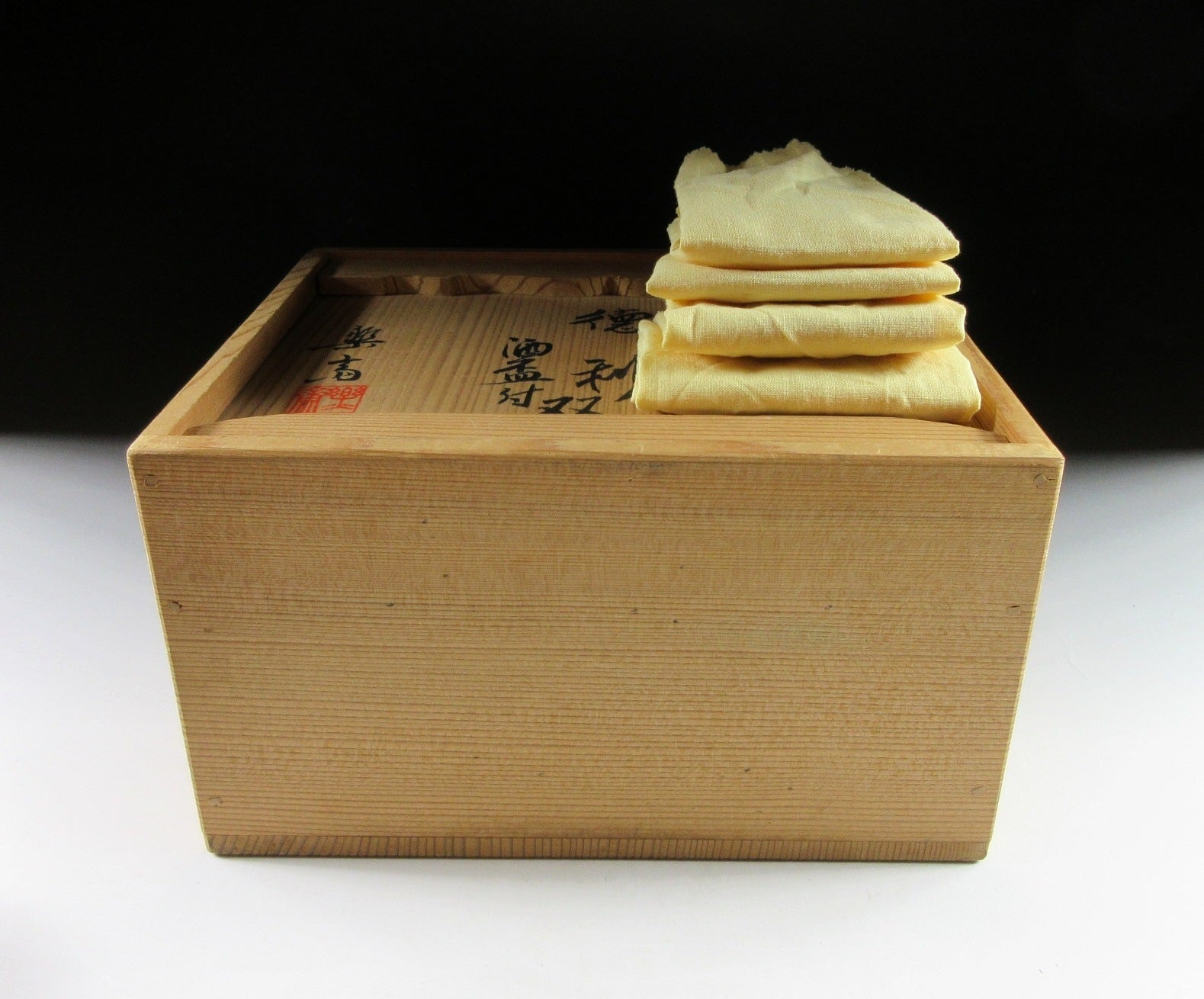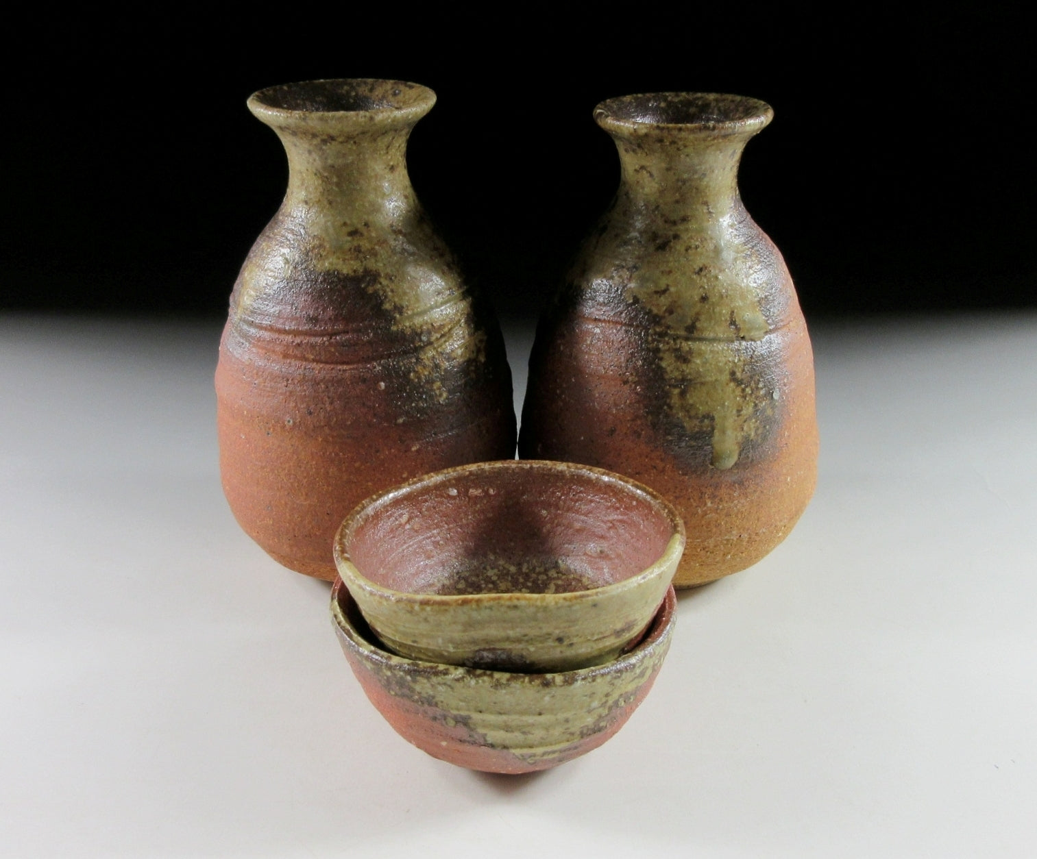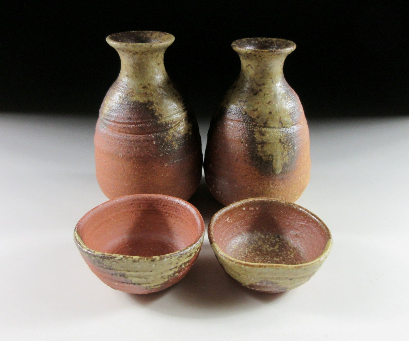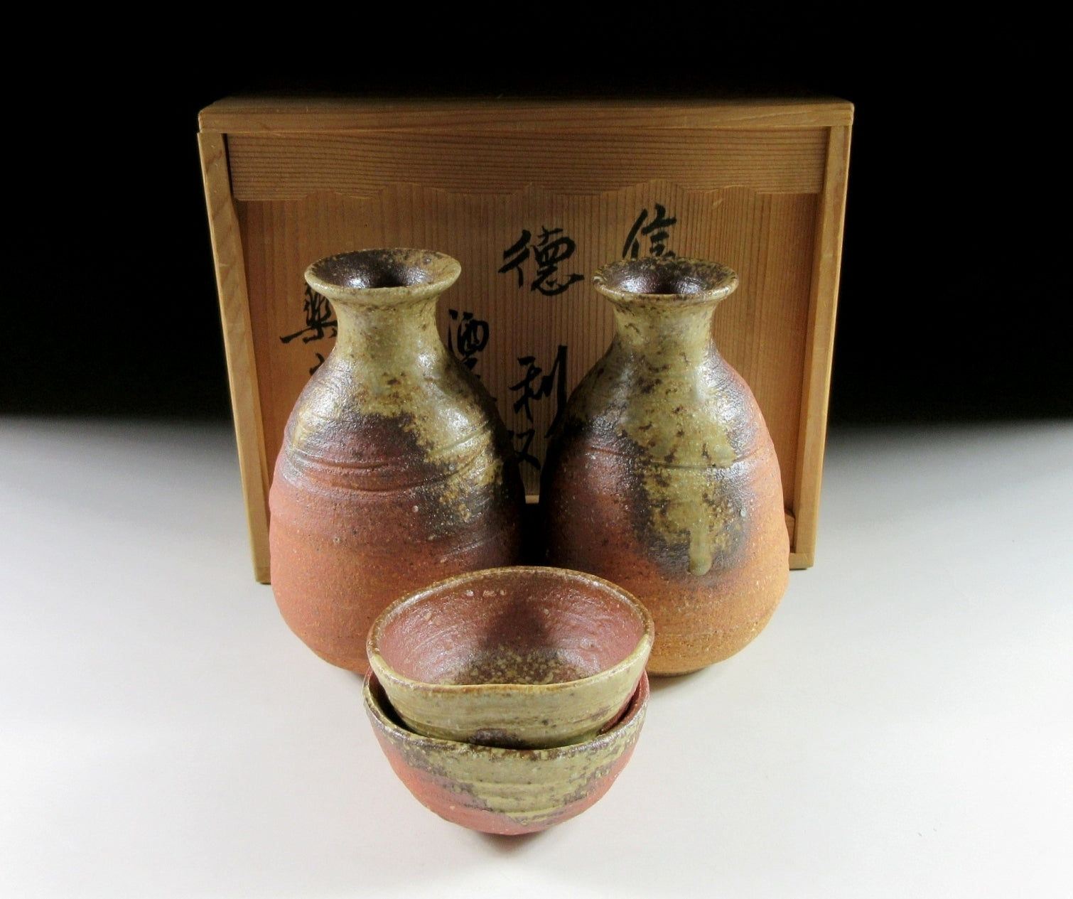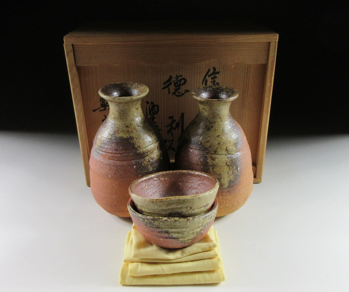 This listing is for a Shigaraki sake set made around 10 years ago by the highly esteemed potter Takahashi Rakusai IV. The set consists of two tokkuri and two matching sake cups. Each piece is wood-fired and the front features a generous coating of natural ash glaze, the unglazed parts are scorched a deep reddish-brown colour. This set is ideal for special occasions or to give as a gift. The signature of the potter can be found on the bottom of each piece (except the bottom of one cup), and it comes with its original signed wooden storage box. It also comes with four yellow wrapping cloths for when the items are not in use.