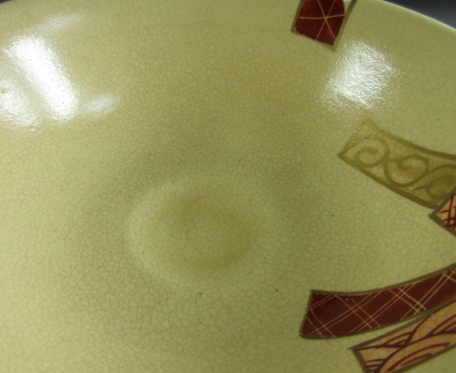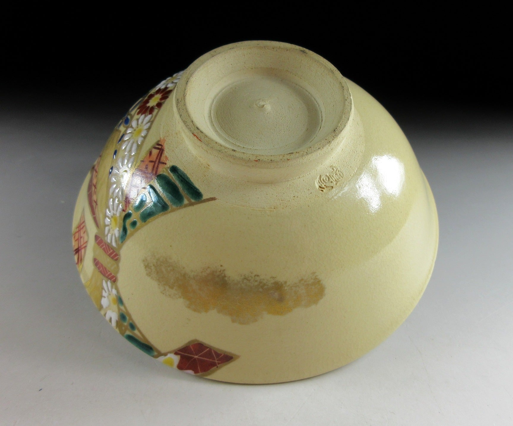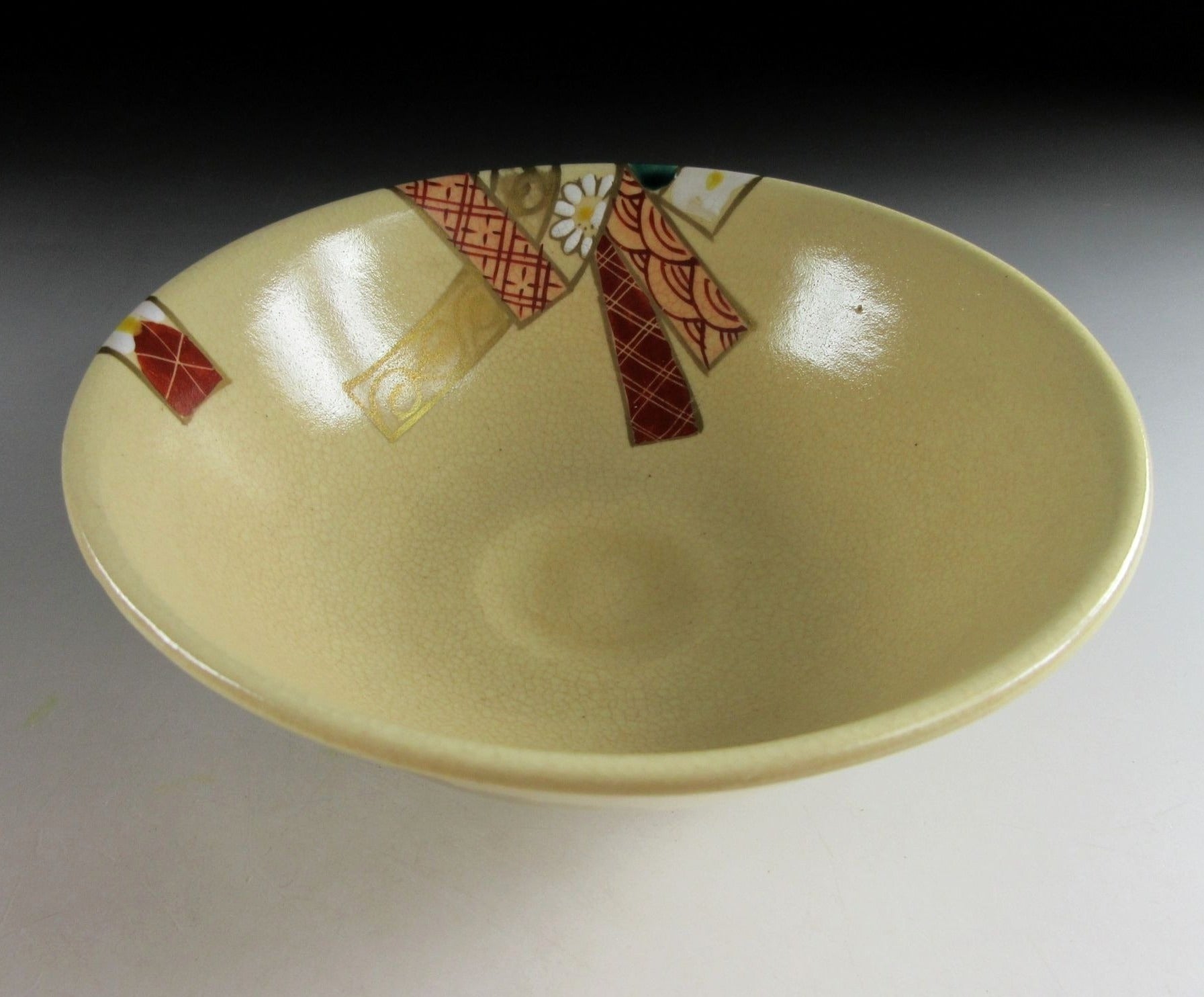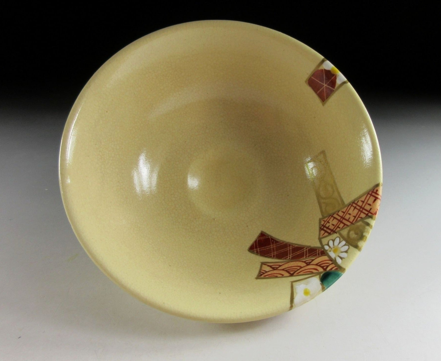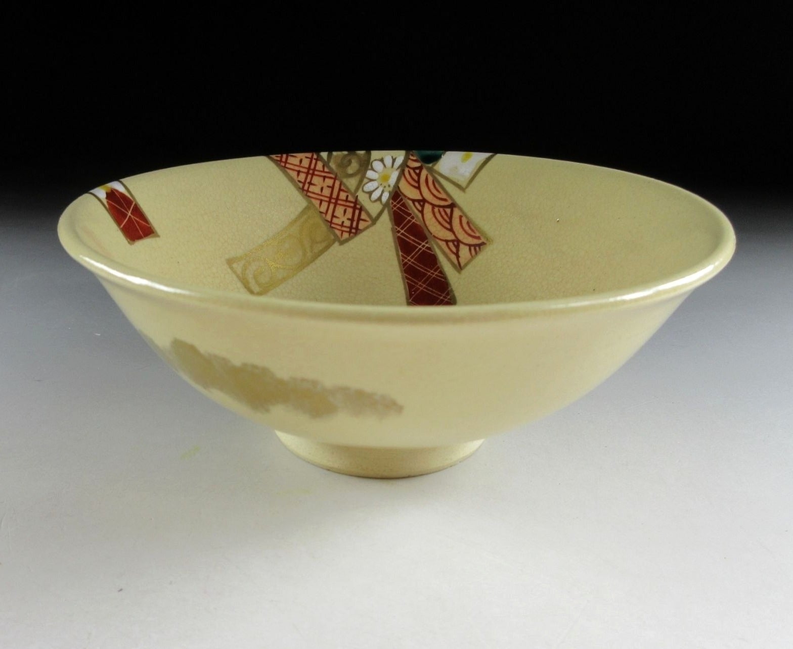 This listing is for a Kyo-ware hira chawan made around 20-30 years ago by Takano Seiho. It is wheel-thrown and the flat hira type used during the summer season. Hira chawan are shallow bowls with low sides designed to cool tea down faster. The bowl in this listing is decorated with a beautiful knot pattern. The first knot pattern appeared during the Edo period when Ninsei presented the Ikeda clan with a splendid knot pattern kogo. Since then it has been used to decorate all kinds of wares from tea bowls to textiles. The stamp of the potter can be found on the bottom, sorry no box for this one.