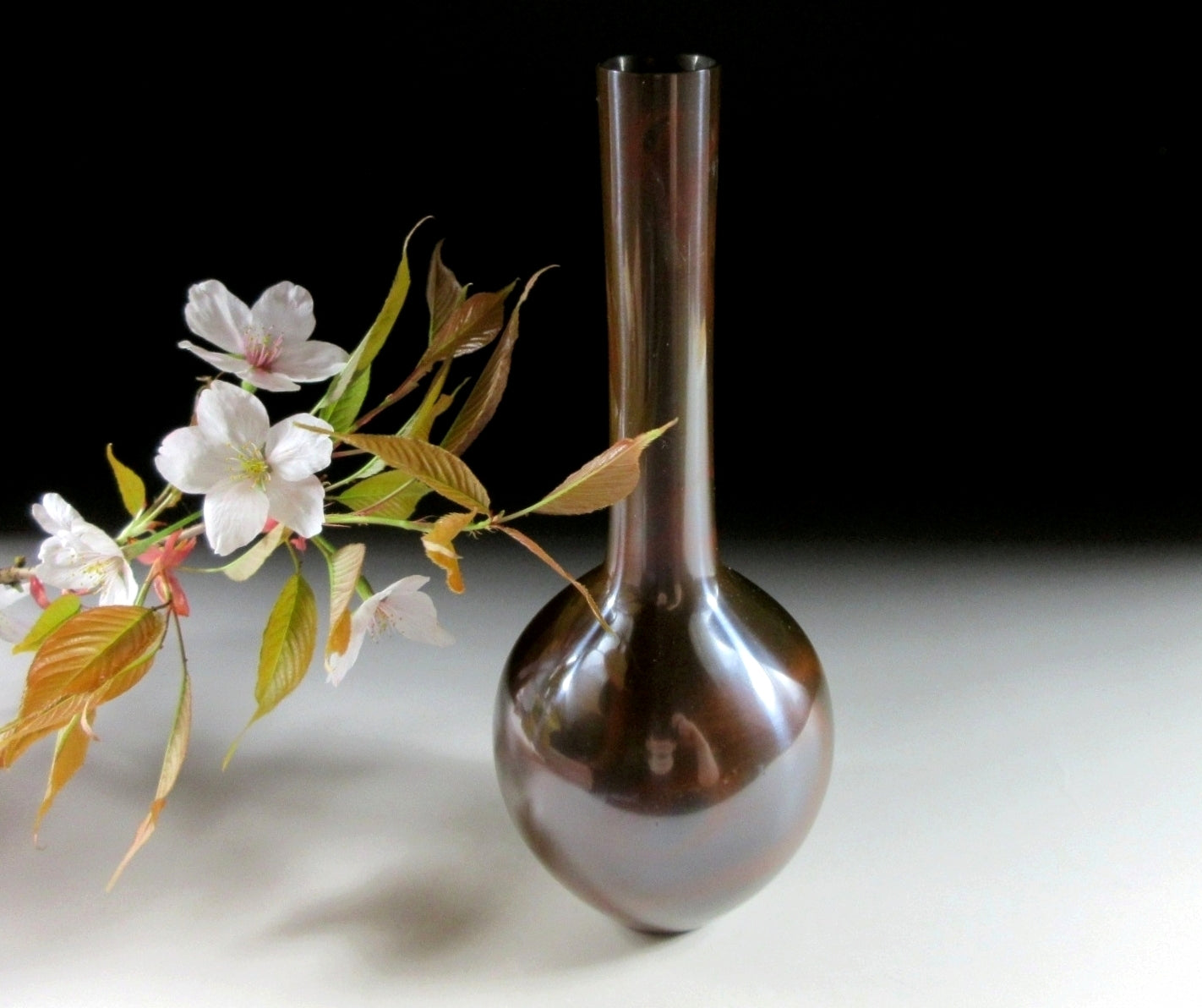 This listing is for a copper vase made about 30 years ago. The colour is mainly brown and its shape is elegant and slender. This shape was favoured by Sen no Rikyu and has been appreciated by tea and chabana enthusiasts for the past 400 years. It was made by one of the leading copperware producers in Japan, and would suit a wide range of interiors. The stamp of the craftsperson can be found on the bottom.