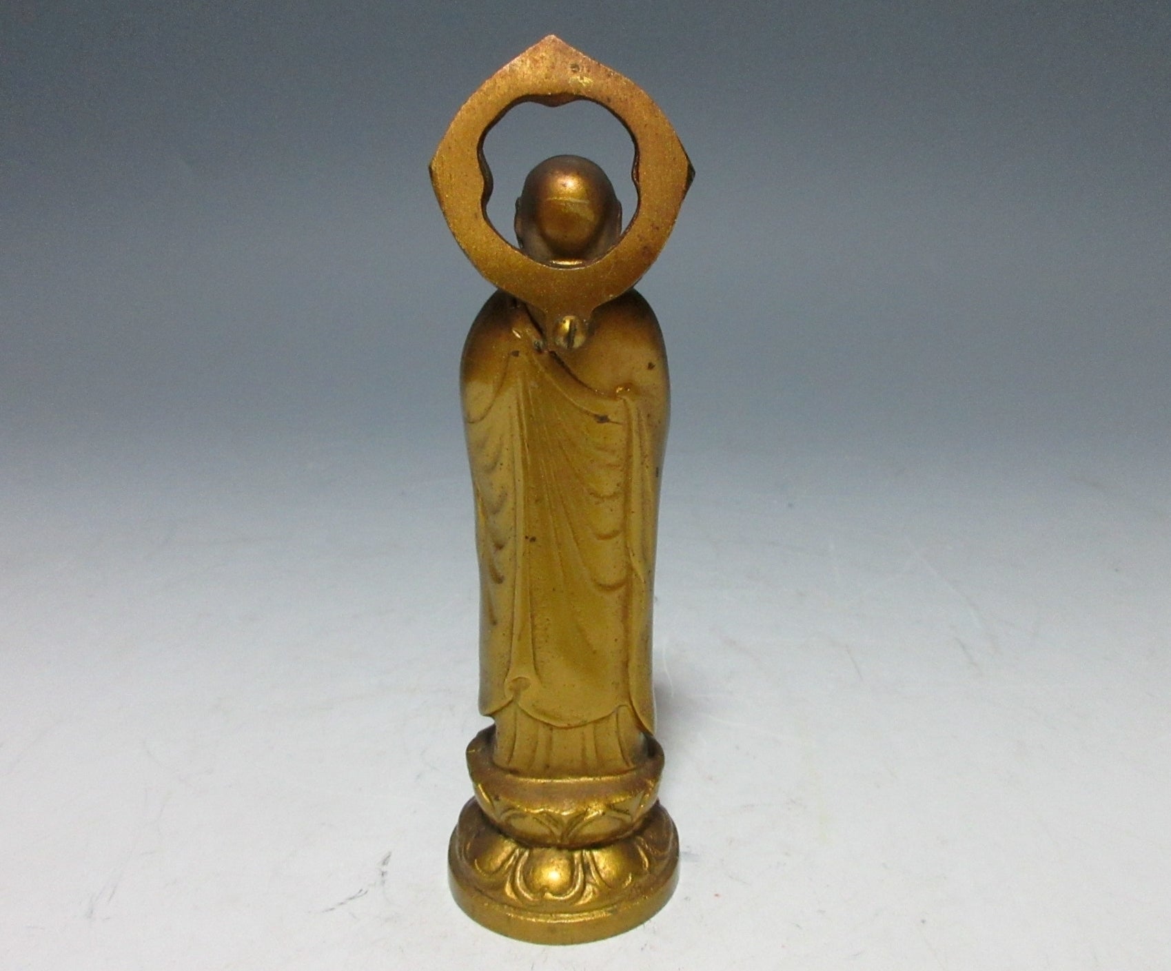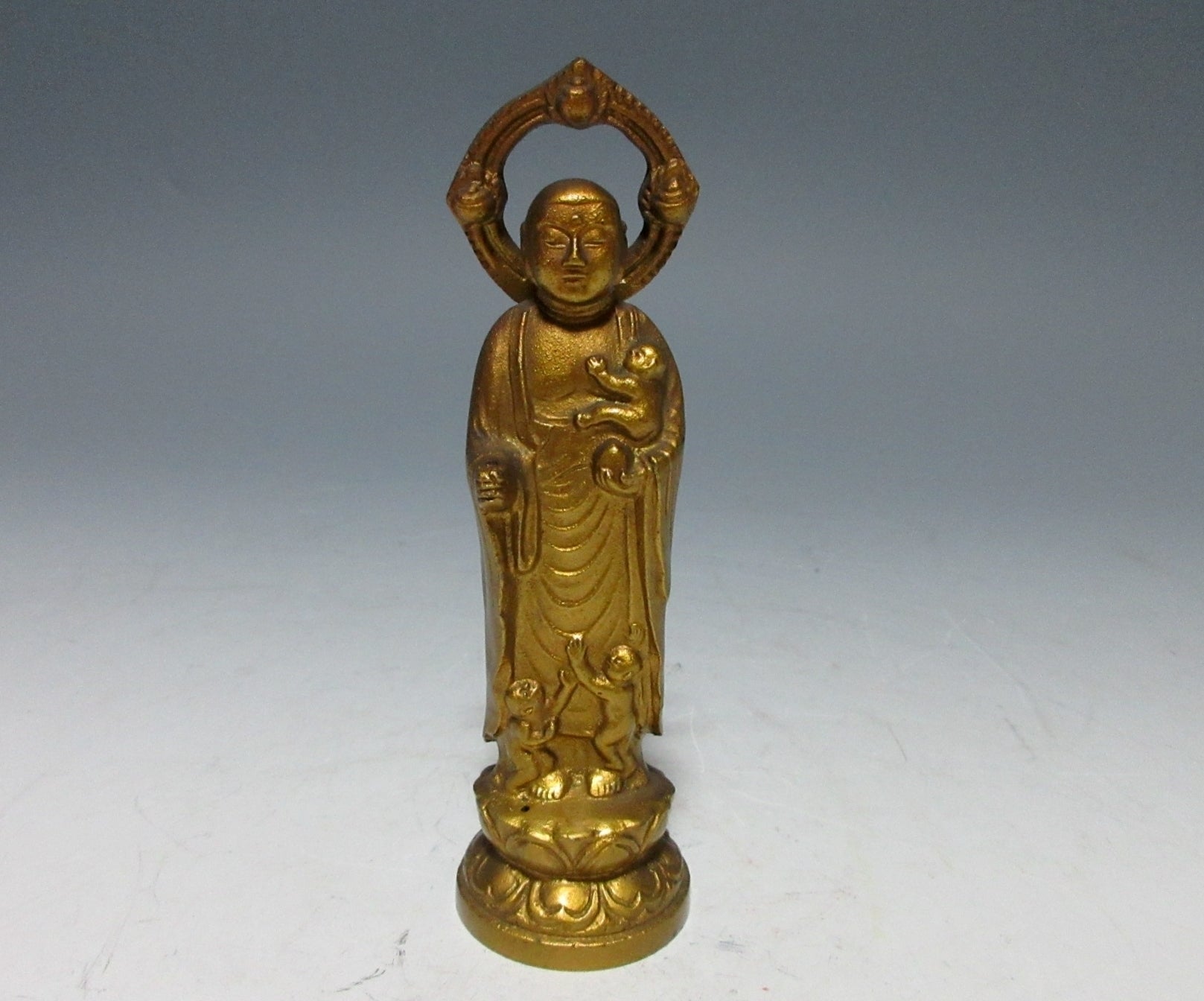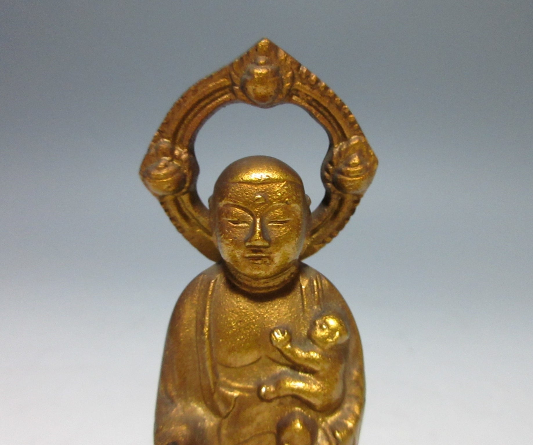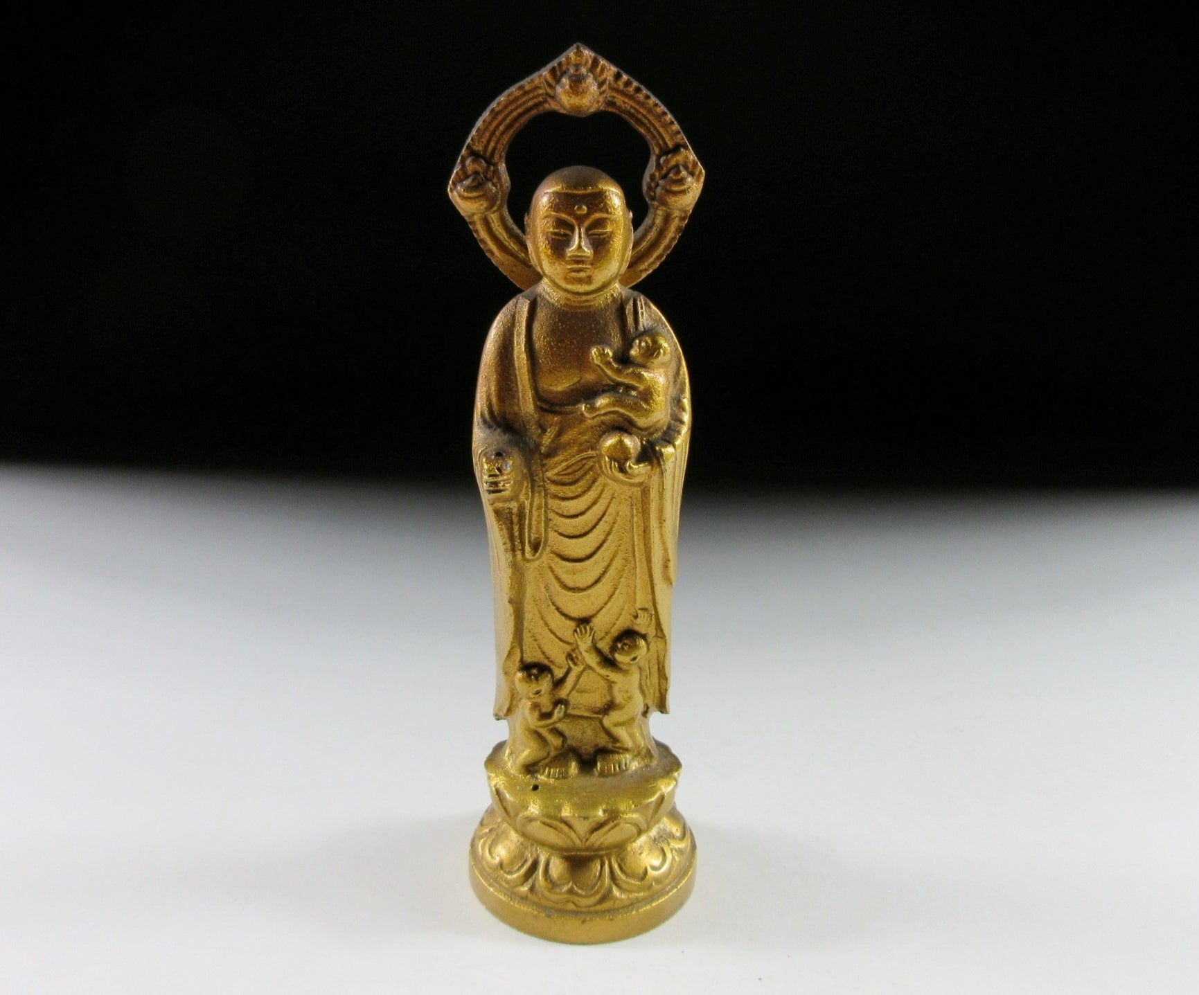 This listing is for a Takaoka copperware Jizo Bosatsu made around 30-40 years ago by Zenyu. It is made of zinc alloy and depicts Jizo as an itinerant monk in robes. In his hands he usually carries a staff to announce his coming, and a hoju wish-fulfilling jewel to light up the darkness. He is mounted on a lotus pedestal, and just behind his head sits a halo adorned with hoju jewels. The signature of the craftsperson can be found on the bottom.