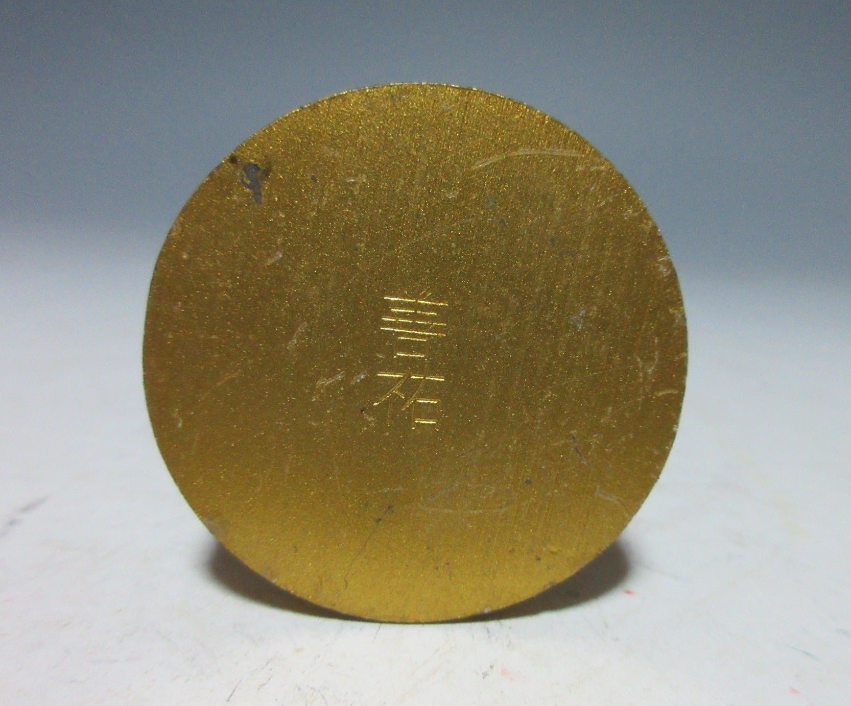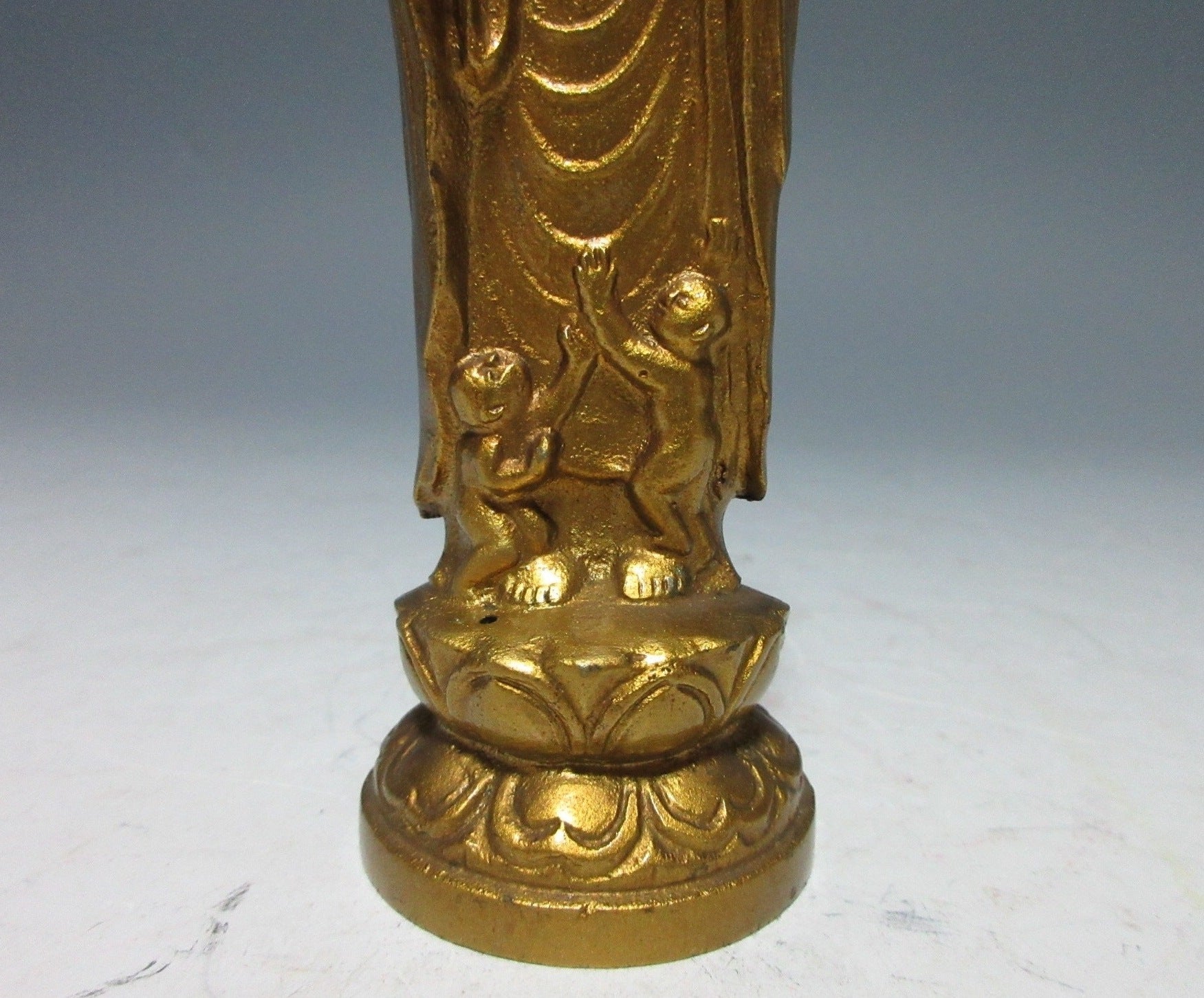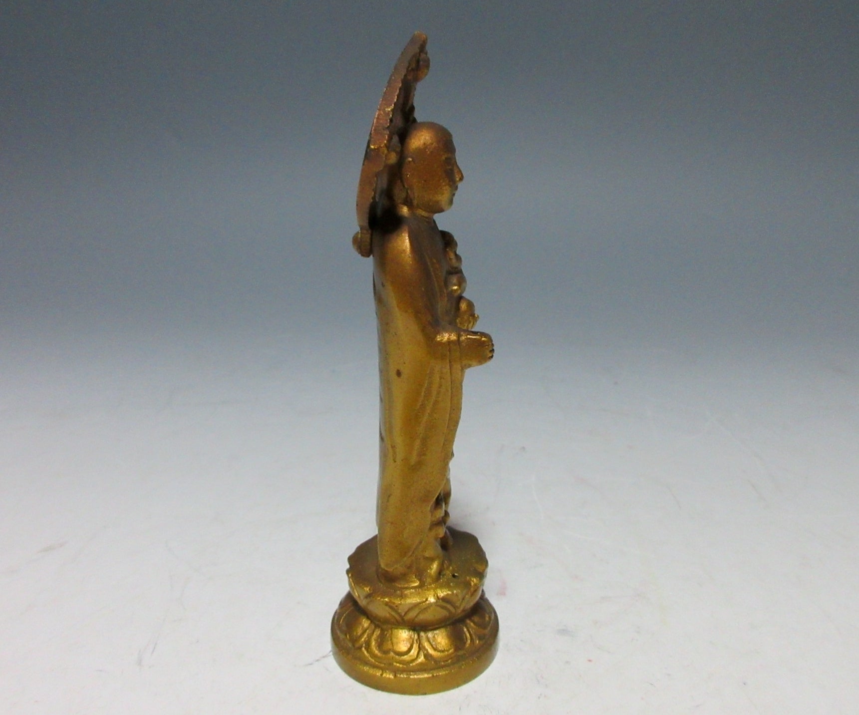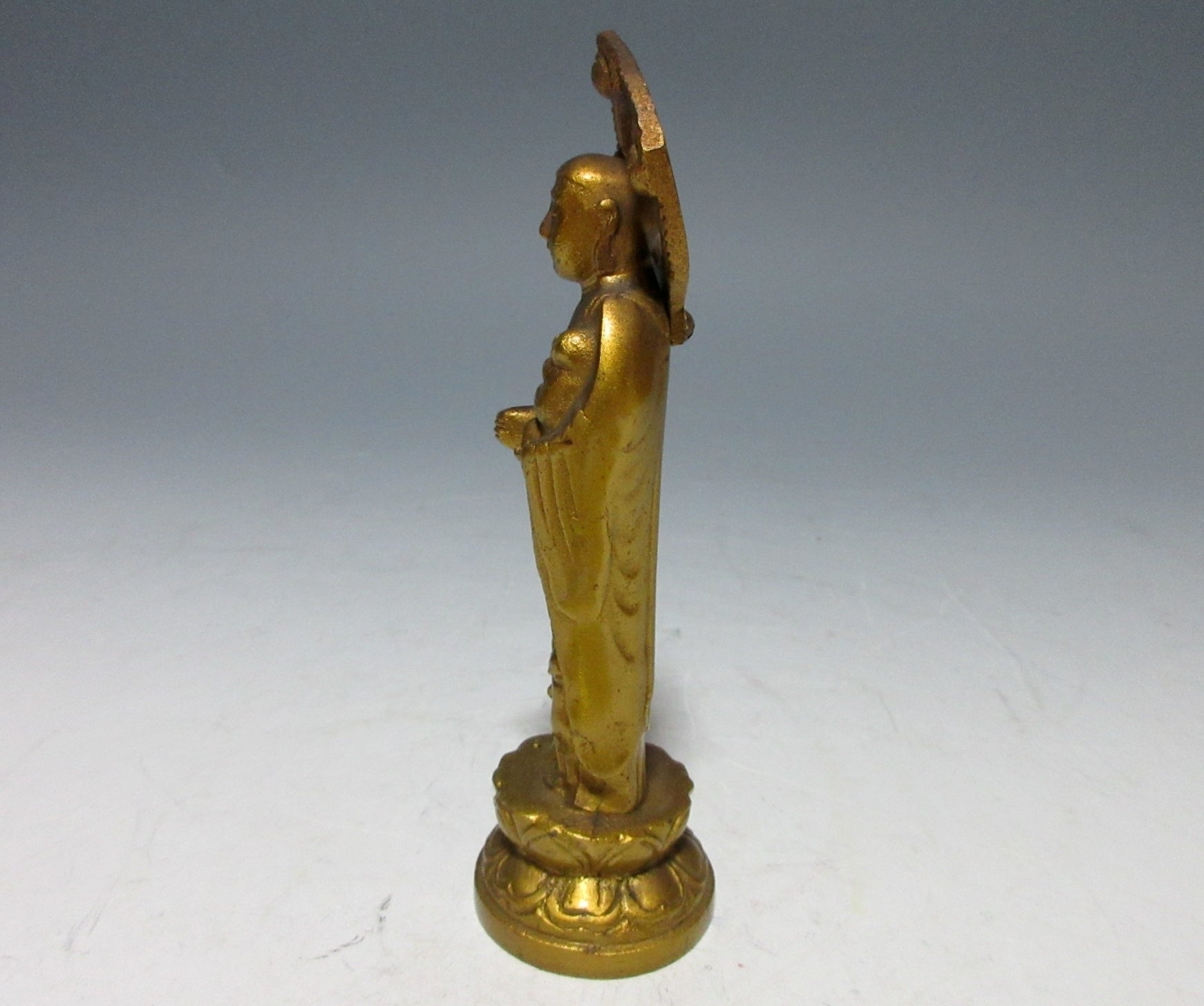 This listing is for a Takaoka copperware Jizo Bosatsu made around 30-40 years ago by Zenyu. It is made of zinc alloy and depicts Jizo as an itinerant monk in robes. In his hands he usually carries a staff to announce his coming, and a hoju wish-fulfilling jewel to light up the darkness. He is mounted on a lotus pedestal, and just behind his head sits a halo adorned with hoju jewels. The signature of the craftsperson can be found on the bottom.