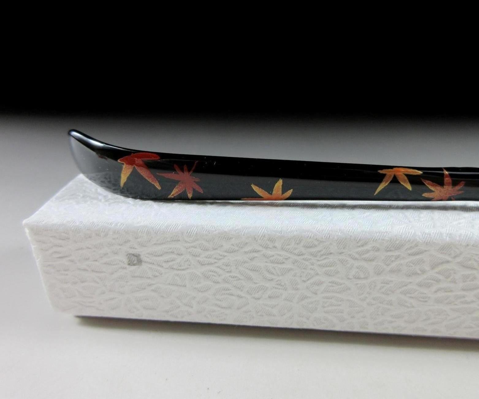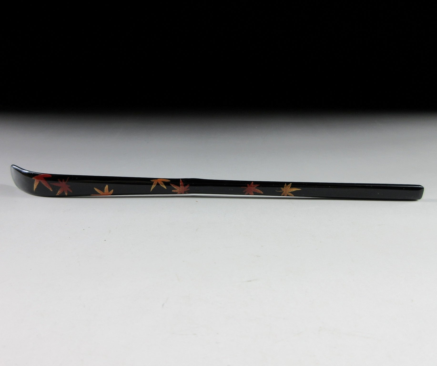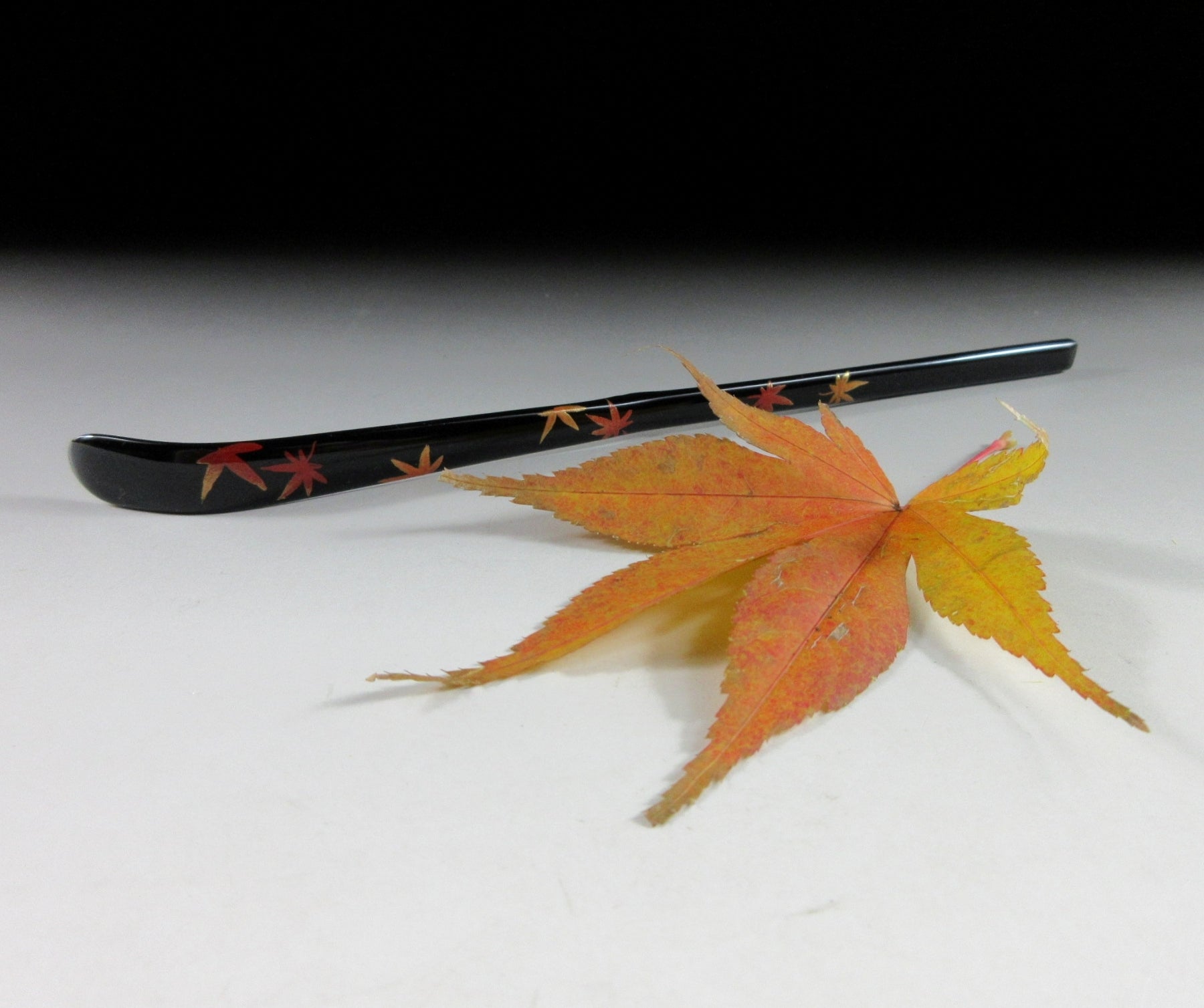 This listing is for a lacquered Takayama bamboo chashaku. Chashaku are an essential item for traditional Japanese tea ceremony, they are used for the measuring and preparation of matcha tea. The back of the chashaku in this listing is coated in black lacquer decorated with a ‘momiji’ pattern, whilst the front maintains a natural finish. Momiji leaves have been depicted in Japanese art, poetry, and literature for thousands of years. Many traditional Japanese works of art and poems are about the cool wind gently blowing fresh green kaede leaves in summer, or the falling of maple leaves in late autumn. This piece is ideal for autumn tea practice and comes with its original paper storage box.