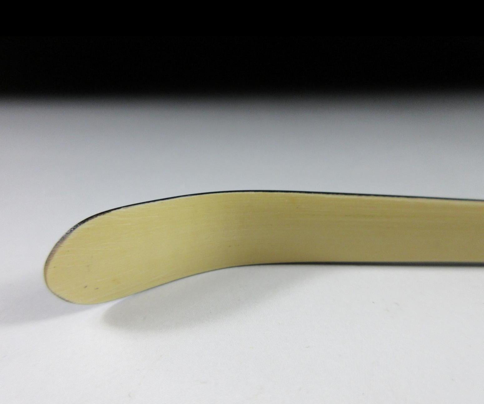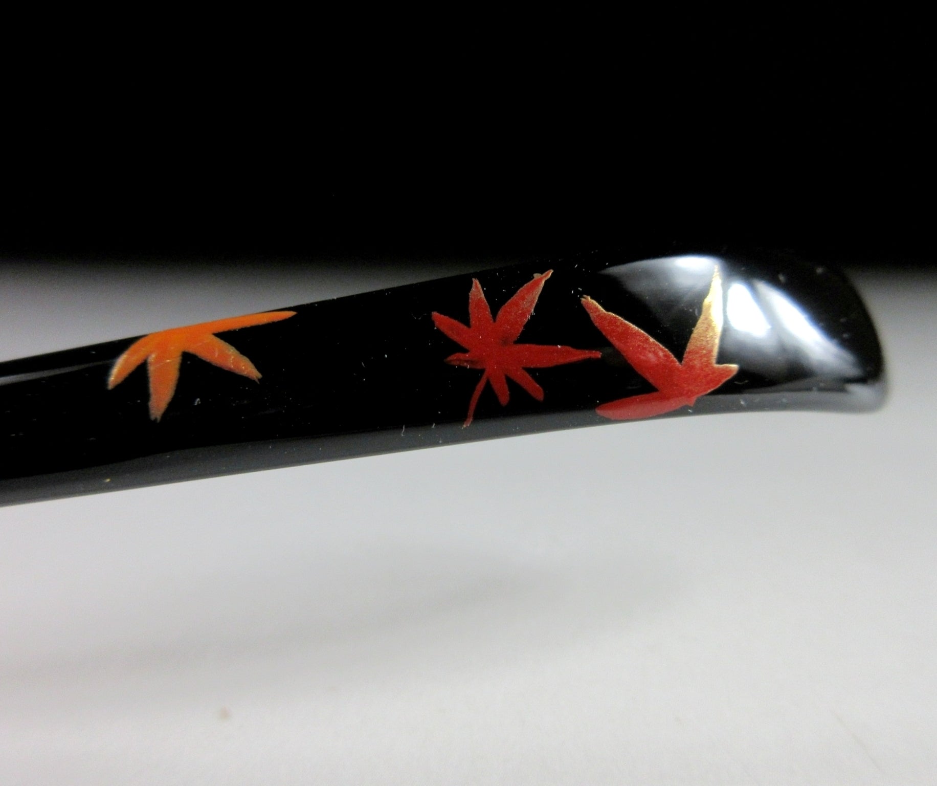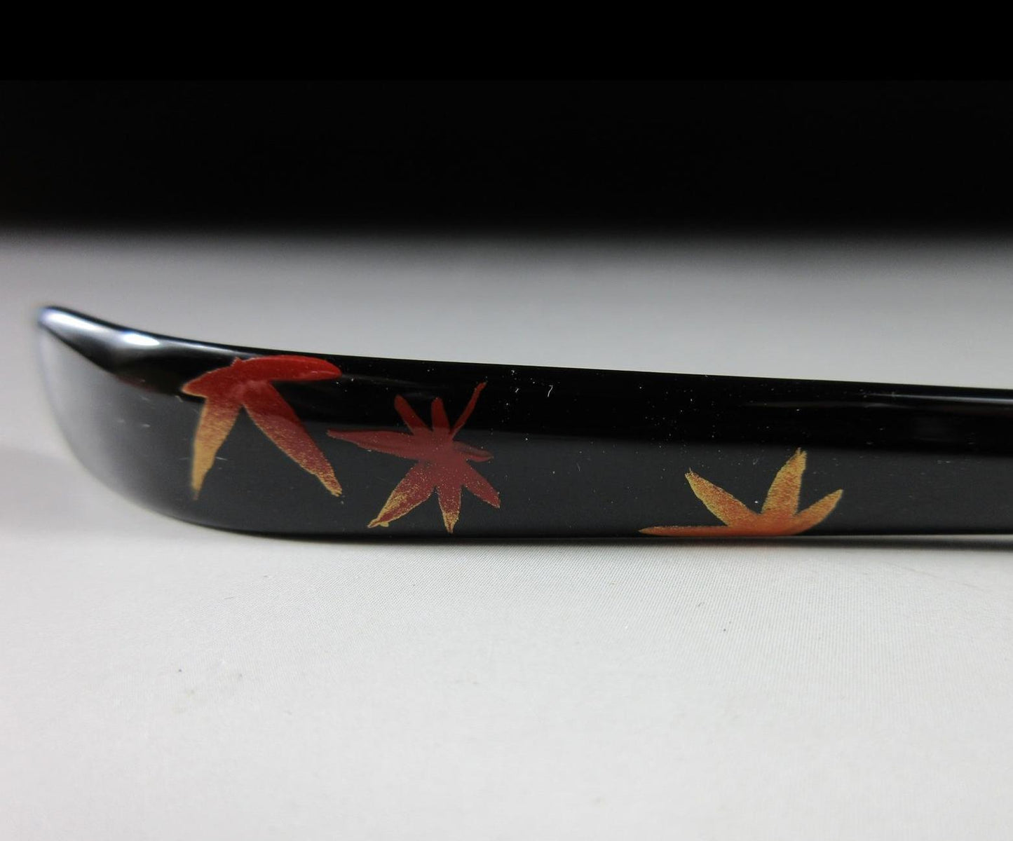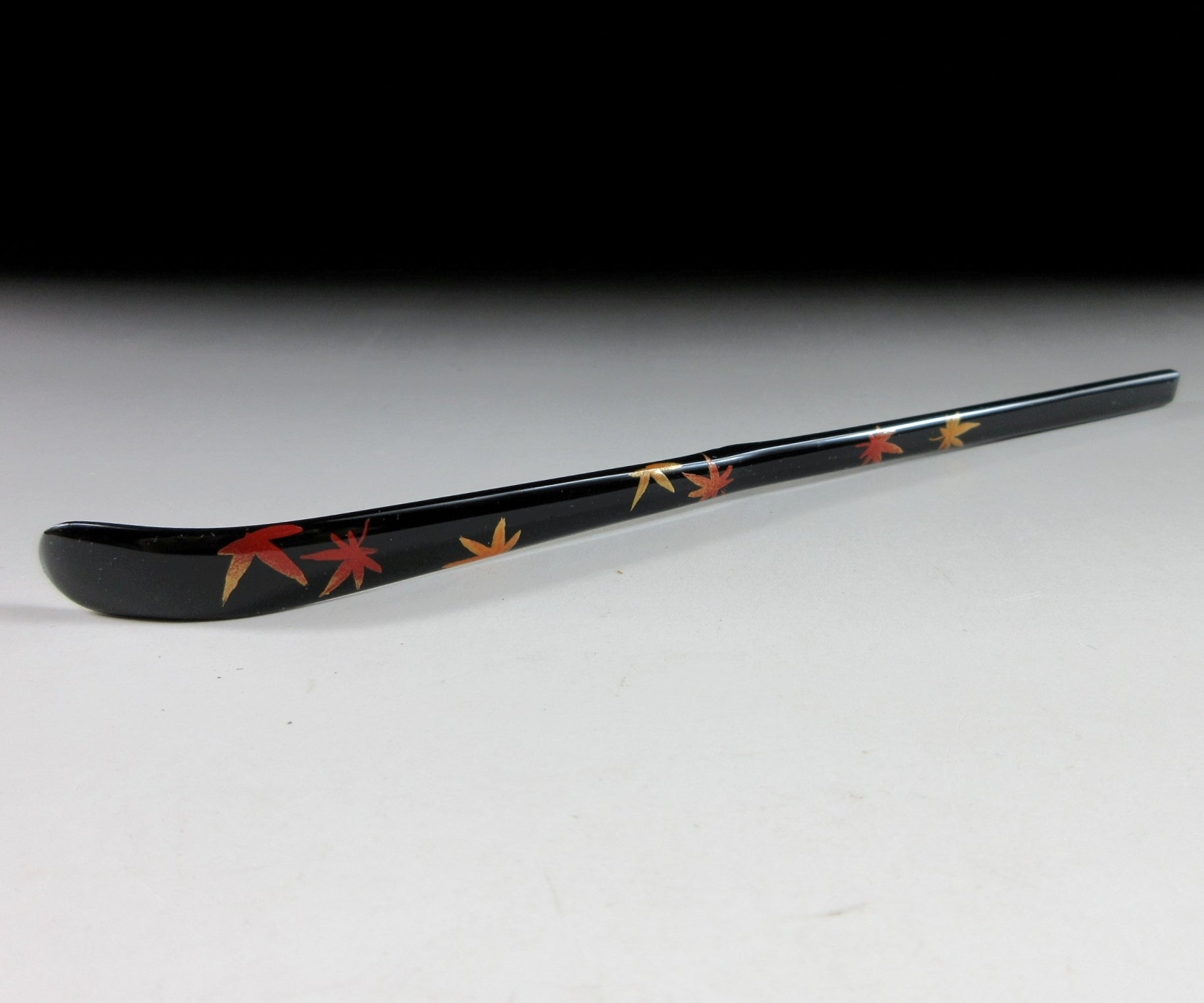 This listing is for a lacquered Takayama bamboo chashaku. Chashaku are an essential item for traditional Japanese tea ceremony, they are used for the measuring and preparation of matcha tea. The back of the chashaku in this listing is coated in black lacquer decorated with a ‘momiji’ pattern, whilst the front maintains a natural finish. Momiji leaves have been depicted in Japanese art, poetry, and literature for thousands of years. Many traditional Japanese works of art and poems are about the cool wind gently blowing fresh green kaede leaves in summer, or the falling of maple leaves in late autumn. This piece is ideal for autumn tea practice and comes with its original paper storage box.
