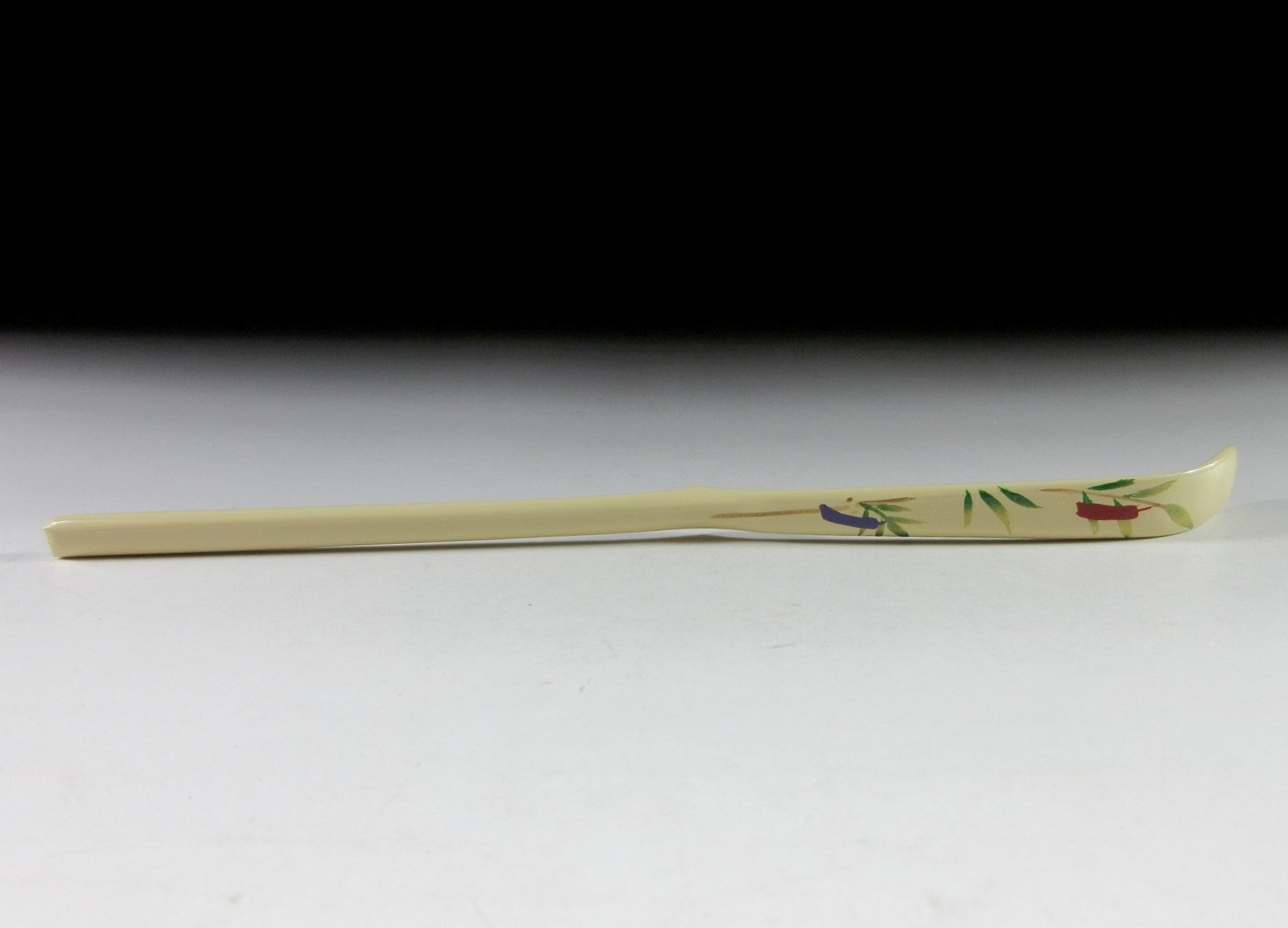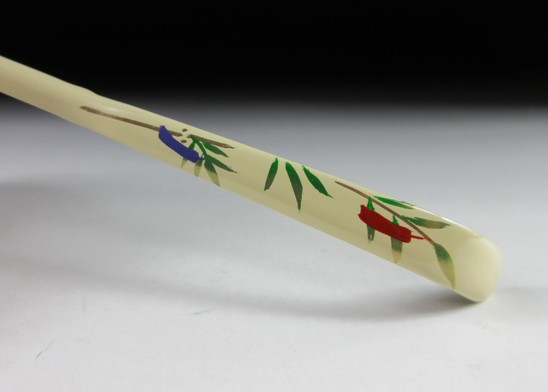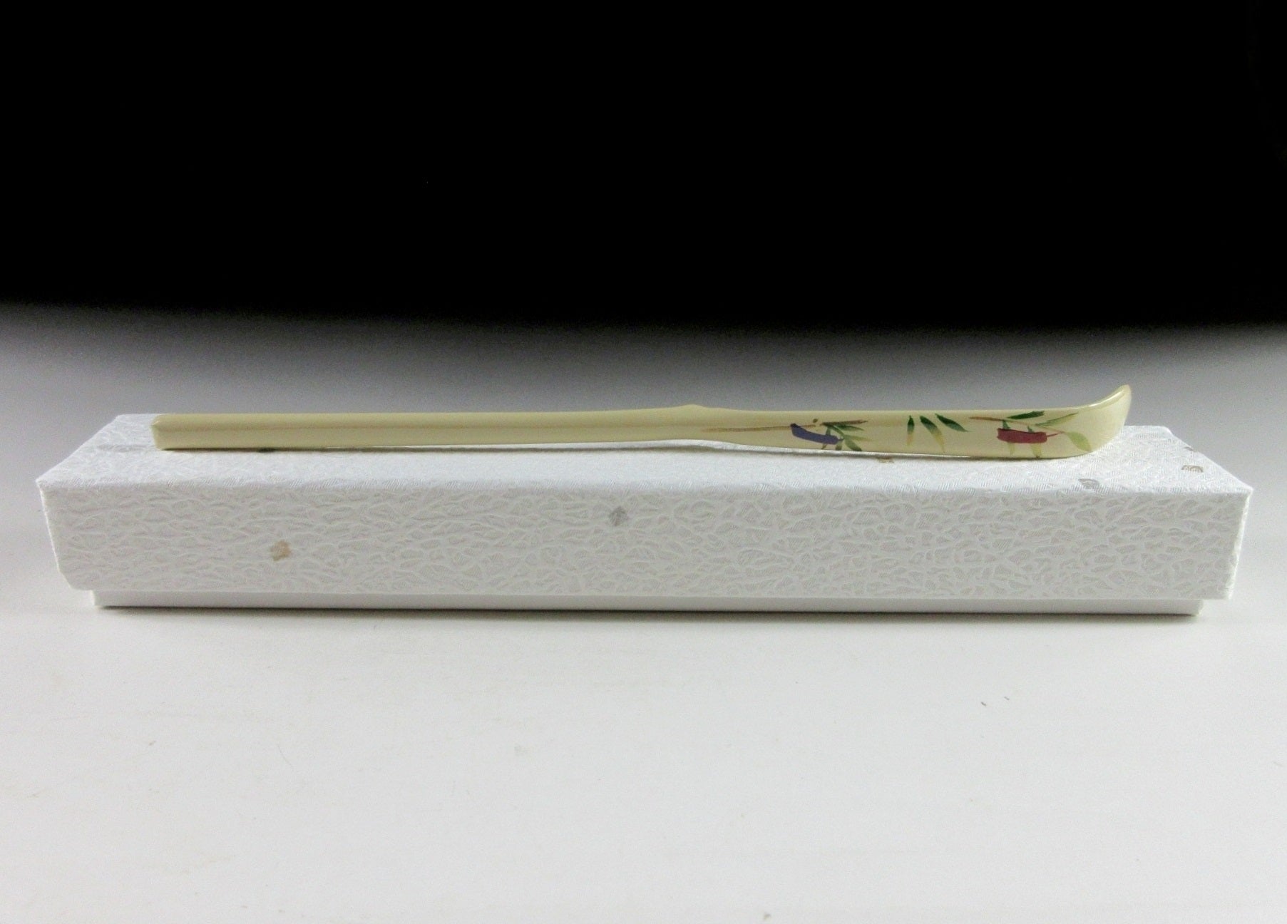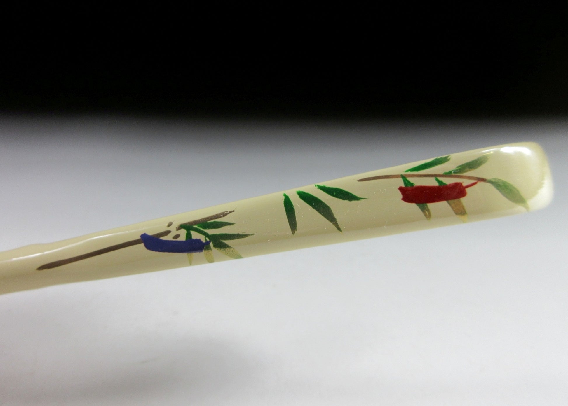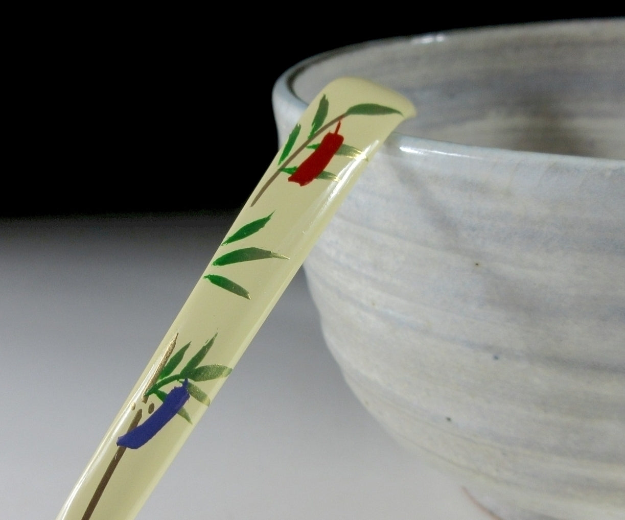 This listing is for a lacquered Takayama bamboo chashaku. Chashaku are an essential item for traditional Japanese tea ceremony, they are used for the measuring and preparation of matcha tea. The back of the chashaku in this listing is coated in light coloured lacquer decorated with a ‘tanabata’ pattern, whilst the front maintains a natural finish. Tanabata is the annual star festival held on either July or August 7th depending on the region. During this festival people write wishes on colourful strips of paper and hang them from bamboo branches. If the skies are clear and it doesn’t rain that night it is said that the wishes will come true. This piece is ideal for summer tea practice and comes with its original paper storage box.