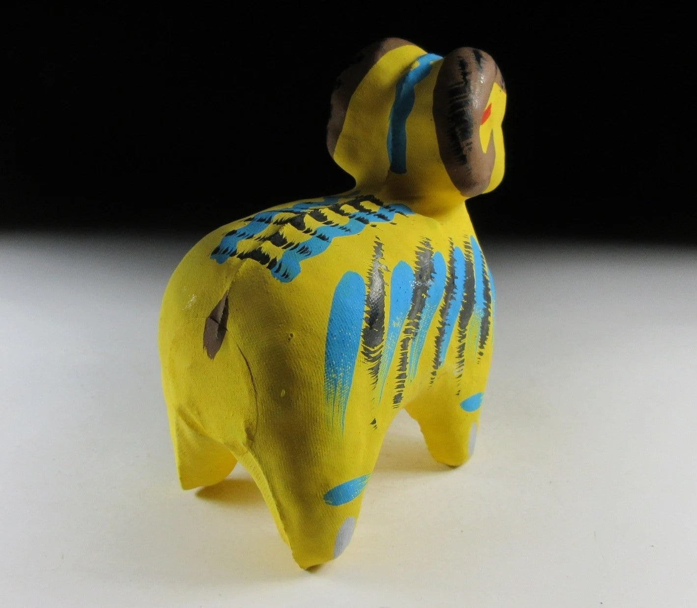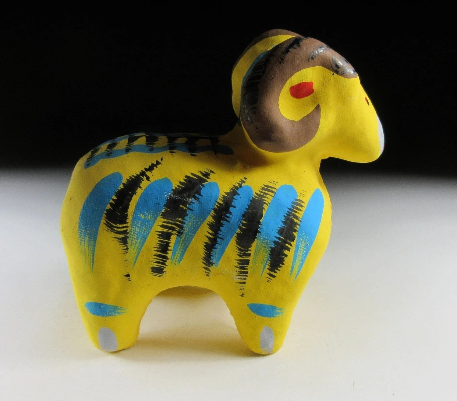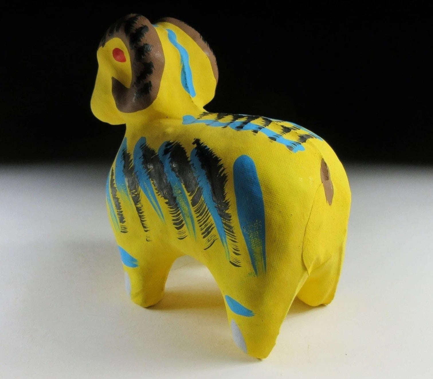This listing is for a papier mâché oku hariko ram made around 20 years ago by Takehisa Tada. Oku hariko are a type of folk toy from the Oku district in Okayama Prefecture. Oku hariko have been produced since the Edo period and are made of recycled newspaper and coated in crushed oyster shell powder called gofun. Once the base is dried each hariko ram is hand-painted and trimmed with blue and black stripes. The ram in this listing is hollow and has a reasonably hard outer frame. Despite his gruff appearance he’s actually a refined man with discerning tastes. He can be found roaming the fields, occasionally stopping to smell the flowers....and then eating them. His claim to fame is having his own 2003 edition postage stamp which was designed to commemorate the Year of the Sheep.