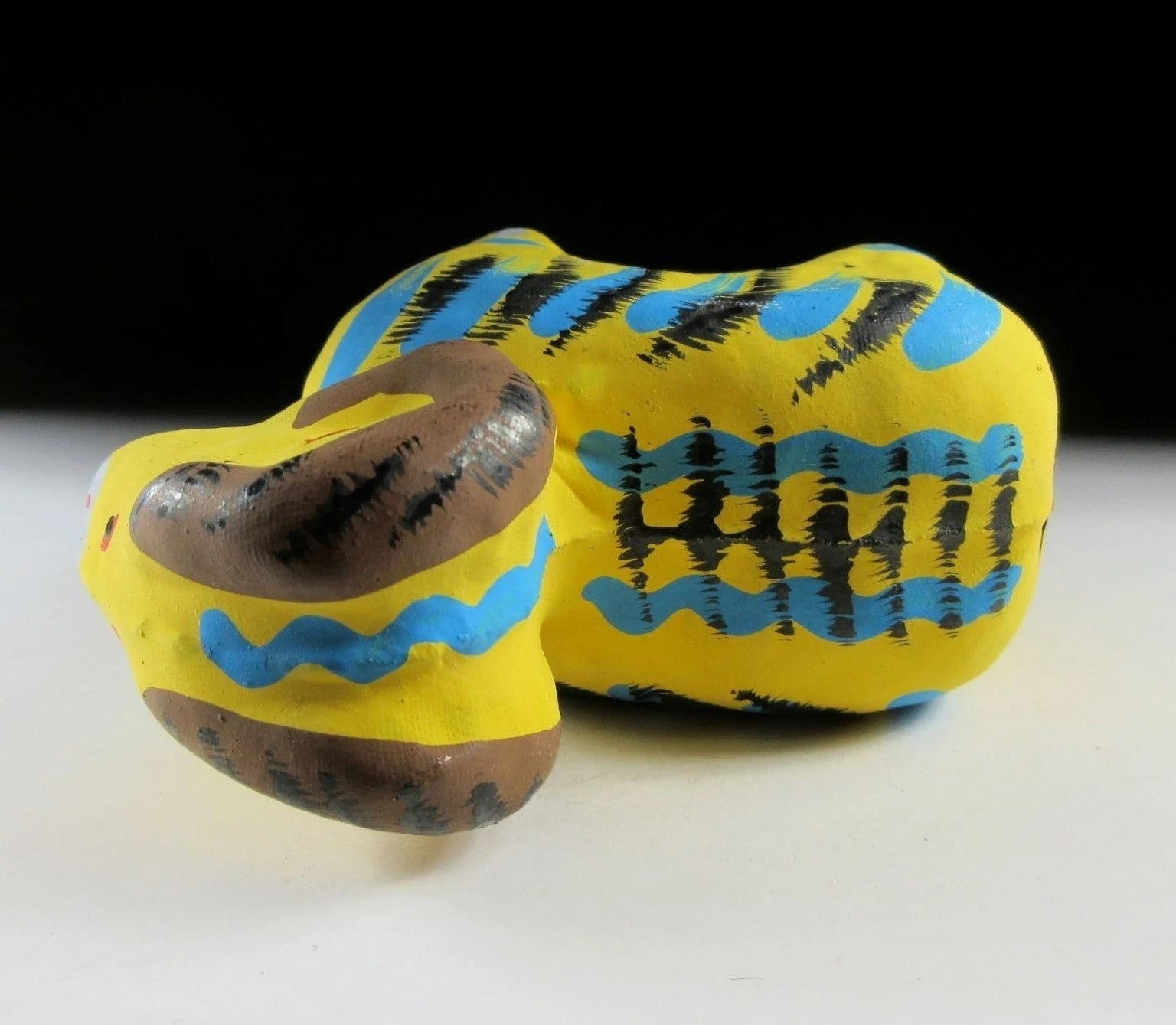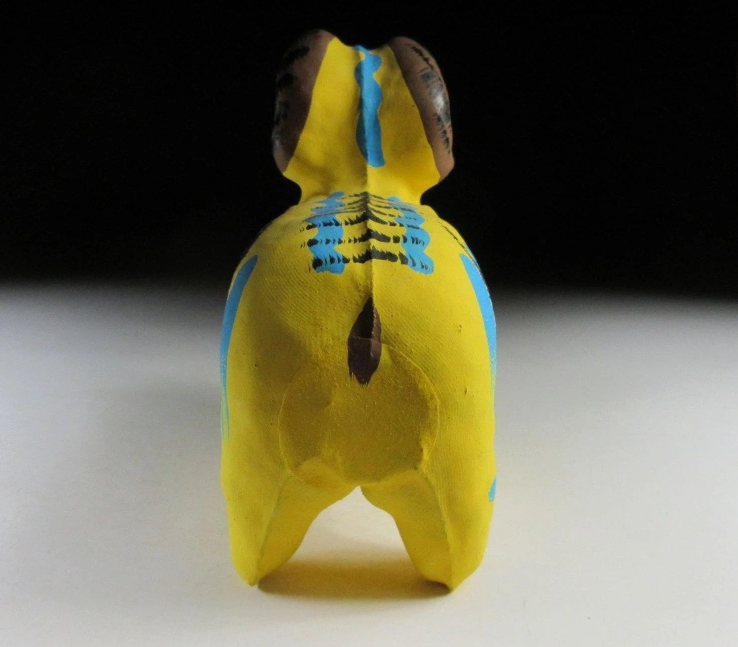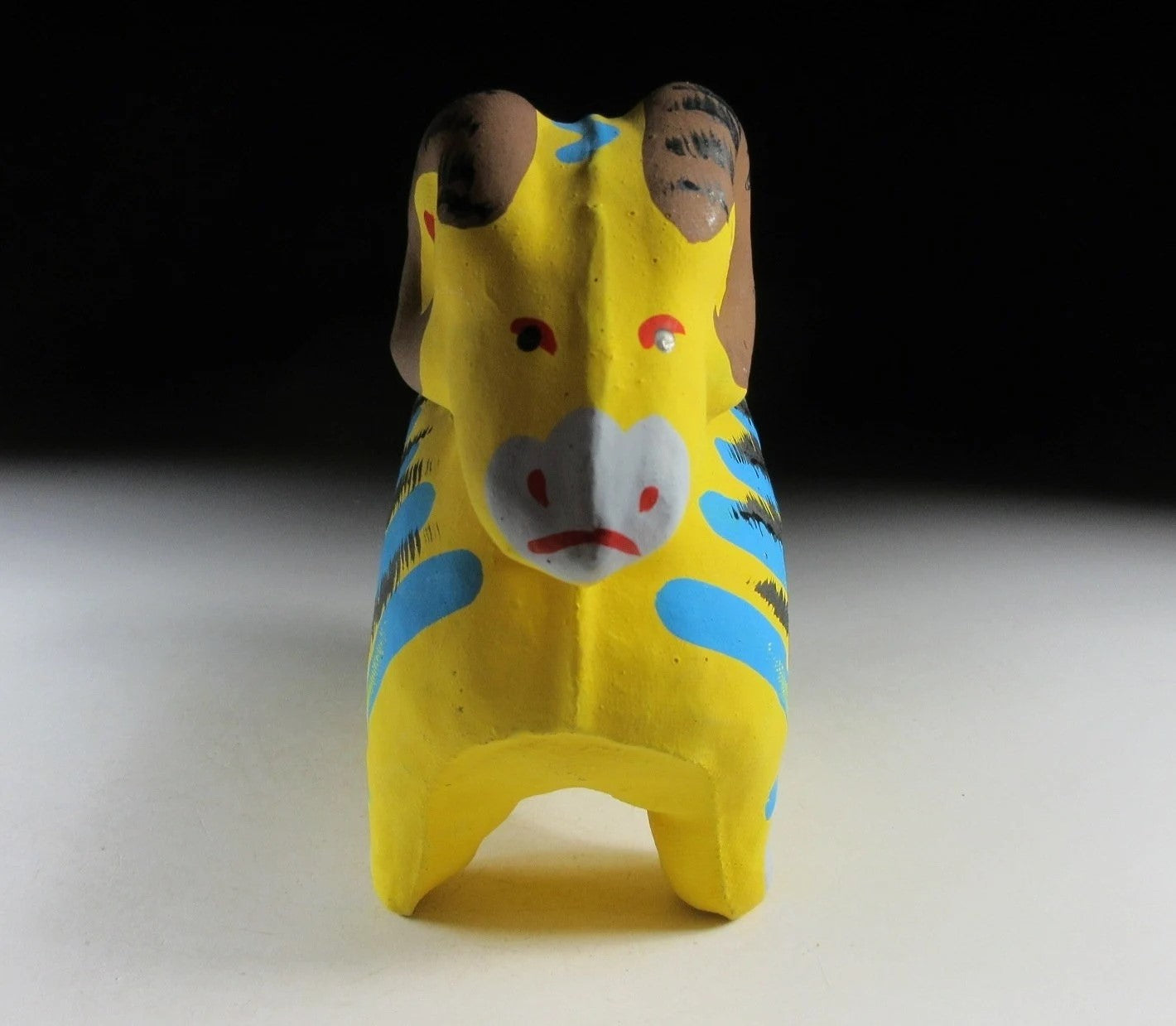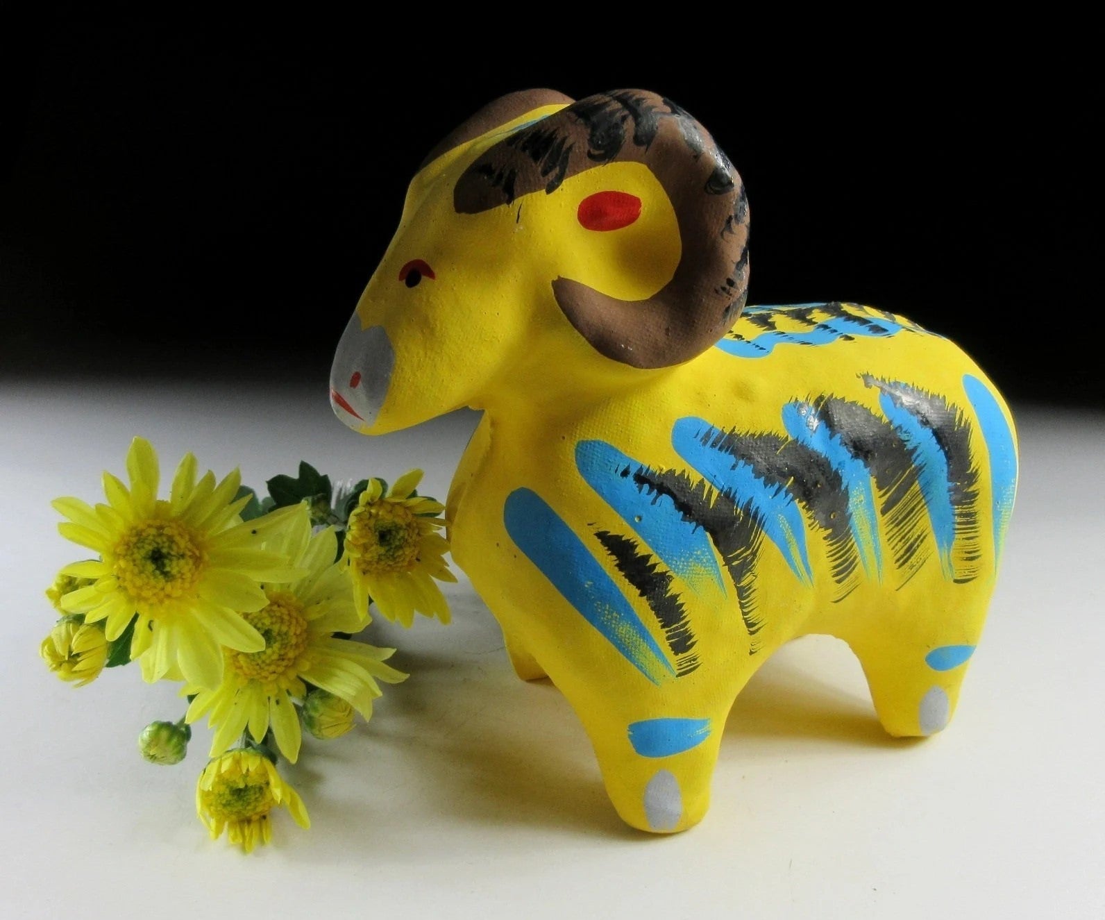 This listing is for a papier mâché oku hariko ram made around 20 years ago by Takehisa Tada. Oku hariko are a type of folk toy from the Oku district in Okayama Prefecture. Oku hariko have been produced since the Edo period and are made of recycled newspaper and coated in crushed oyster shell powder called gofun. Once the base is dried each hariko ram is hand-painted and trimmed with blue and black stripes. The ram in this listing is hollow and has a reasonably hard outer frame. Despite his gruff appearance he’s actually a refined man with discerning tastes. He can be found roaming the fields, occasionally stopping to smell the flowers....and then eating them. His claim to fame is having his own 2003 edition postage stamp which was designed to commemorate the Year of the Sheep.