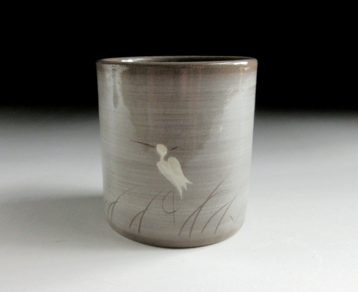 This listing is for an Utsutsugawa-ware kensui and futaoki set made around 20 years ago by Takemura Rizaemon XII. Kensui are intended for use during the tea ceremony, they hold used water after tea utensils have been rinsed off, whilst a futaoki functions as a lid rest. The lid of the kama is placed on the futaoki when hot water needs to be drawn from the kettle. The bamboo water ladle rests there up until the lid of the kama is removed. The kensui and futaoki in this listing are wheel-thrown and made of high-fired stoneware clay. The exterior of both pieces is brushed with white slip, and the front is decorated with a hand-painted depiction of a white egret standing in long grass. The signature of the potter can be found on the bottom of the kensui, and they come with a paper storage box.
