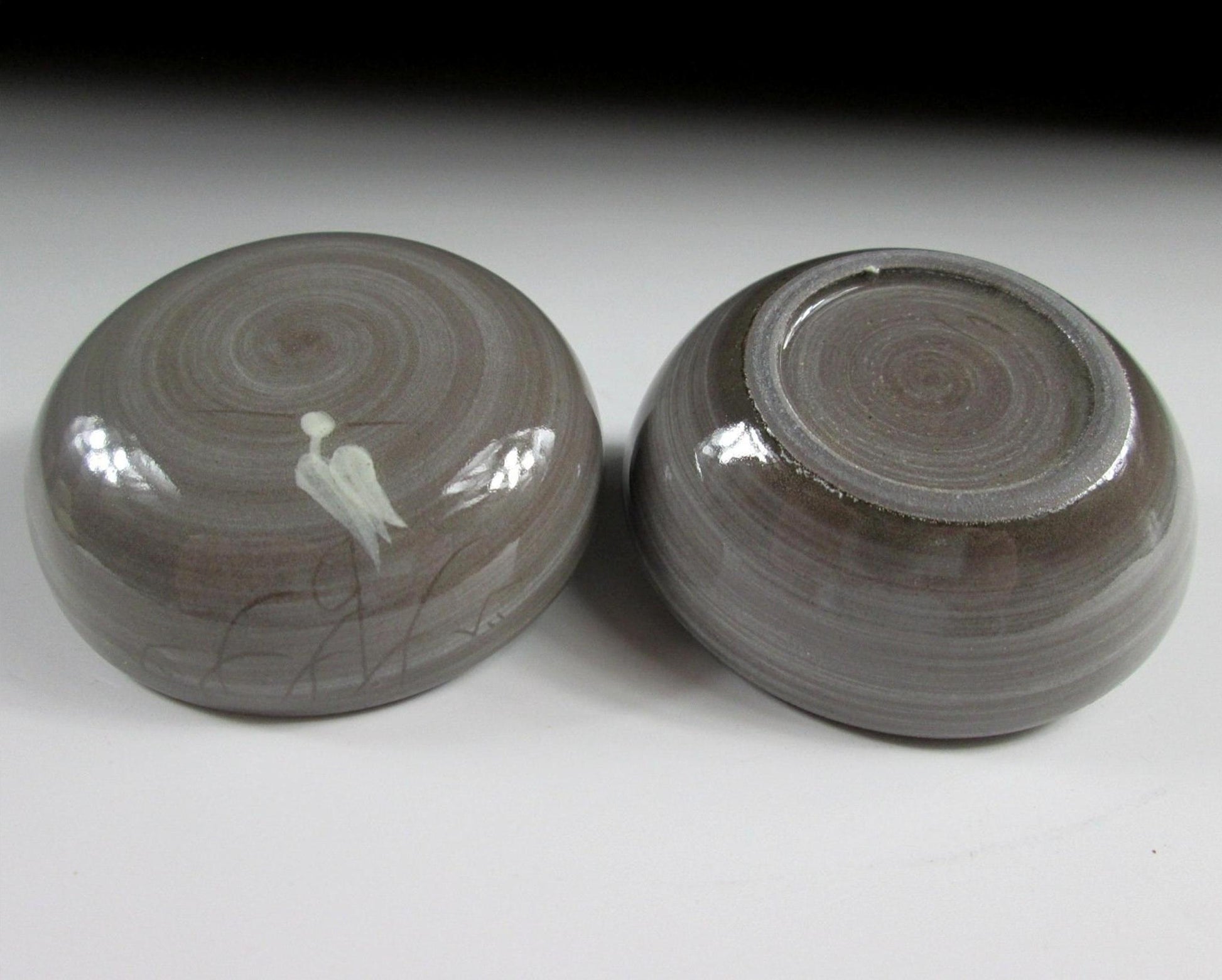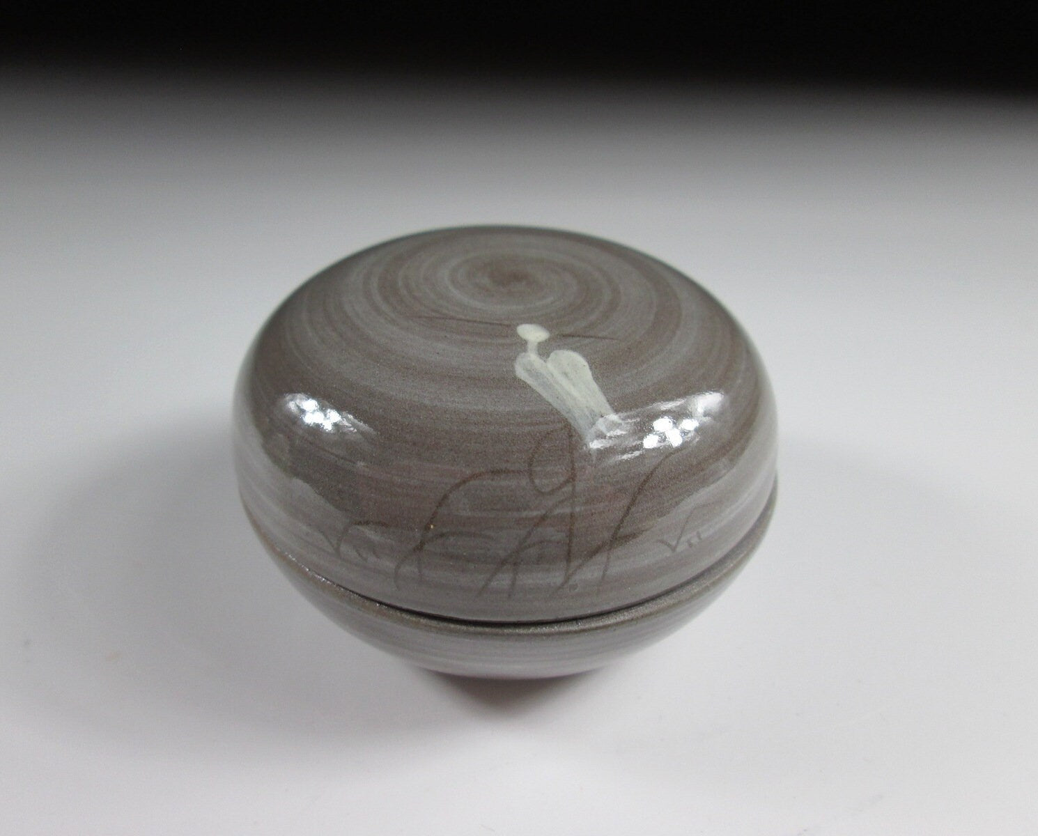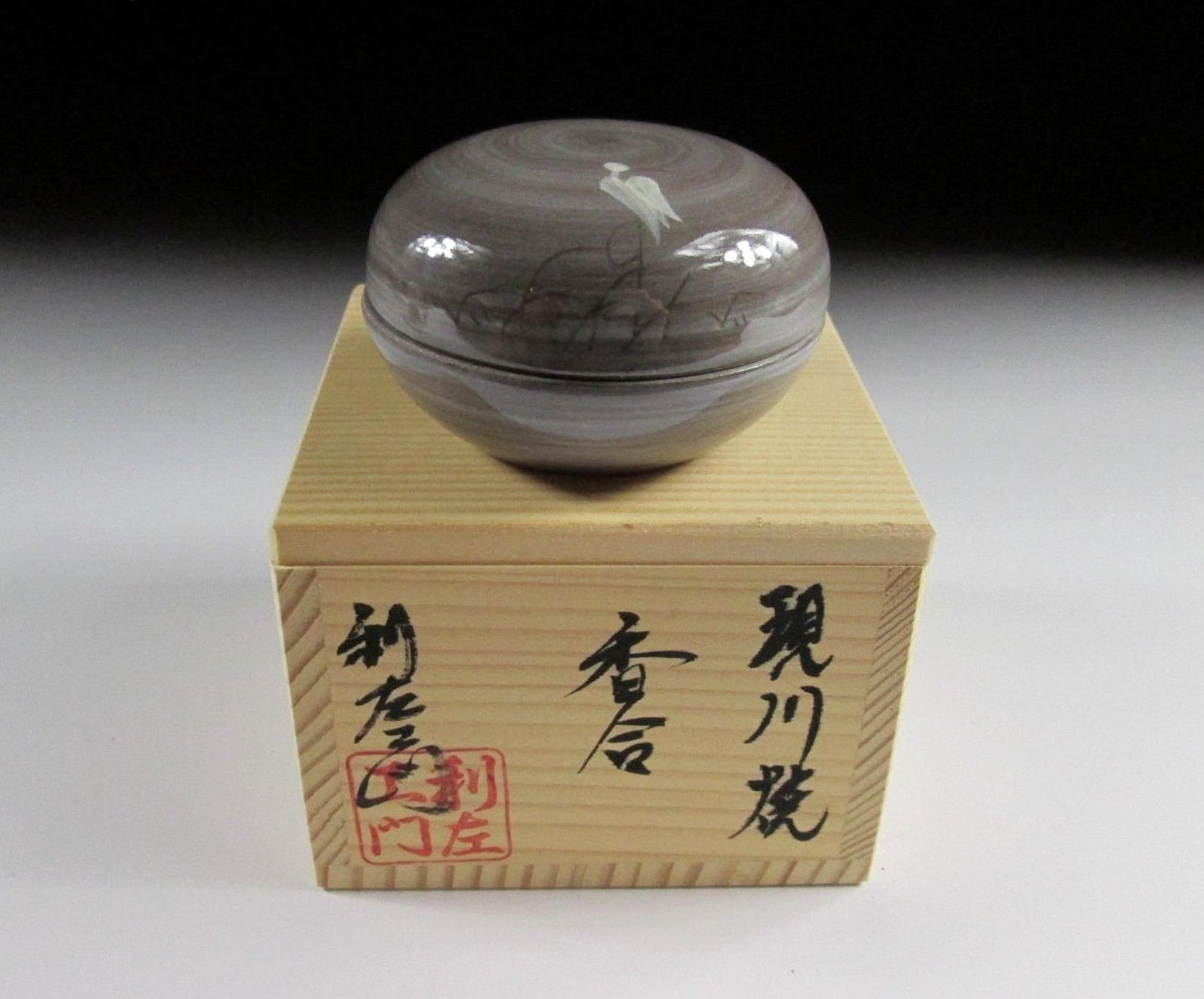 This listing is for an Utsutsugawa-ware kogo made around 20 years ago by Takemura Rizaemon XII. It is wheel-thrown, and the exterior is decorated with very faint Hakeme brushwork and a hand-painted depiction of a white egret. This piece is suitable for holding both kneaded and woodchip type incense, although pottery kogo are typically used for kneaded incense during the cooler months. It comes with its original signed wooden storage box, as well as a Japanese language profile about the kiln and Utsutsugawa-ware.
