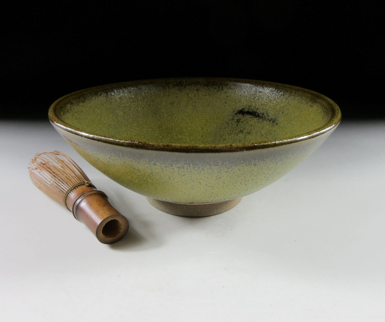 This listing is for a Tanba-ware hira chawan made around 10 years ago and signed ‘Shu’. It is wheel-thrown and the flat hira type used during the summer season. Hira chawan are shallow bowls with low sides designed to cool tea down faster. The bowl in this listing is made of high-fired stoneware and coated in yellowish ‘soba glaze’. The signature of the potter can be found on the bottom, sorry no box for this one. *PLEASE NOTE THAT THE CHASEN TEA WHISK IS NOT INCLUDED.