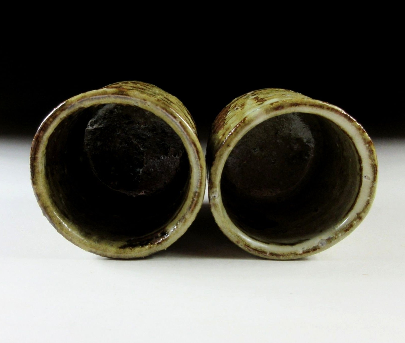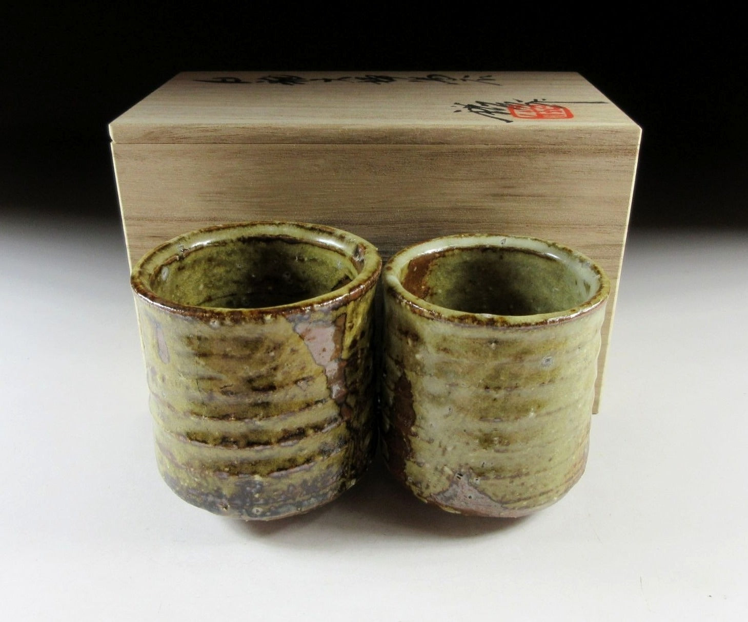 This listing is for a pair of Tanba-ware yunomi tea cups made around 20 years ago. They are wheel-thrown and brushed with iron glaze, and natural ash has dripped down from the rim. Also these cups are what we call meoto style, meaning they are two different sizes and often referred to as a husband and wife pair. Both cups are sturdy and well suited to daily use. They come with their original signed wooden storage box.