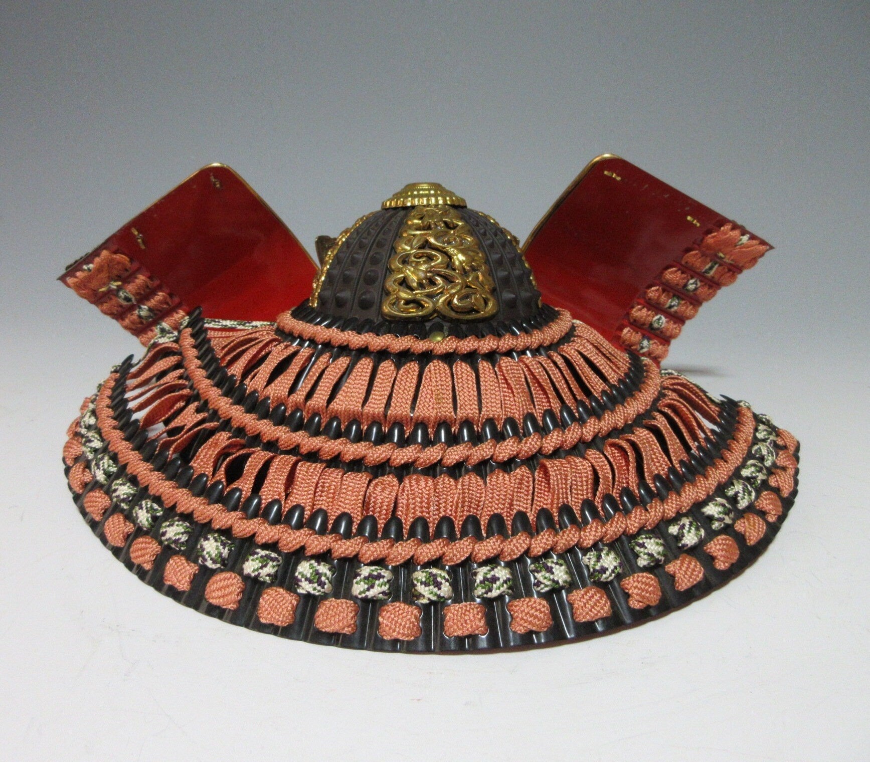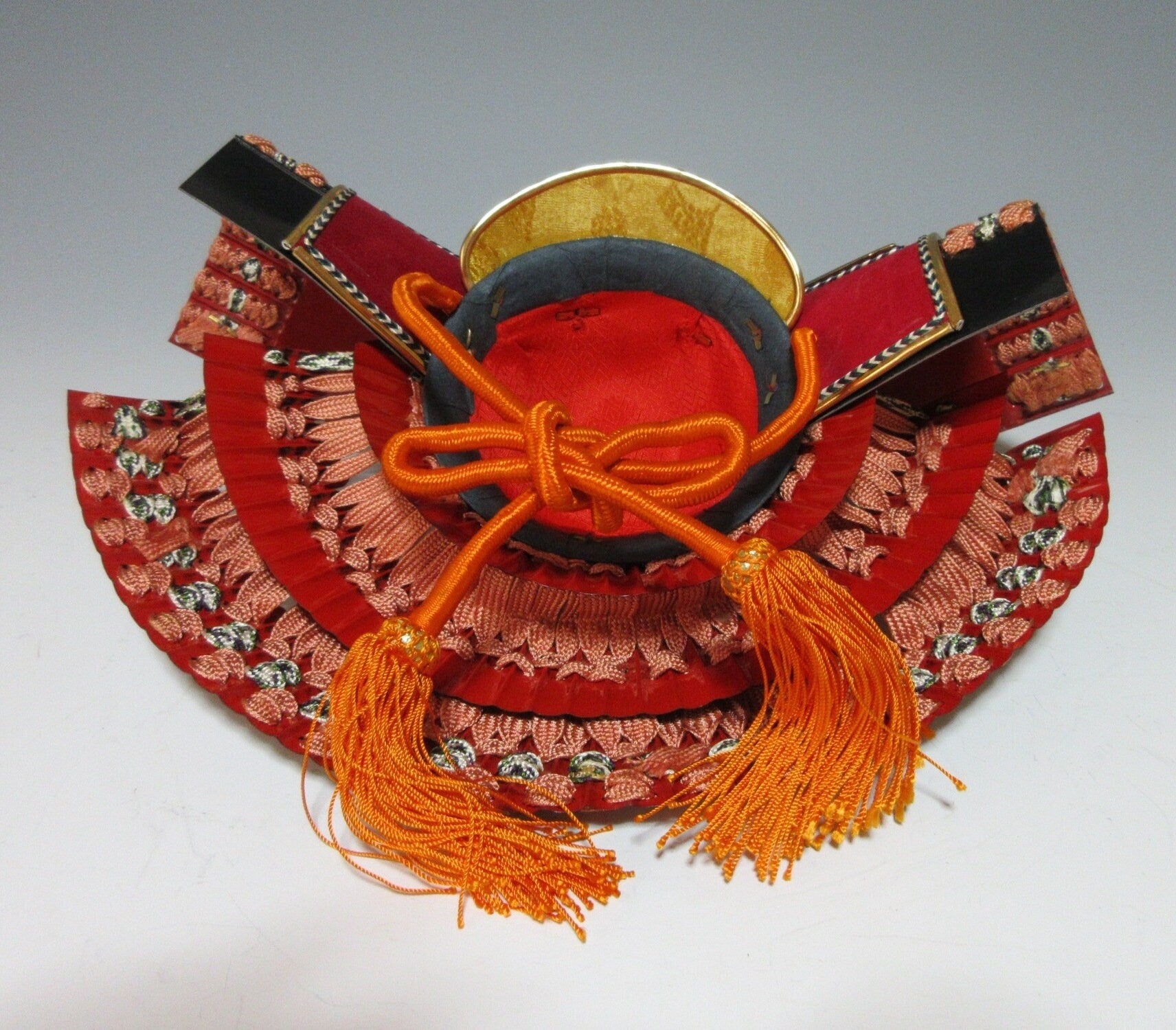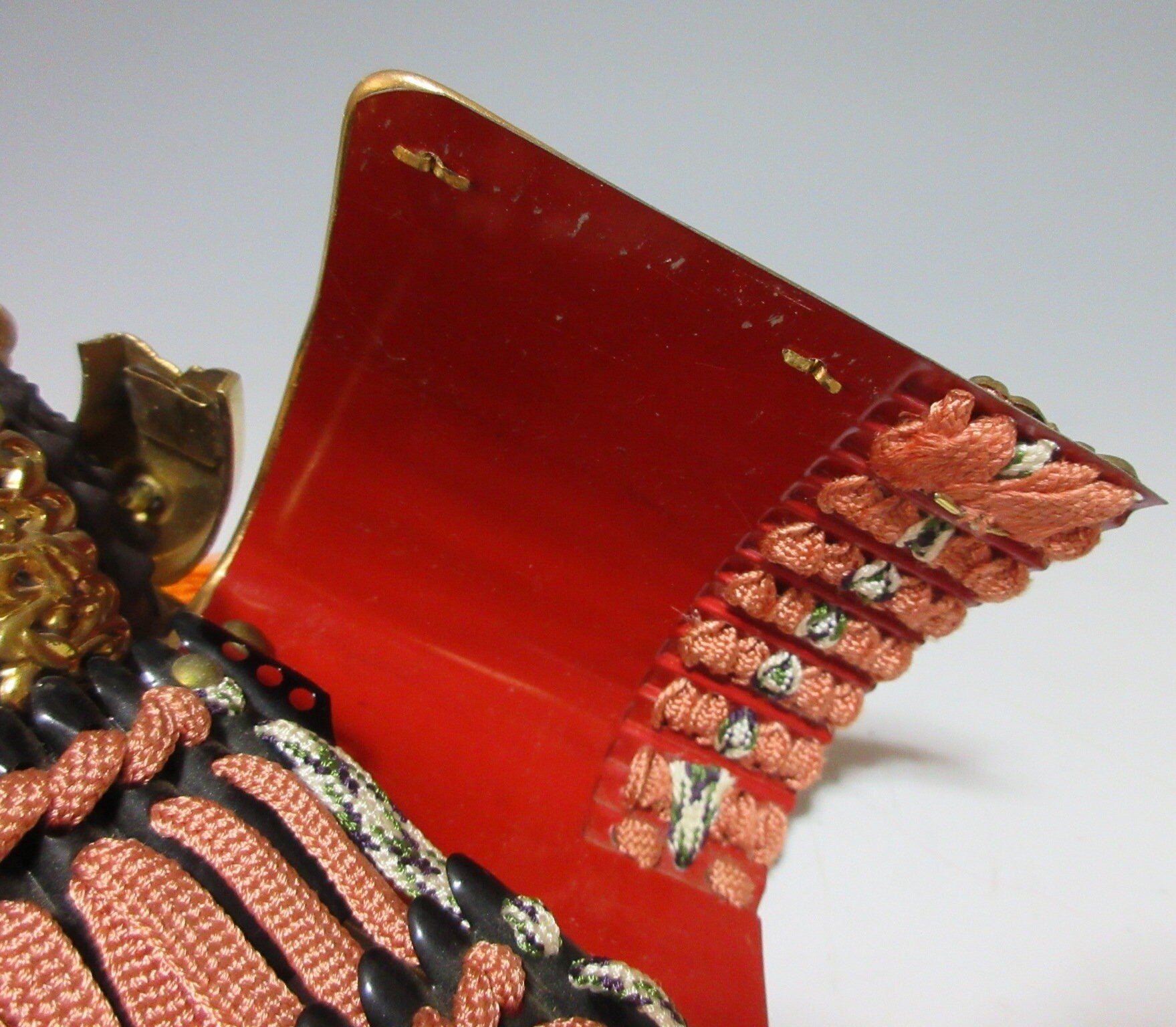 This listing is for a vintage samurai warrior Kabuto helmet which is typically displayed during the annual Children’s Day celebration. It was made 40-50 years ago and comes complete with a beautiful black lacquered box. It is a carefully crafted piece, complete with metal trim and a small golden shishi that attaches to the top. Salmon coloured silk has been woven around the back of the helmet, and the set comes complete with a mounting stand. Several parts are detached for easy storage, this particular set has been very well taken care of.