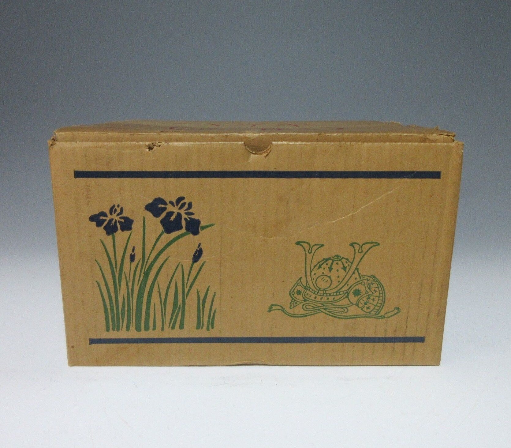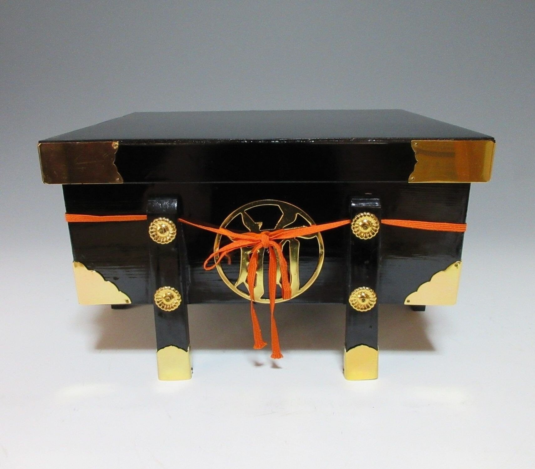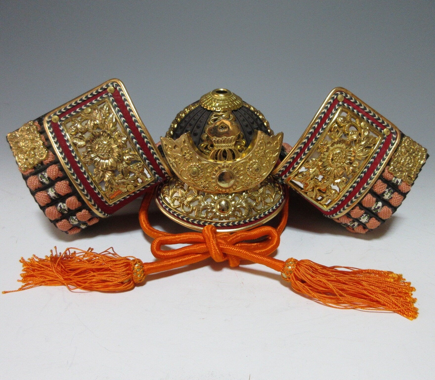 This listing is for a vintage samurai warrior Kabuto helmet which is typically displayed during the annual Children’s Day celebration. It was made 40-50 years ago and comes complete with a beautiful black lacquered box. It is a carefully crafted piece, complete with metal trim and a small golden shishi that attaches to the top. Salmon coloured silk has been woven around the back of the helmet, and the set comes complete with a mounting stand. Several parts are detached for easy storage, this particular set has been very well taken care of.