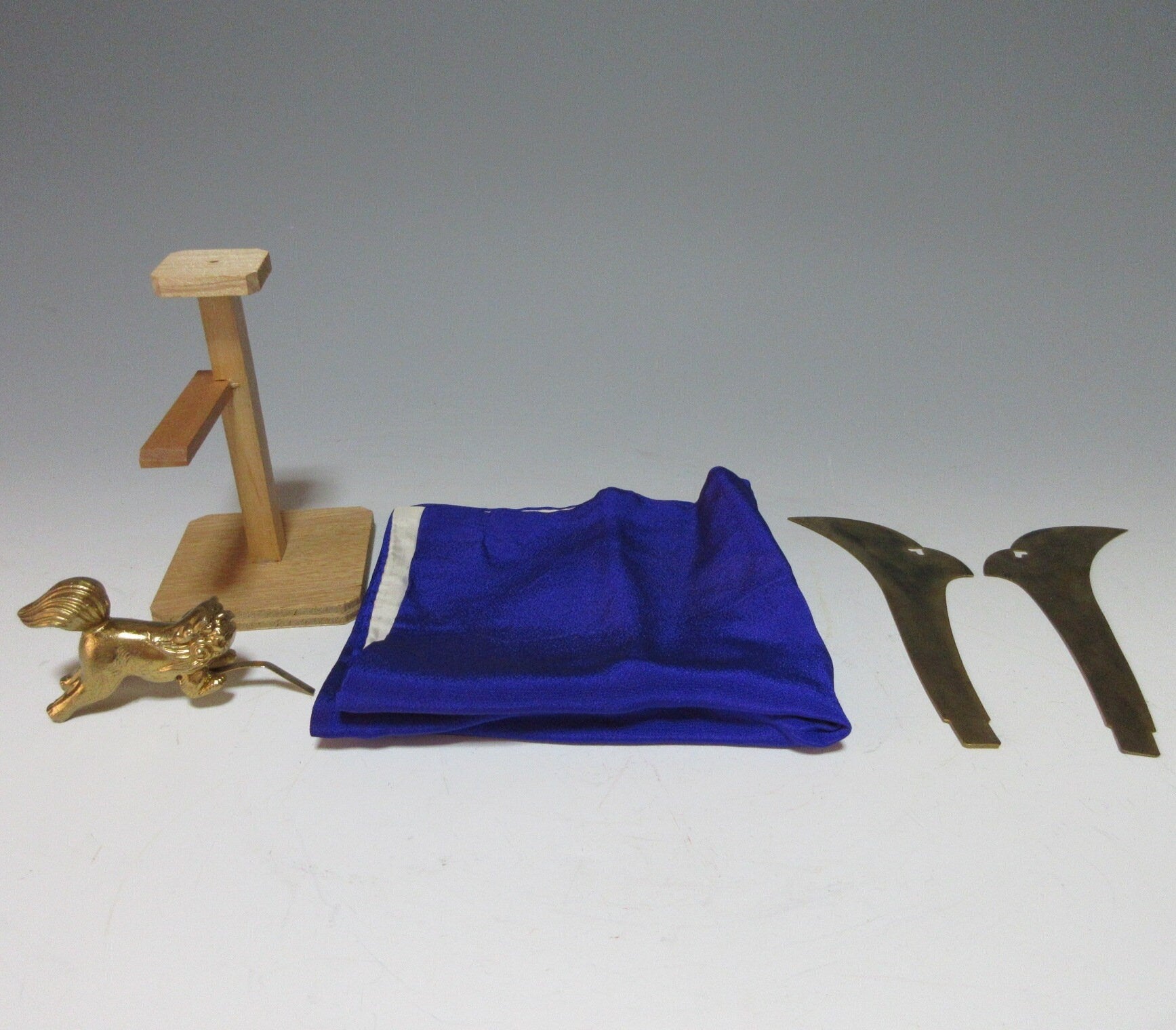 The box has light scratches/scuffing. One front leg and one of the legs on the side of the box is loose and they slide, the two at the back are a little loose as well, this doesn’t affect usage at all though. The helmet part has some dust build up, some light scratches on the red parts (pictured), patina on the “antlers” and worn gold on the bottom of the shishi. Also the outer paper box is discoloured but in good condition.